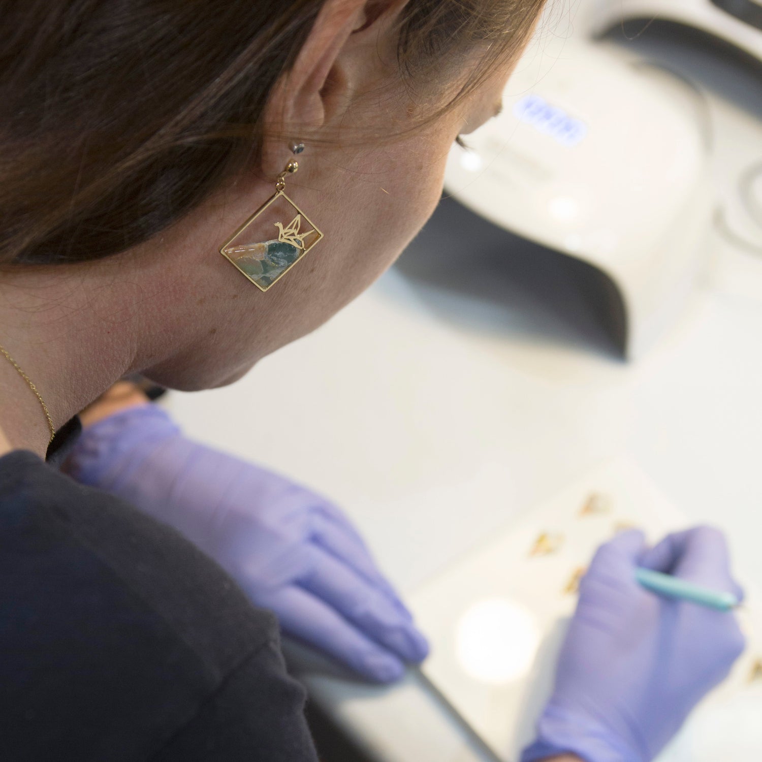 Chaque collection évolue au fil des inspirations, des gestes et des matières. Les motifs en argile polymère sont sublimés par des montures soigneusement choisies, en acier inoxydable ou en plaqué or, pour allier finesse, durabilité et éclat.