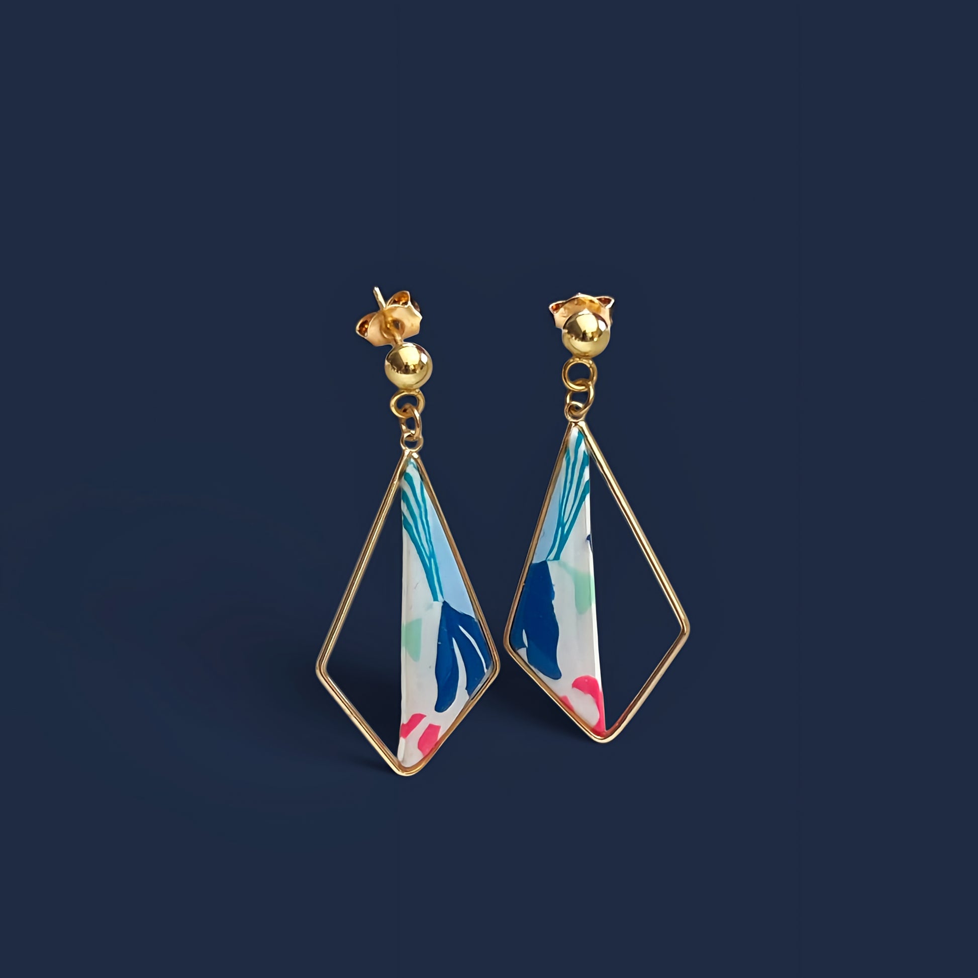 Boucles d’oreilles losanges en argile polymère, serties dans un cadre géométrique en plaqué or 18k. Les motifs abstraits dans les tons de bleu profond, blanc, vert pâle et rose corail apportent une touche artistique et contemporaine.