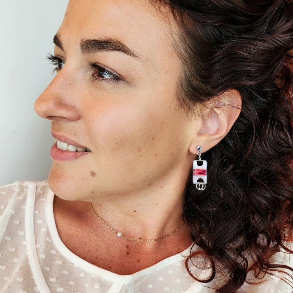 Boucles d’oreilles rectangulaires en argile polymère, aux motifs marbrés rose corail sur fond blanc, montées dans un cadre en acier inoxydable, des clous en acier inoxydable hypoallergénique et ornées de trois anneaux couleur argent.