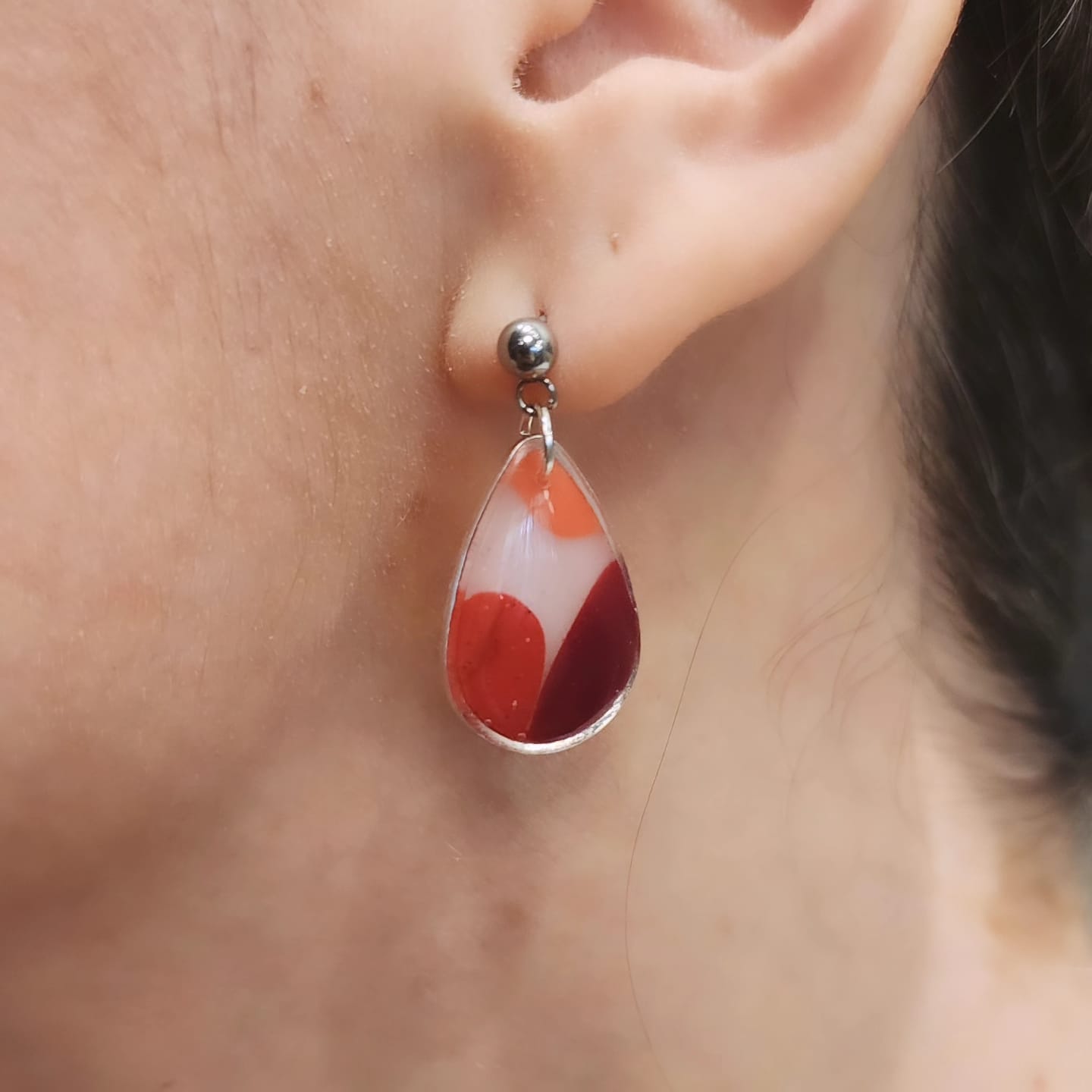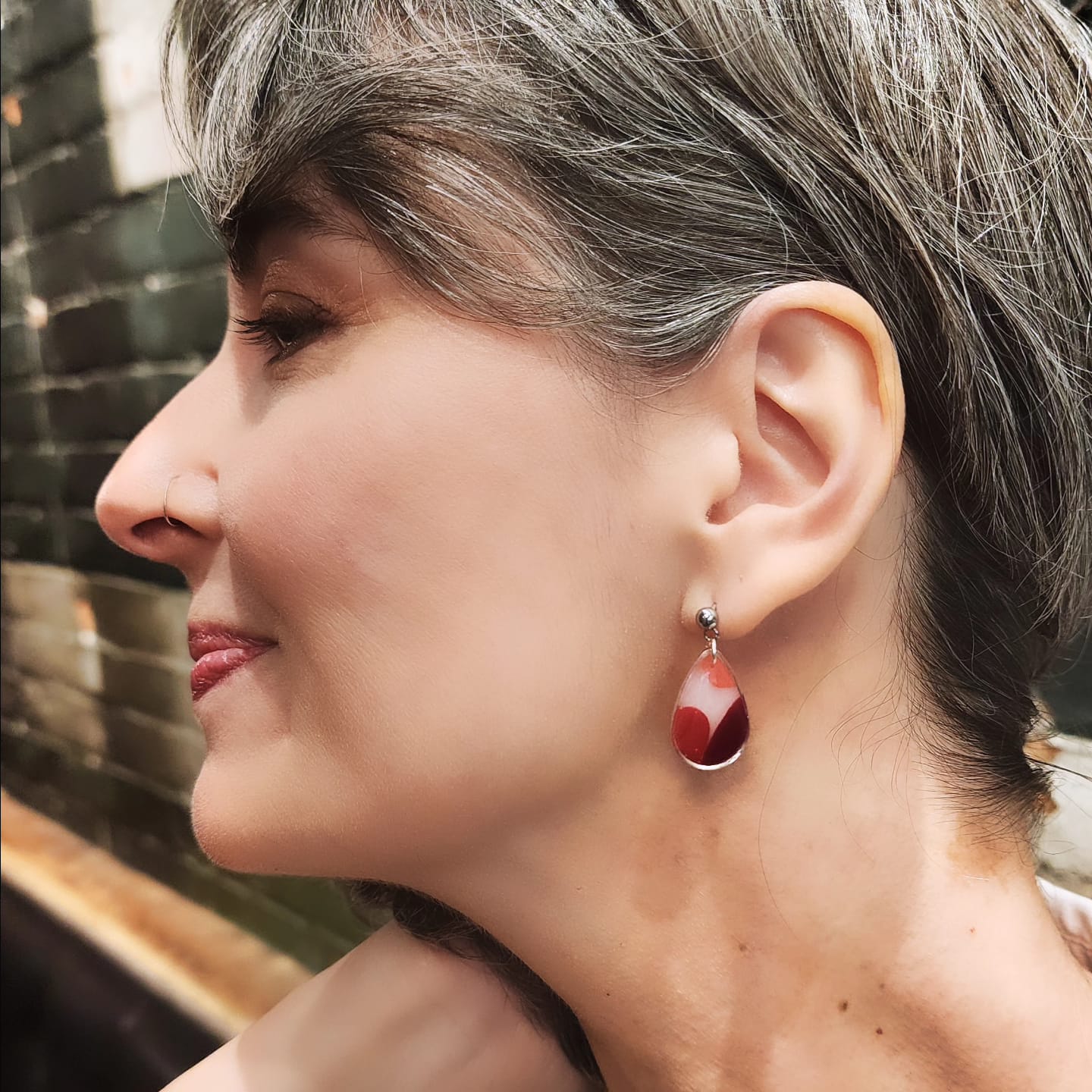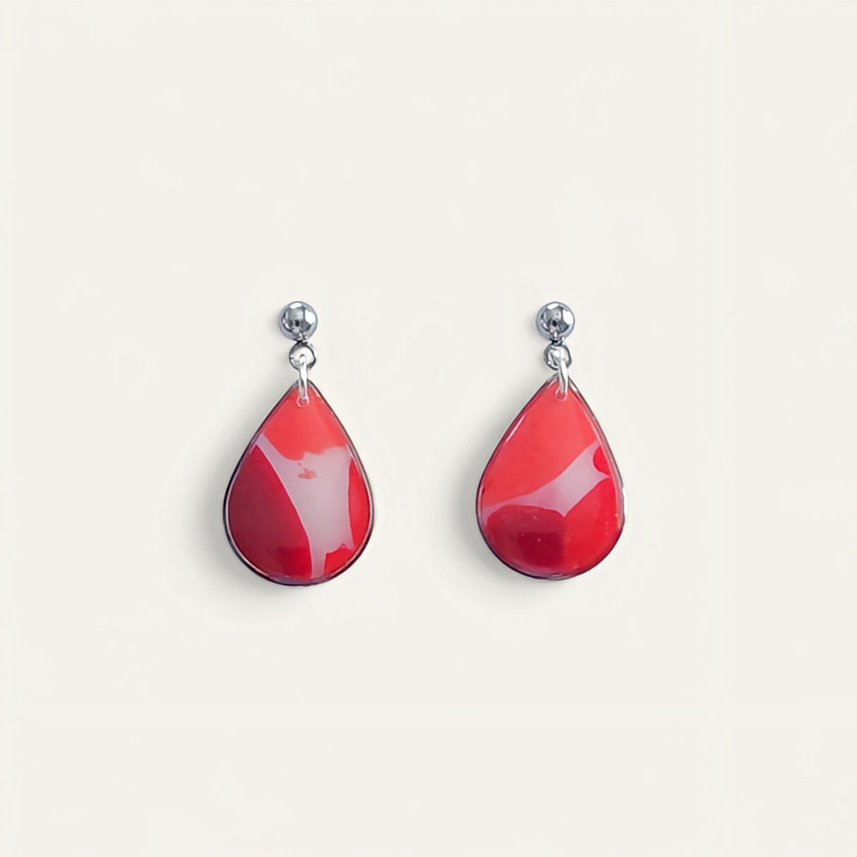 Boucles d’oreilles goutte en argile polymère marbrée rouge et rose, encadrées d’un cadre en acier inoxydable et montées sur des clous en acier inoxydable hypoallergénique.