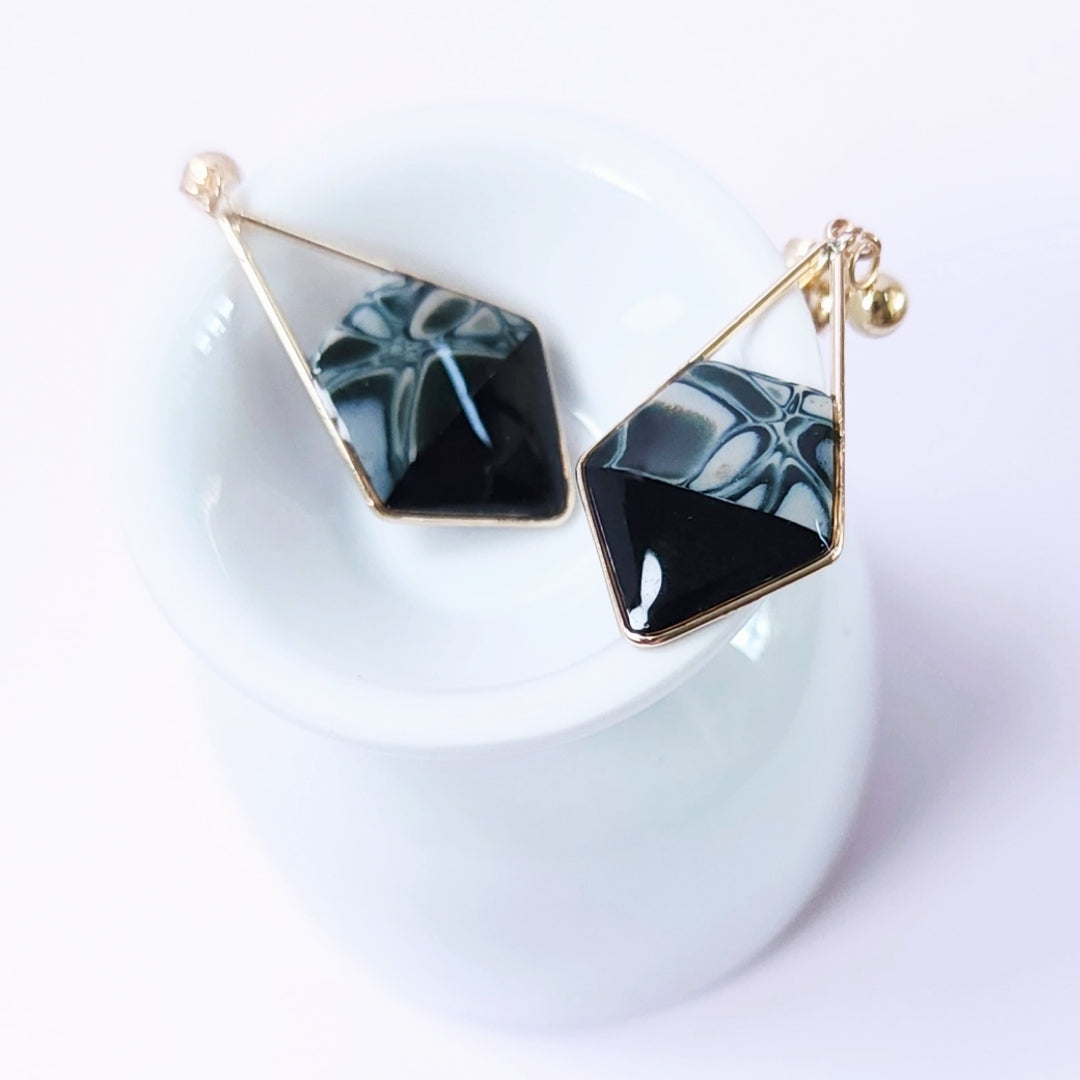Boucles d’oreilles en argile polymère, en forme de losange, ornées d’un motif marbré bleu nuit et gris. Insérées dans un cadre fin en plaqué or 18k et montées sur clous dorés en acier inoxydable hypoallergénique, elles allient modernité et raffinement.