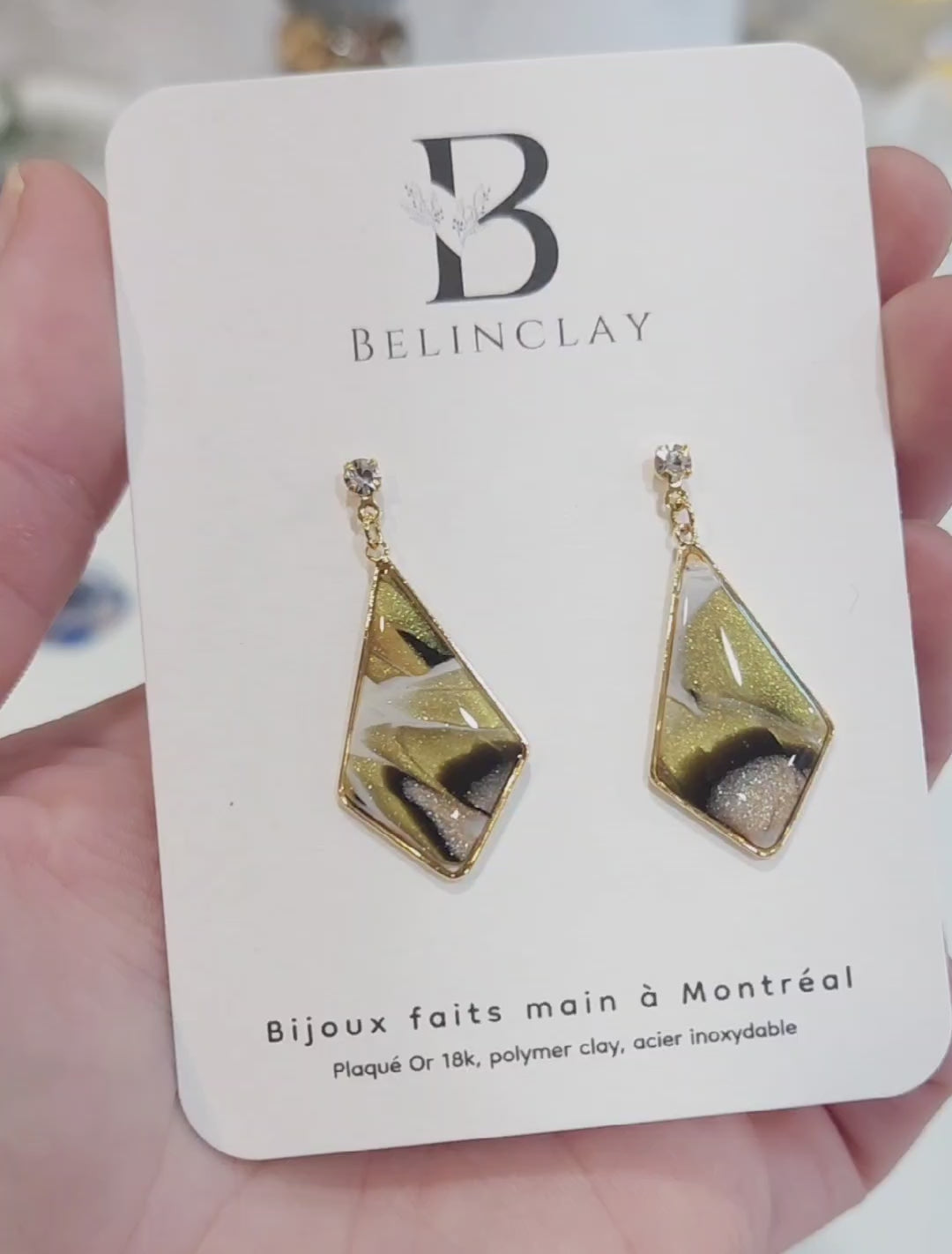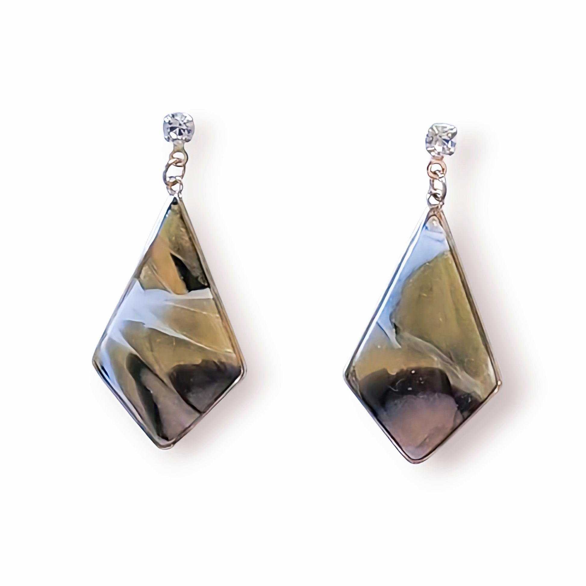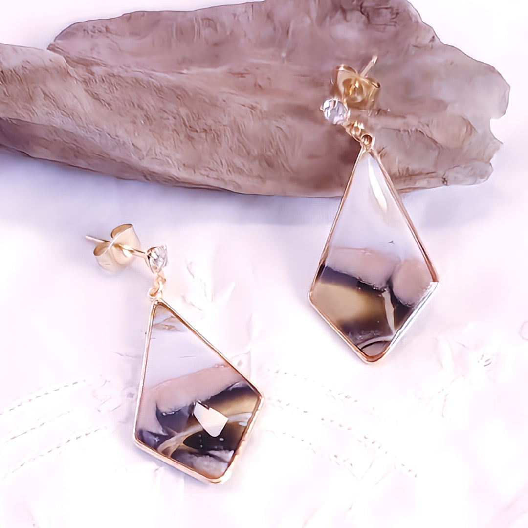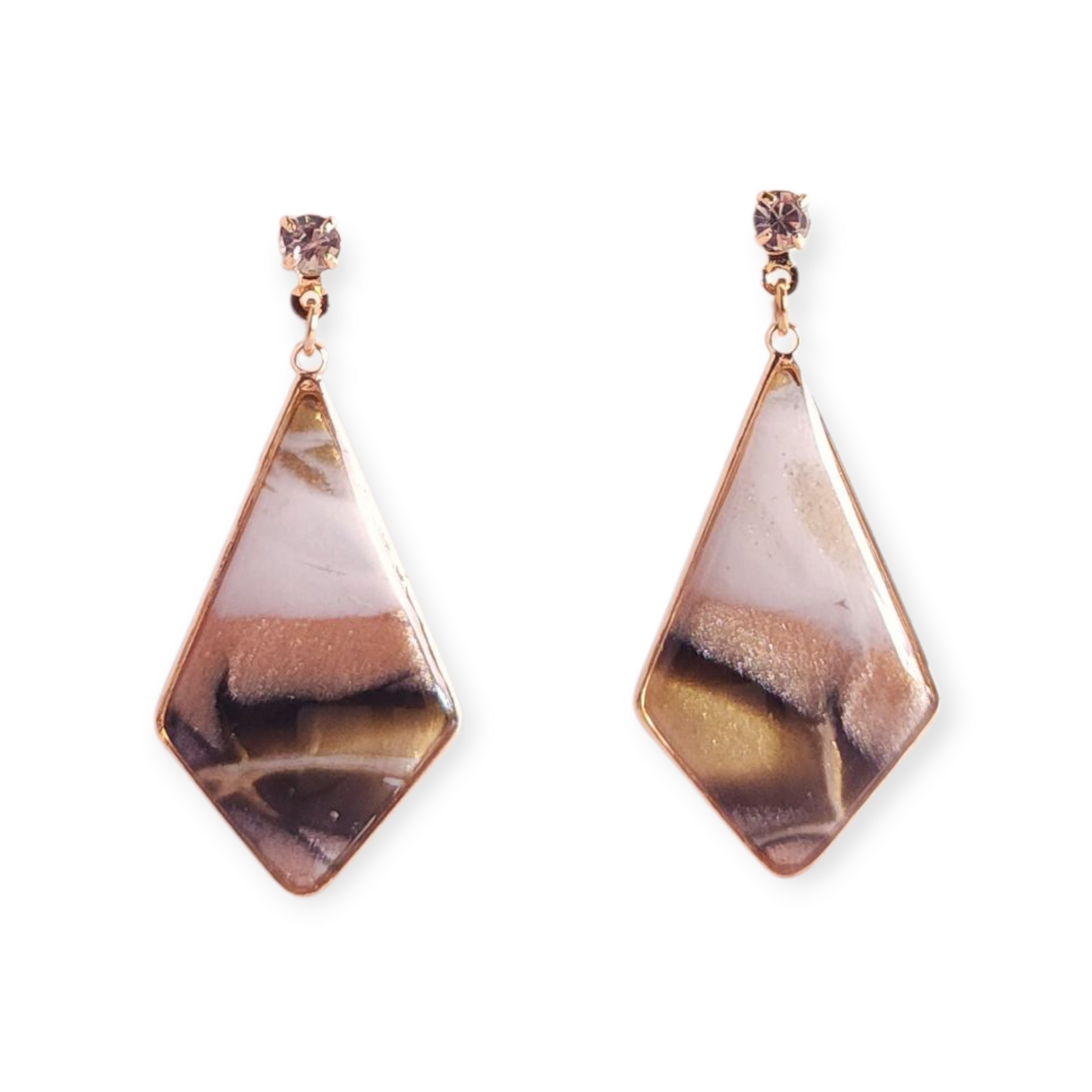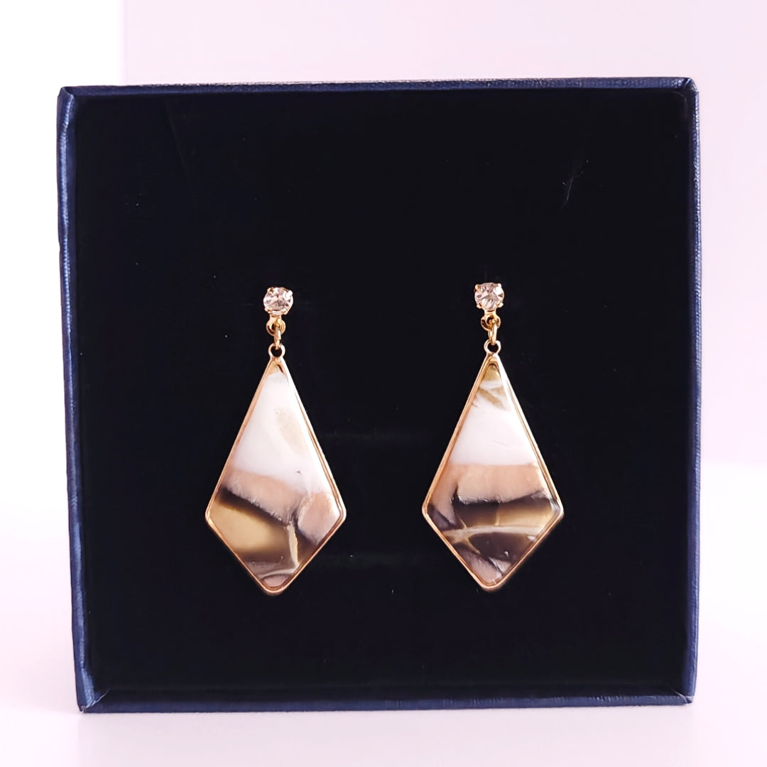Boucles d’oreilles en forme de losange, aux nuances marbrées de saumon, beige et noir profond, évoquant la richesse des tons minéraux. Montées sur clous et cadre en plaqué or 18k avec un zircon scintillant, elles offrent un style à la fois naturel et sophistiqué.