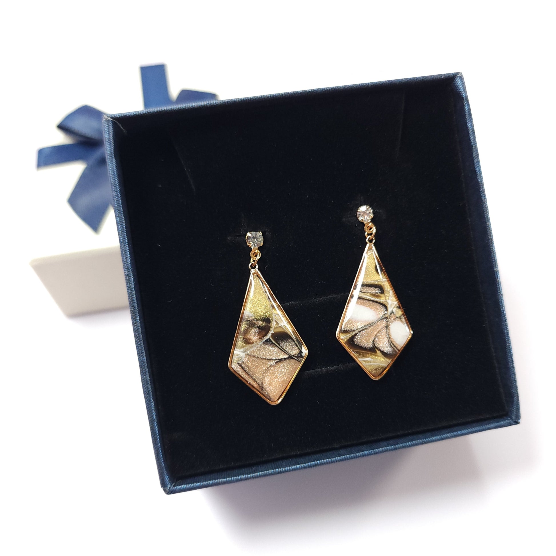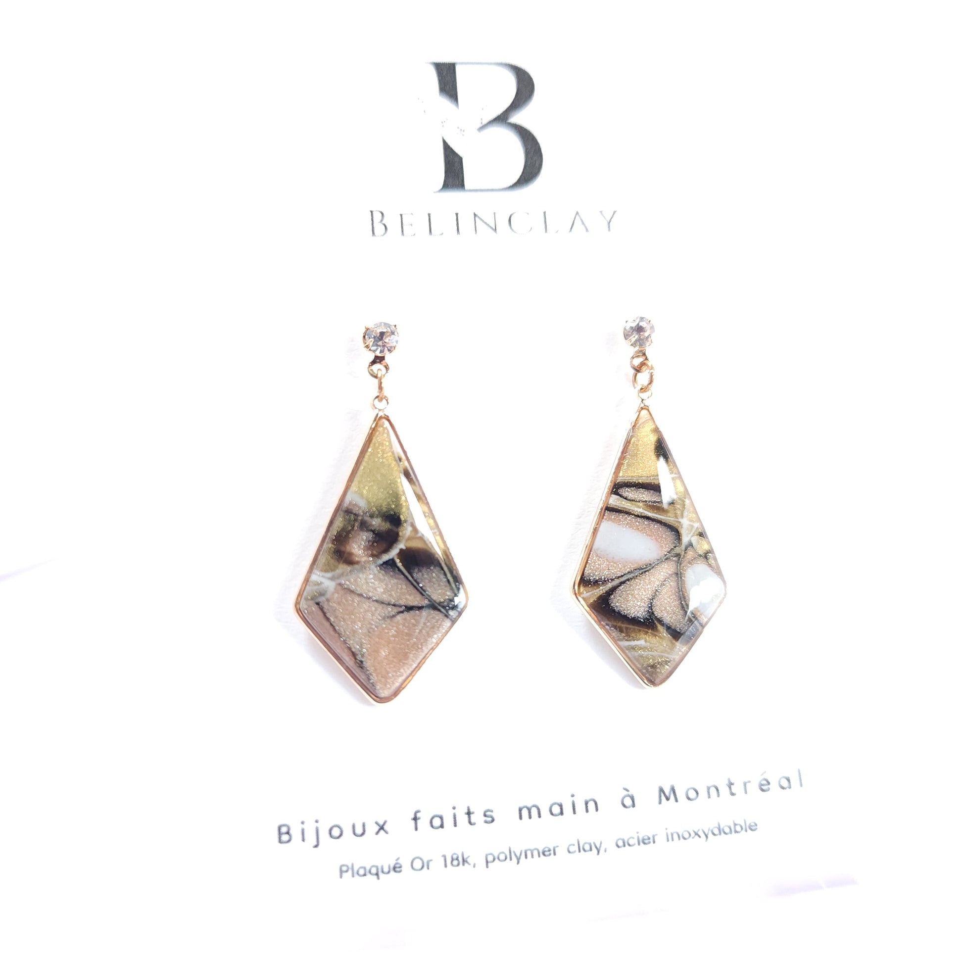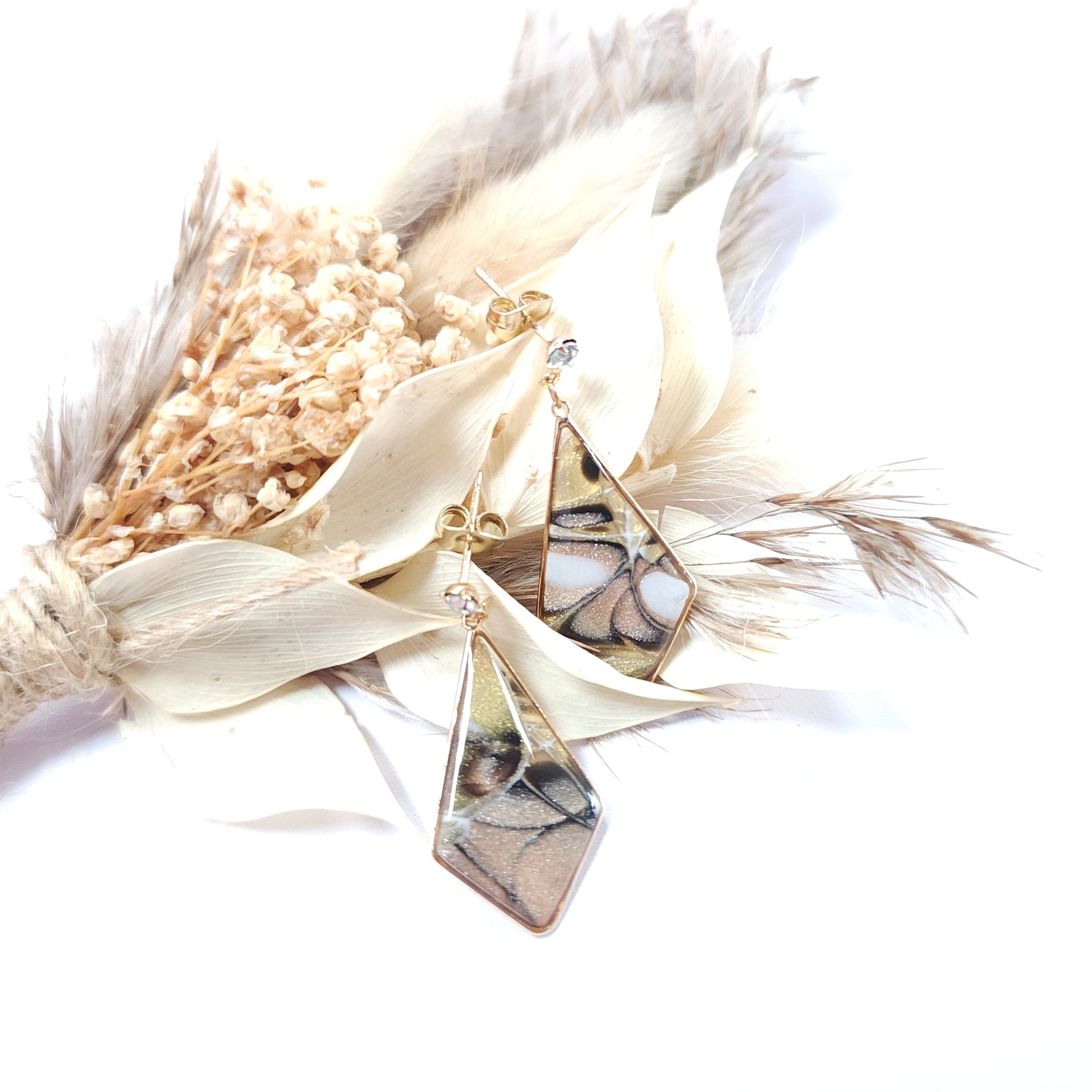Les boucles auréline se distinguent par leurs nuances délicates de doré, de saumon et de noir, évoquant une élégance lumineuse aux accents contemporains. Le motif abstrait, entièrement façonné à la main en argile polymère, offre un jeu de textures et de reflets qui rend chaque paire unique.