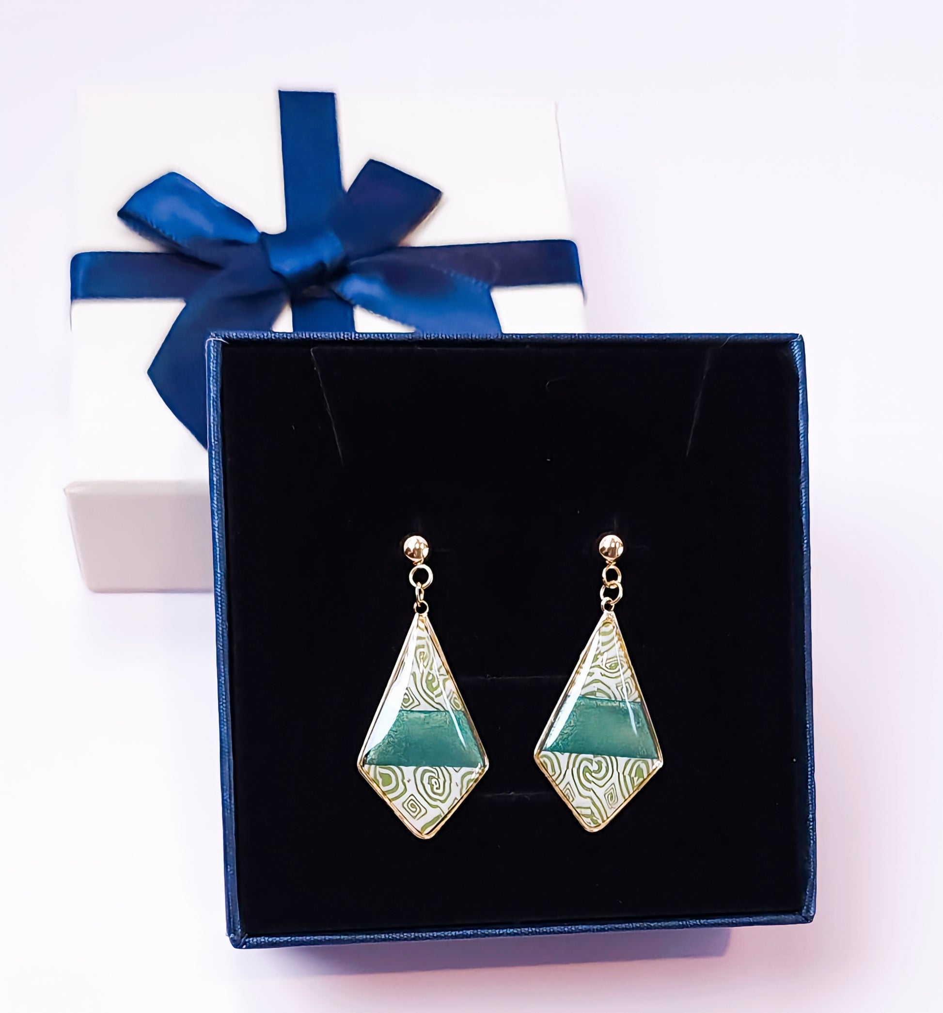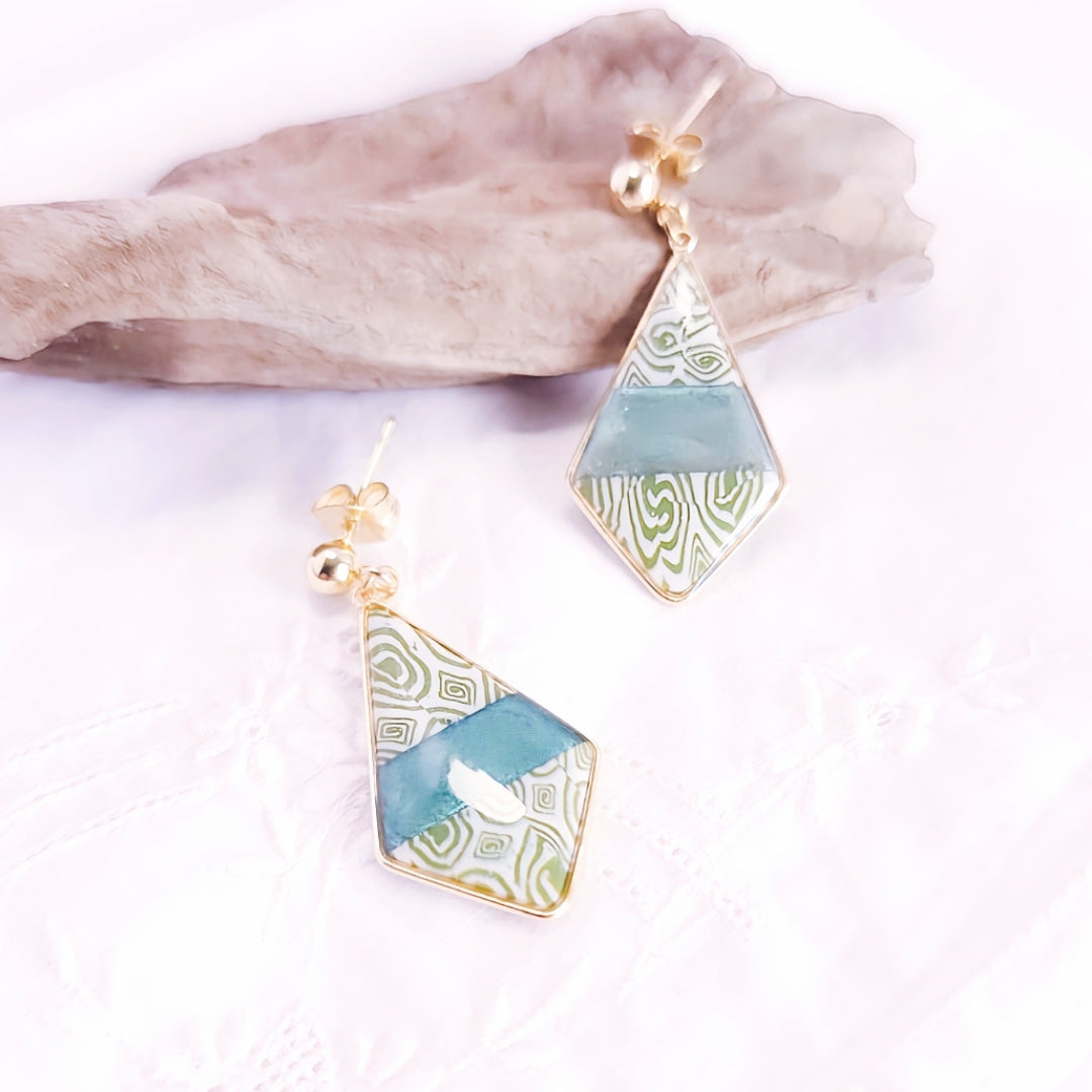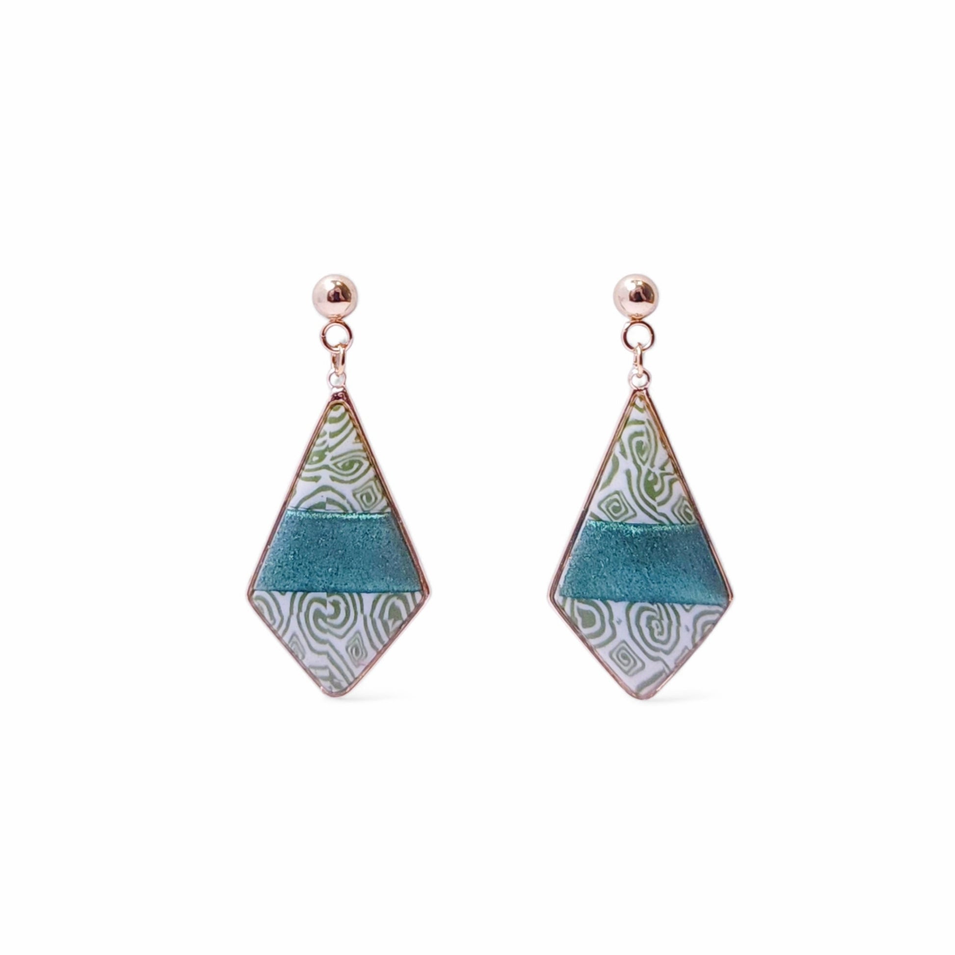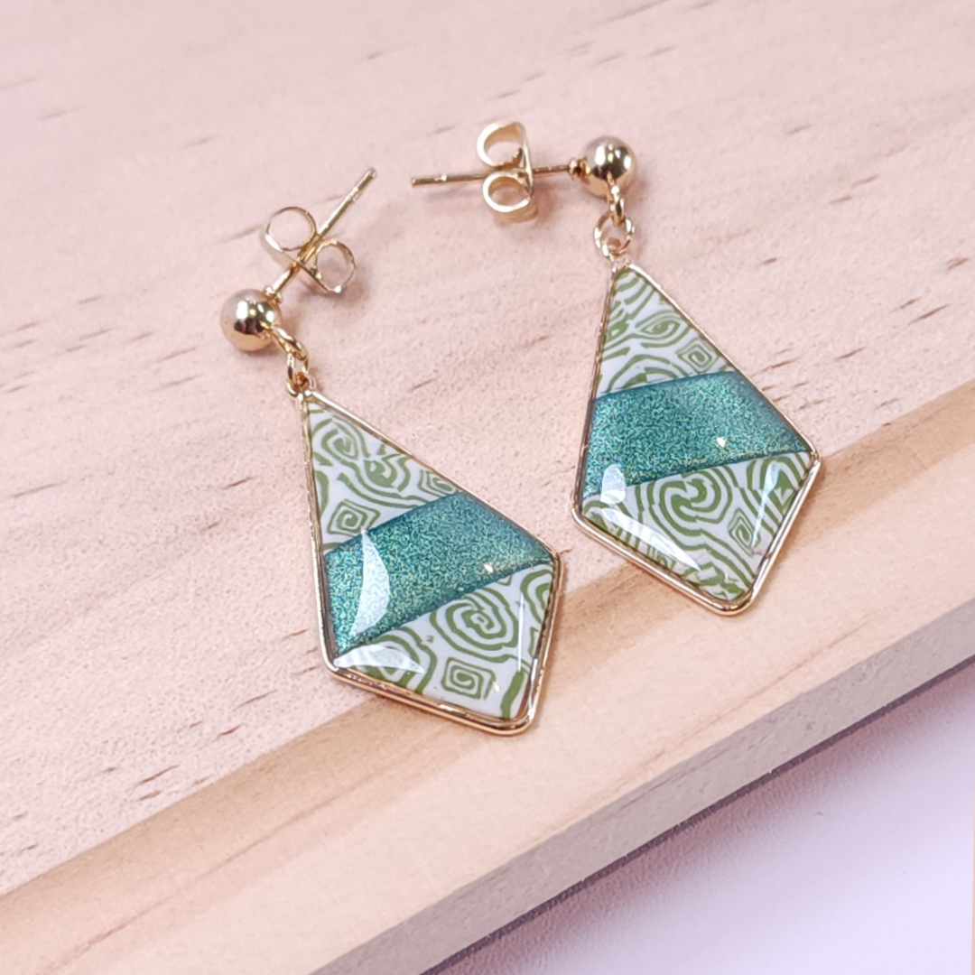 Boucles d’oreilles en forme de losange, ornées de motifs géométriques gravés et rehaussées d’un vert pailleté profond au centre. Insérées dans un élégant cadre en plaqué or 18k et montées sur clous en acier inoxydable hypoallergénique, elles allient originalité et élégance.