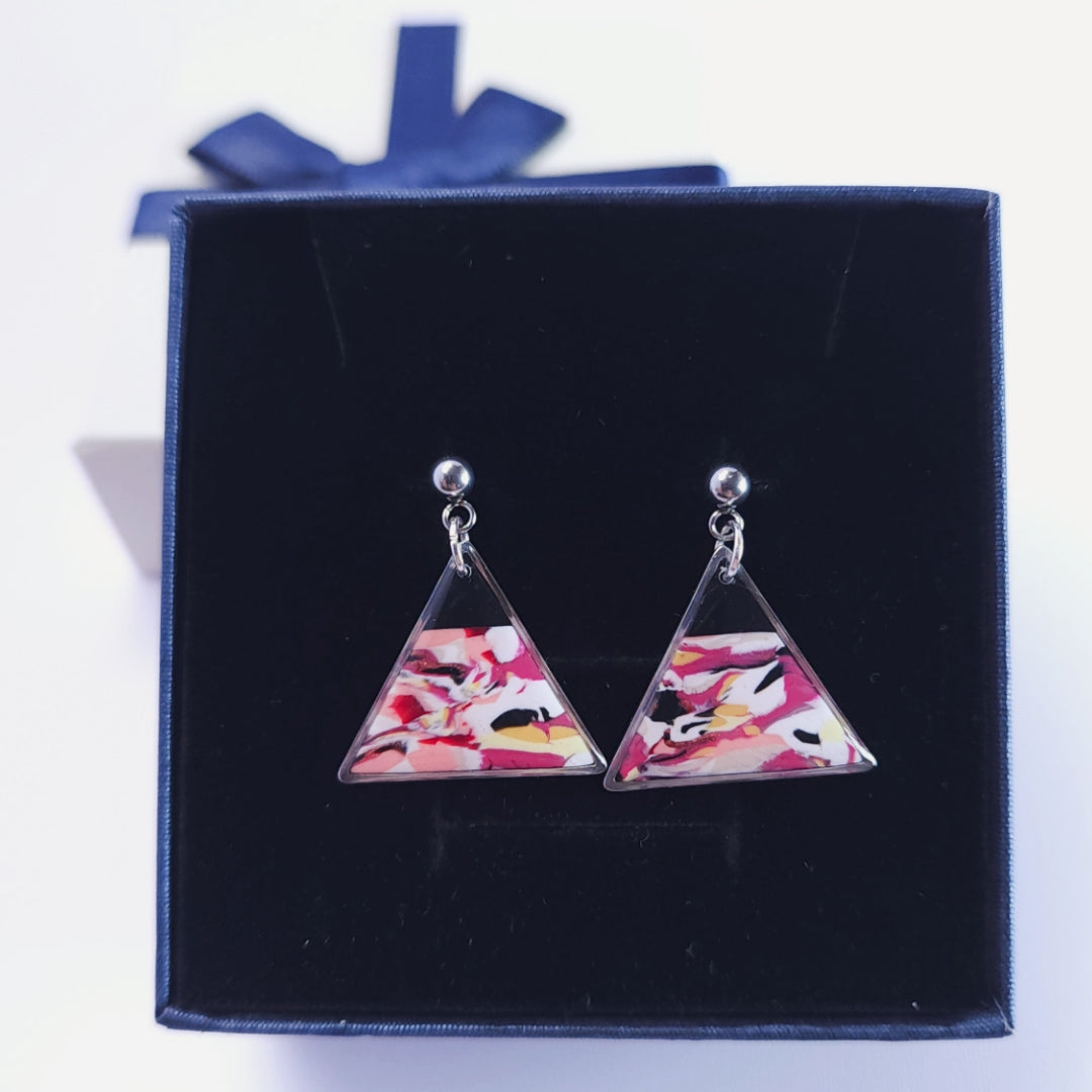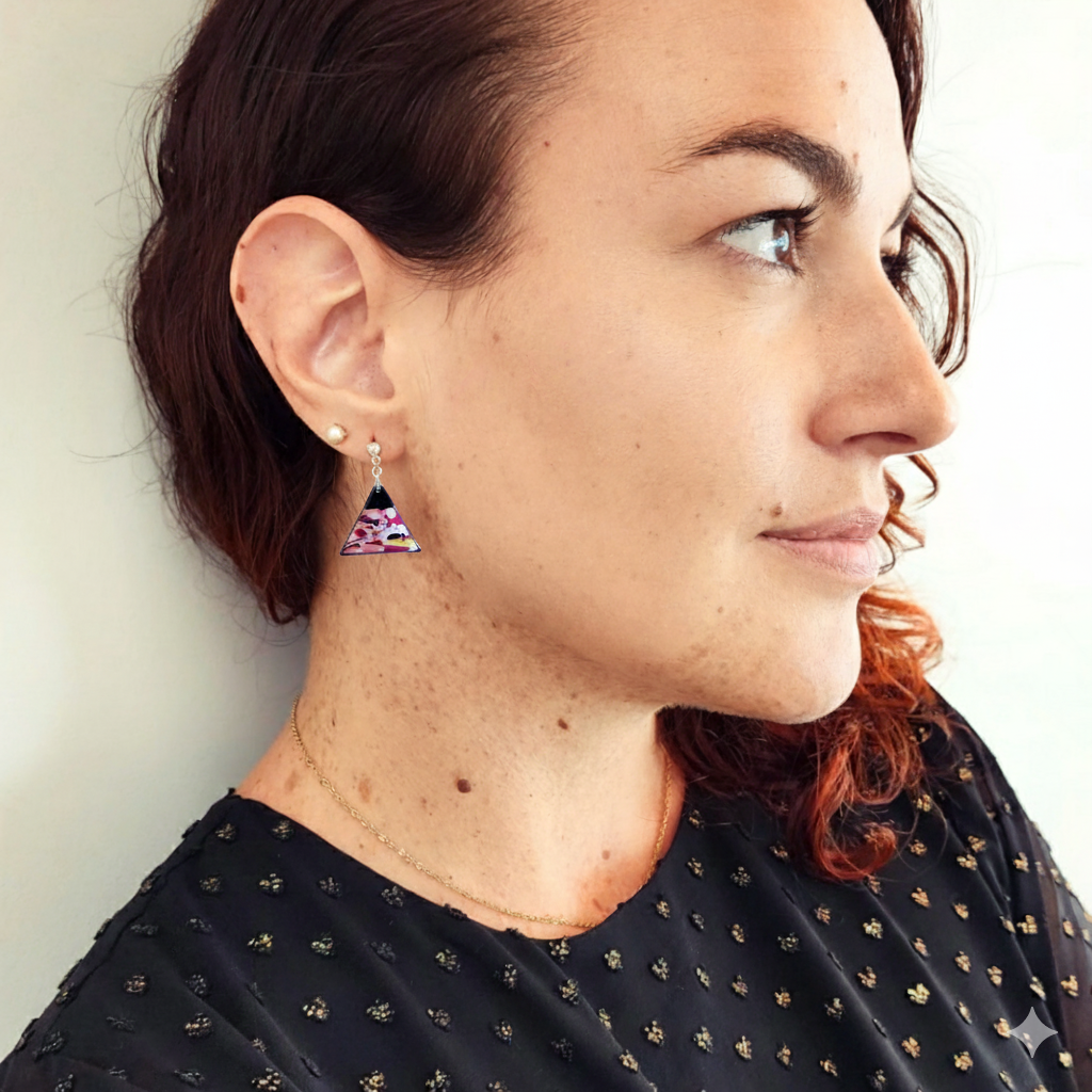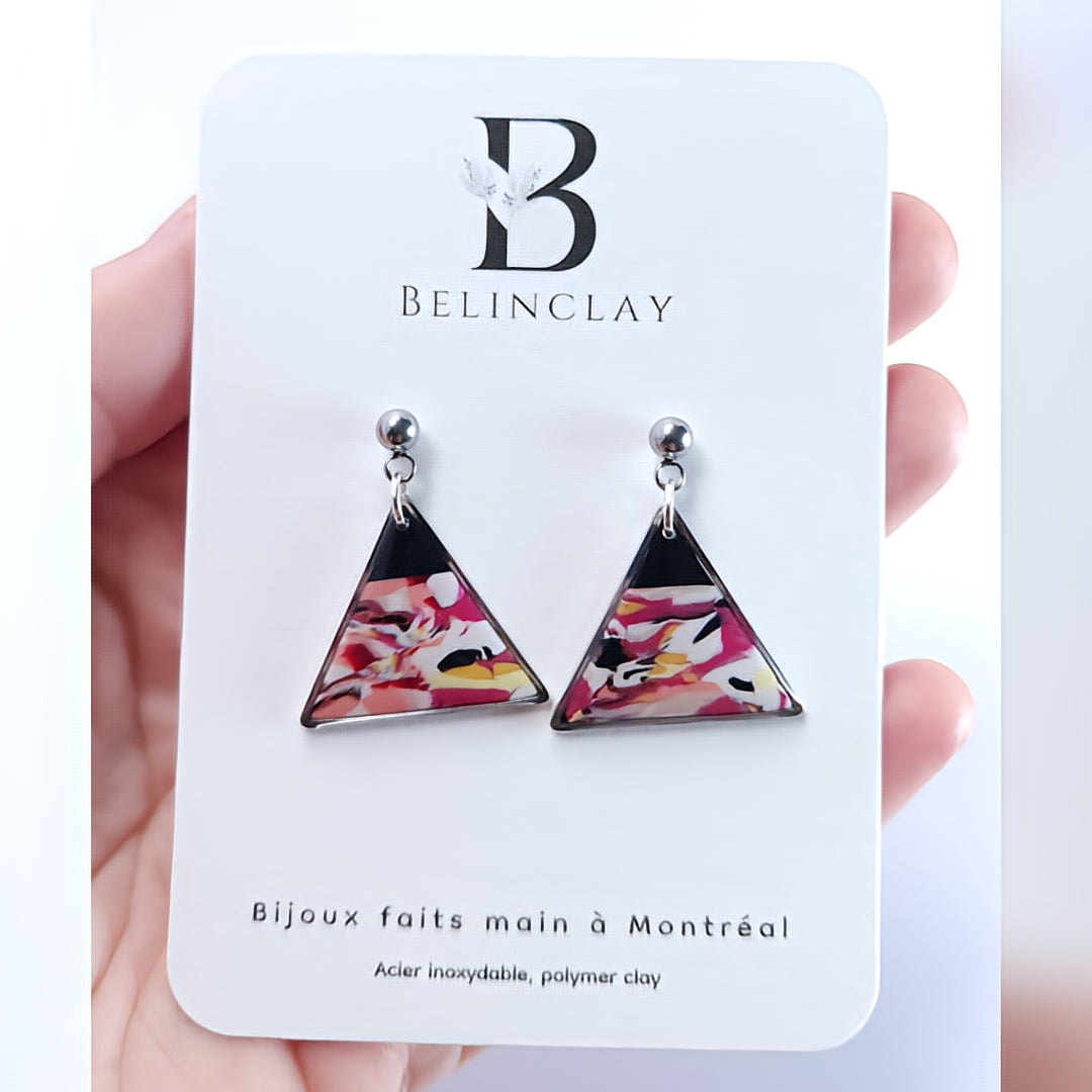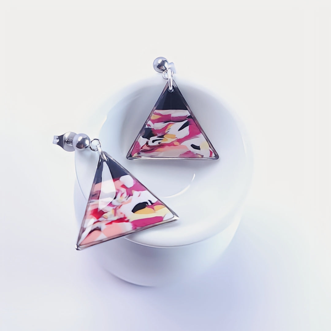 Boucles d’oreilles en forme de triangle, décorées de motifs abstraits aux tons fuchsia, rose, jaune et noir pour un style audacieux et moderne. Montées sur clous argentés en acier inoxydable hypoallergénique, elles ajoutent une touche artistique et colorée à vos tenues.
