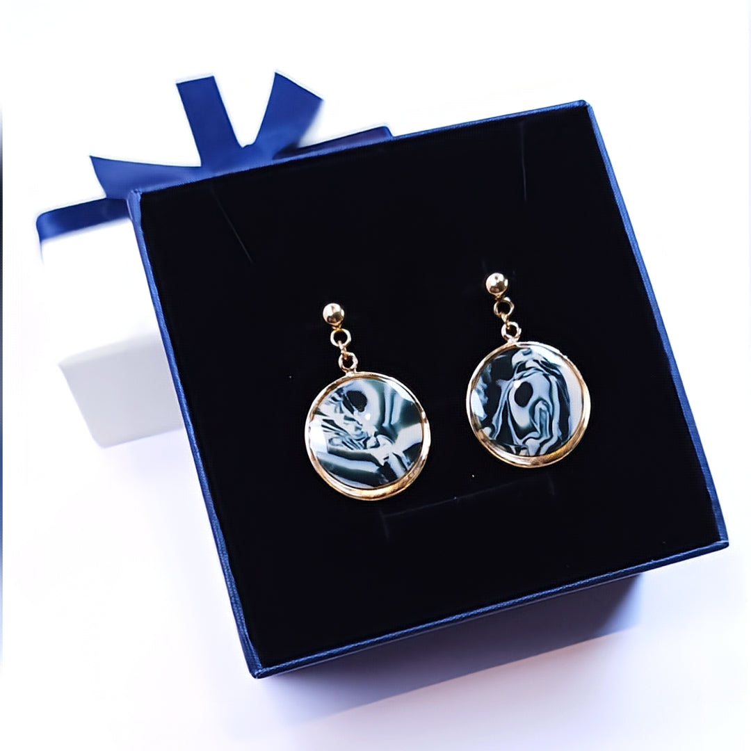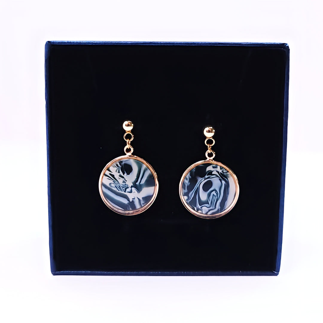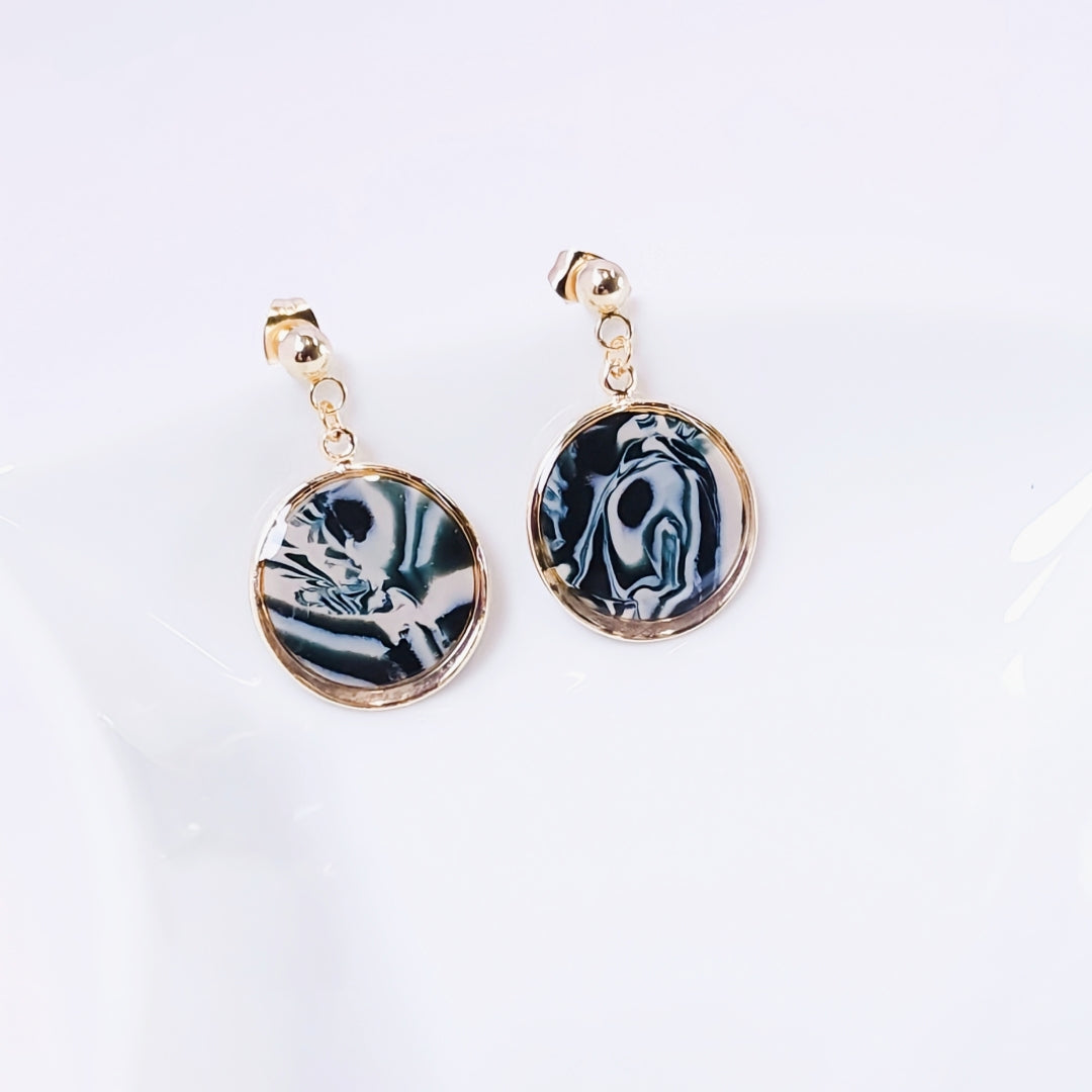 Boucles d’oreilles en argile polymère, en forme de cercle, ornées d’un motif marbré noir style léopard, blanc et gris aux reflets élégants. Insérées dans un cadre en plaqué or 18k et montées sur clous dorés en acier inoxydable hypoallergénique, elles allient sobriété et modernité.
