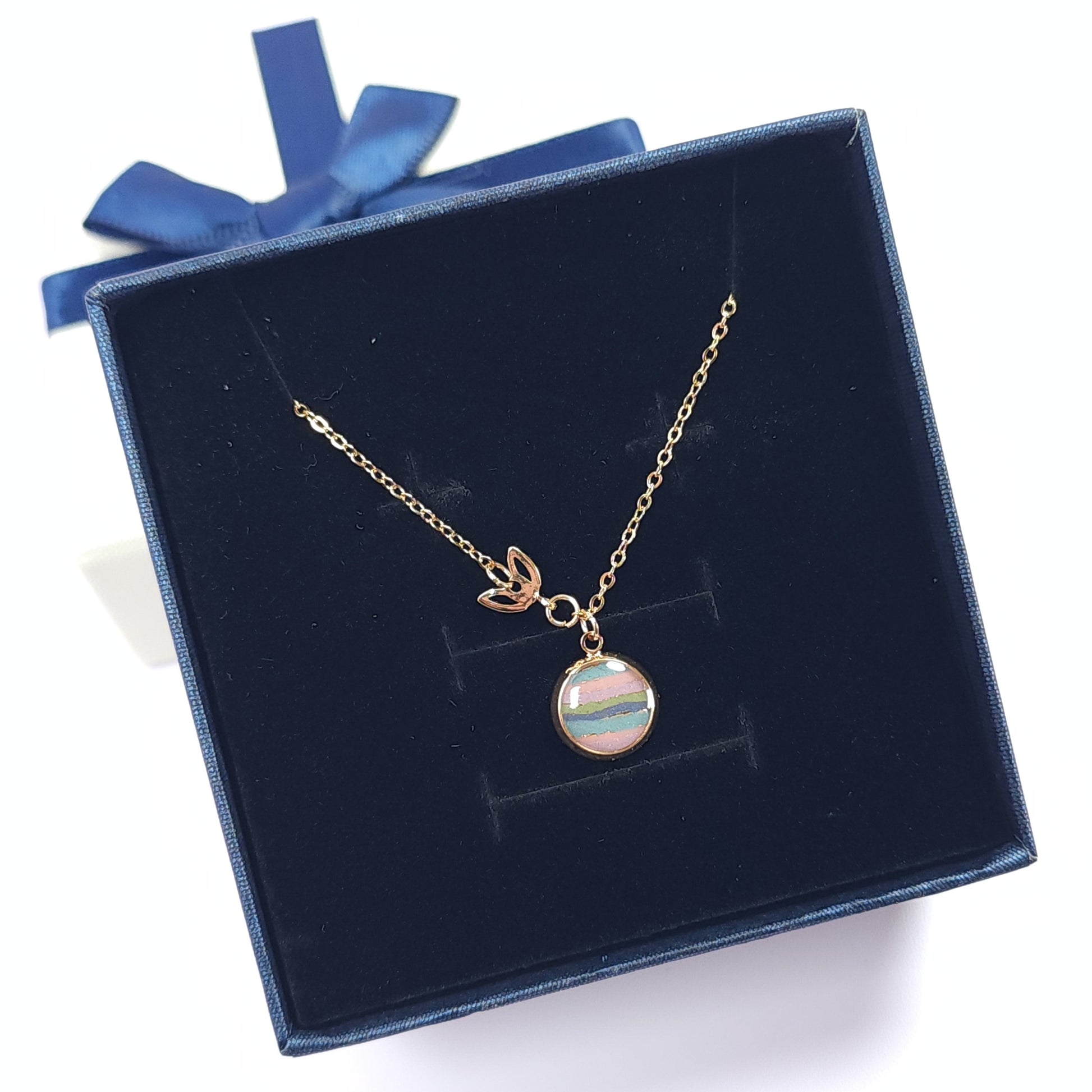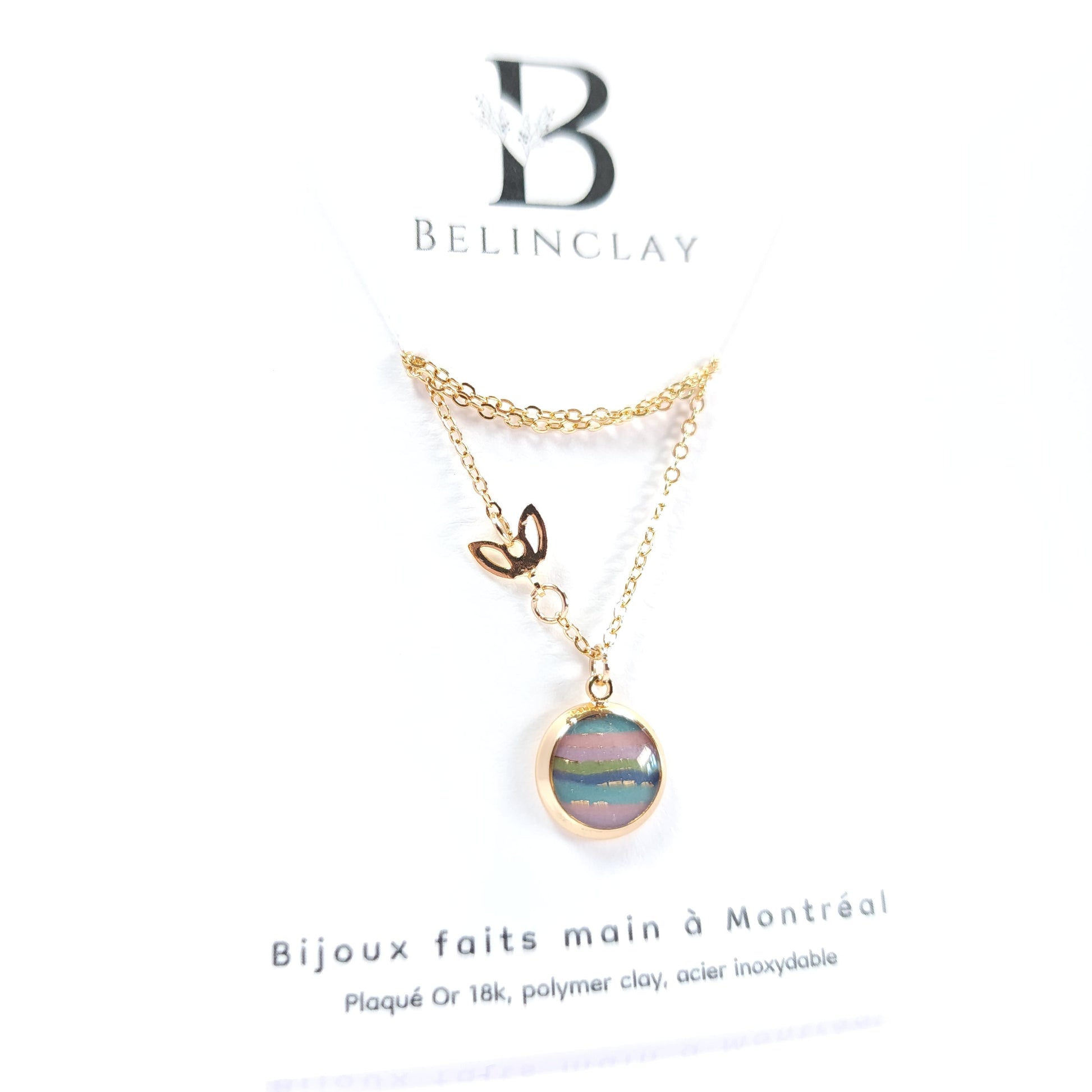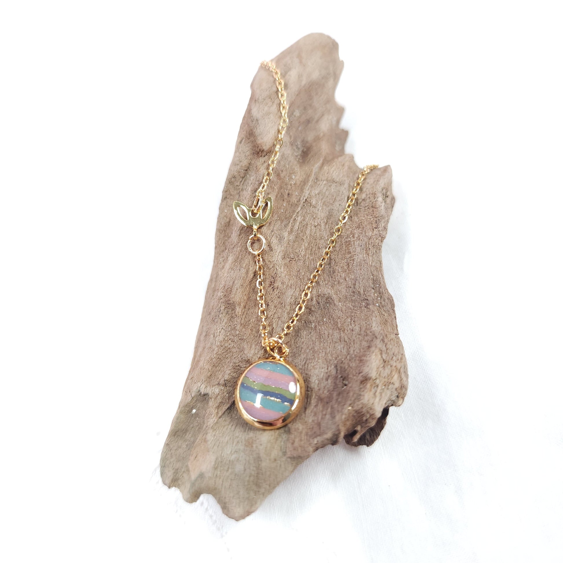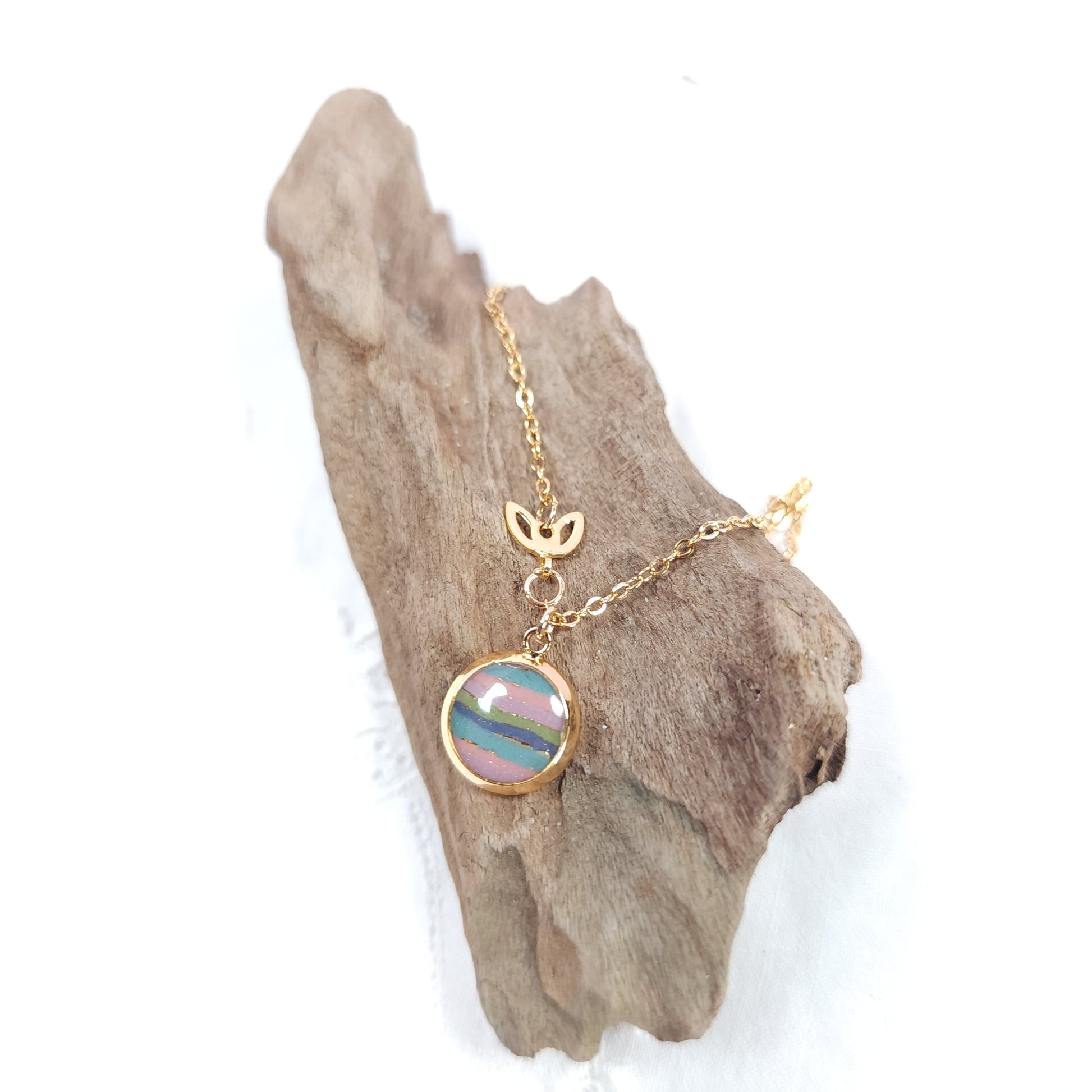 Le collier Ondes d’Alice se distingue par ses reflets irisés aux nuances de rose, vert et bleu, évoquant la poésie lumineuse d’un jardin. Son pendentif, façonné à la main en argile polymère, est délicatement serti dans un cadre en plaqué or 18 carats, créant une harmonie subtile entre éclat et douceur.