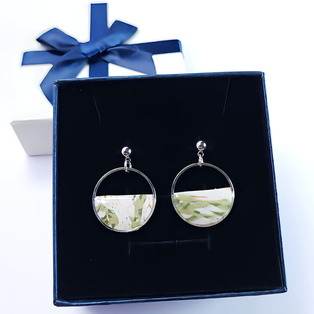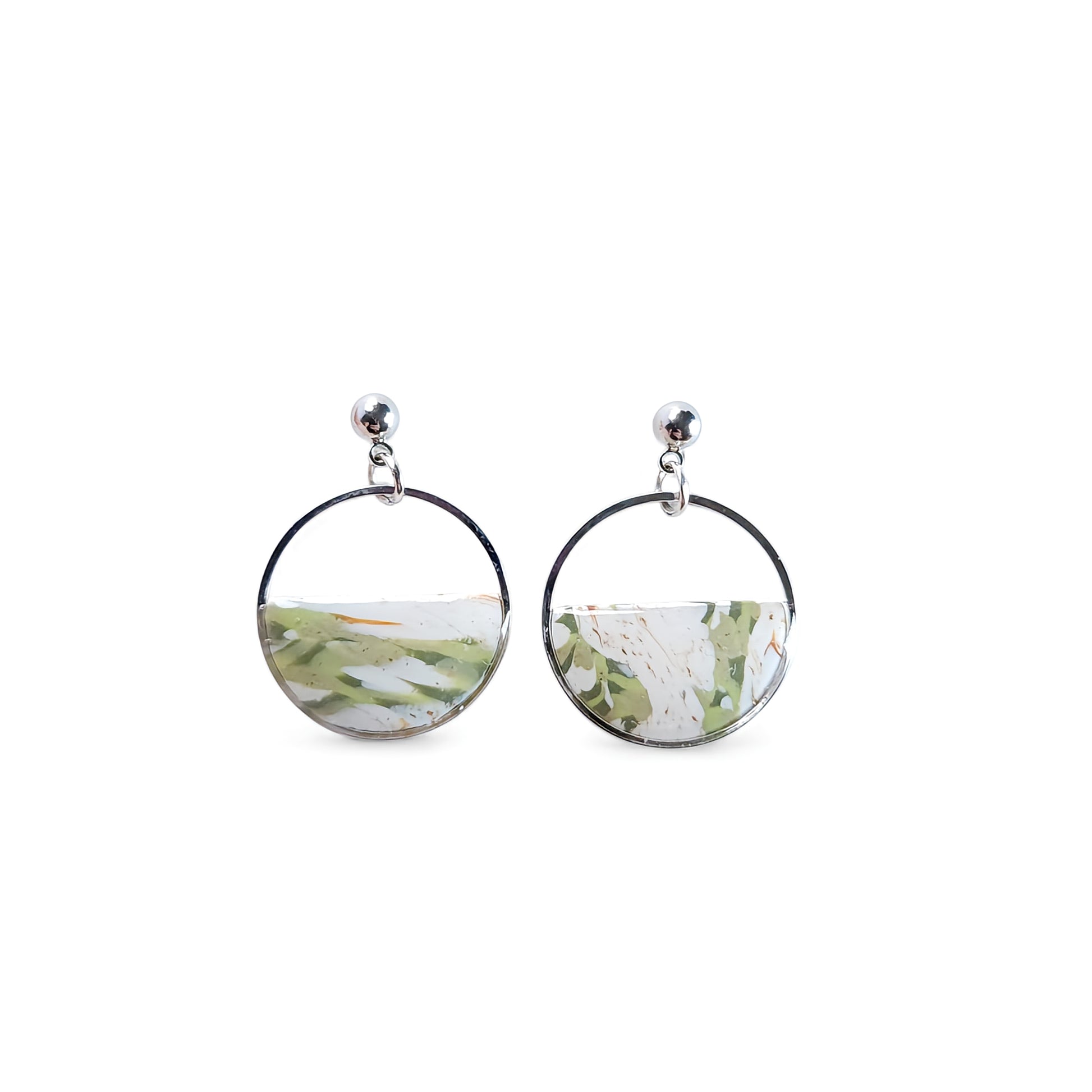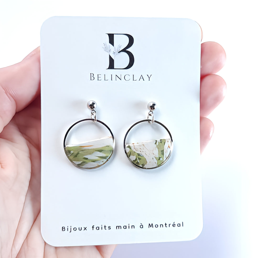 Boucles d’oreilles en argile polymère, en forme de créole, ornées d’un motif marbré vert tendre et blanc, subtilement rehaussé de fines touches dorées. Montées sur une structure en acier inoxydable argenté avec clous hypoallergéniques, elles apportent une touche délicate et moderne à vos tenues.