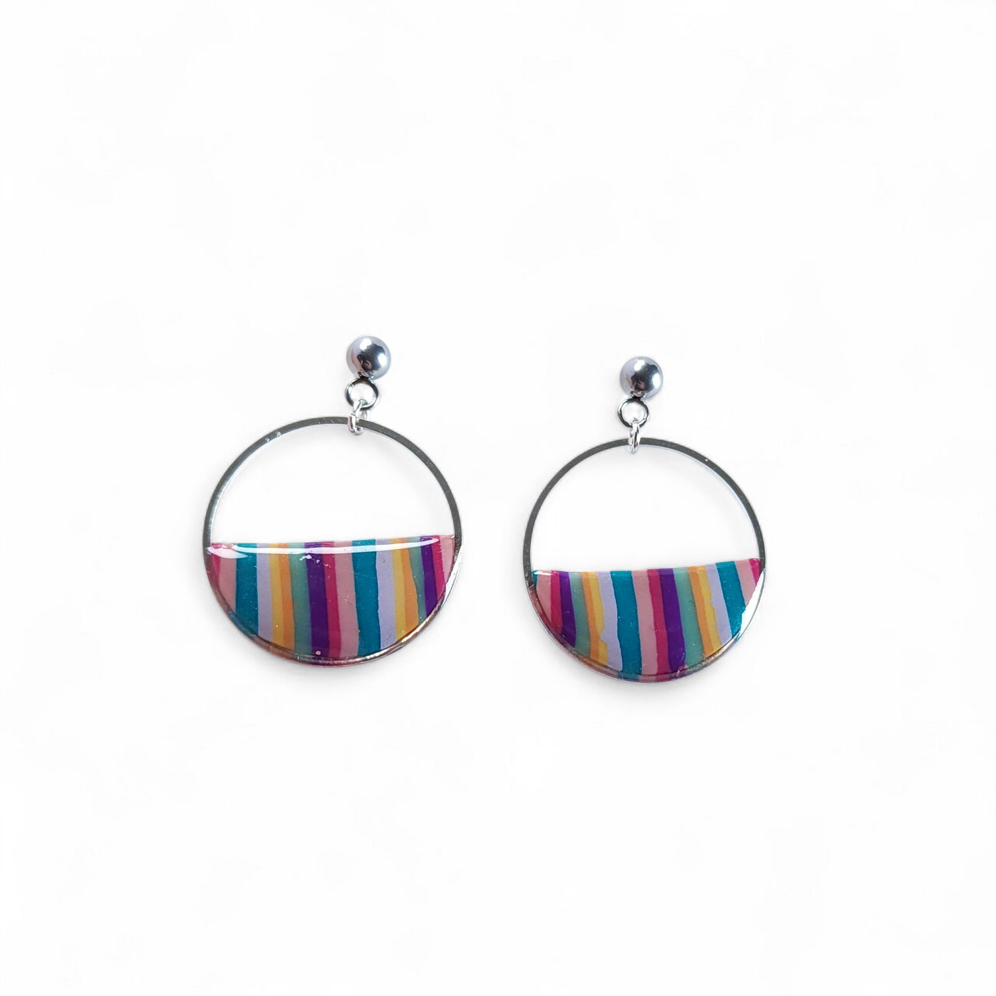 Boucles d’oreilles rondes en argile polymère aux rayures vives : turquoise, rose fuchsia, rose, violet, bleu clair, jaune safran et bleu indigo. Montées sur clous en acier inoxydable hypoallergénique, avec un cadre circulaire argenté.