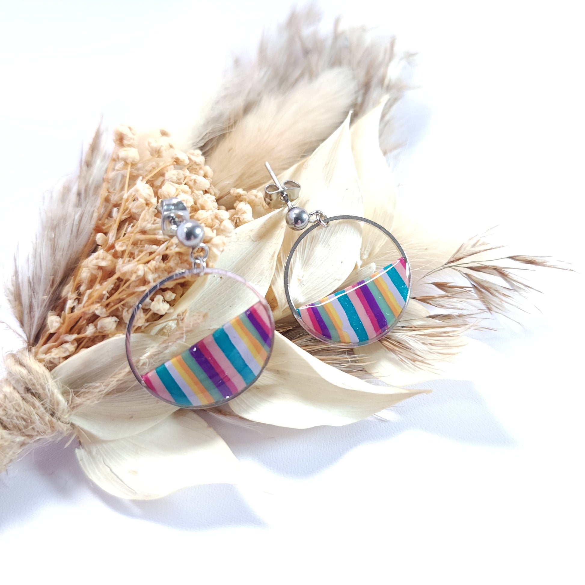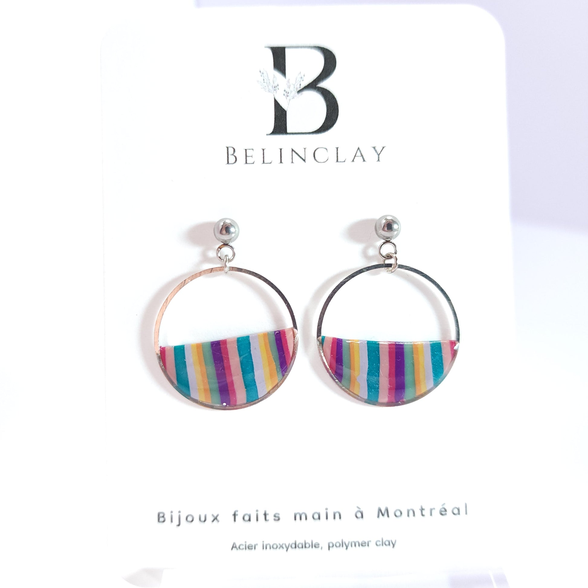 Le motif rayé multicolore, entièrement façonné à la main en argile polymère, rend chaque paire unique et empreinte de vivacité.