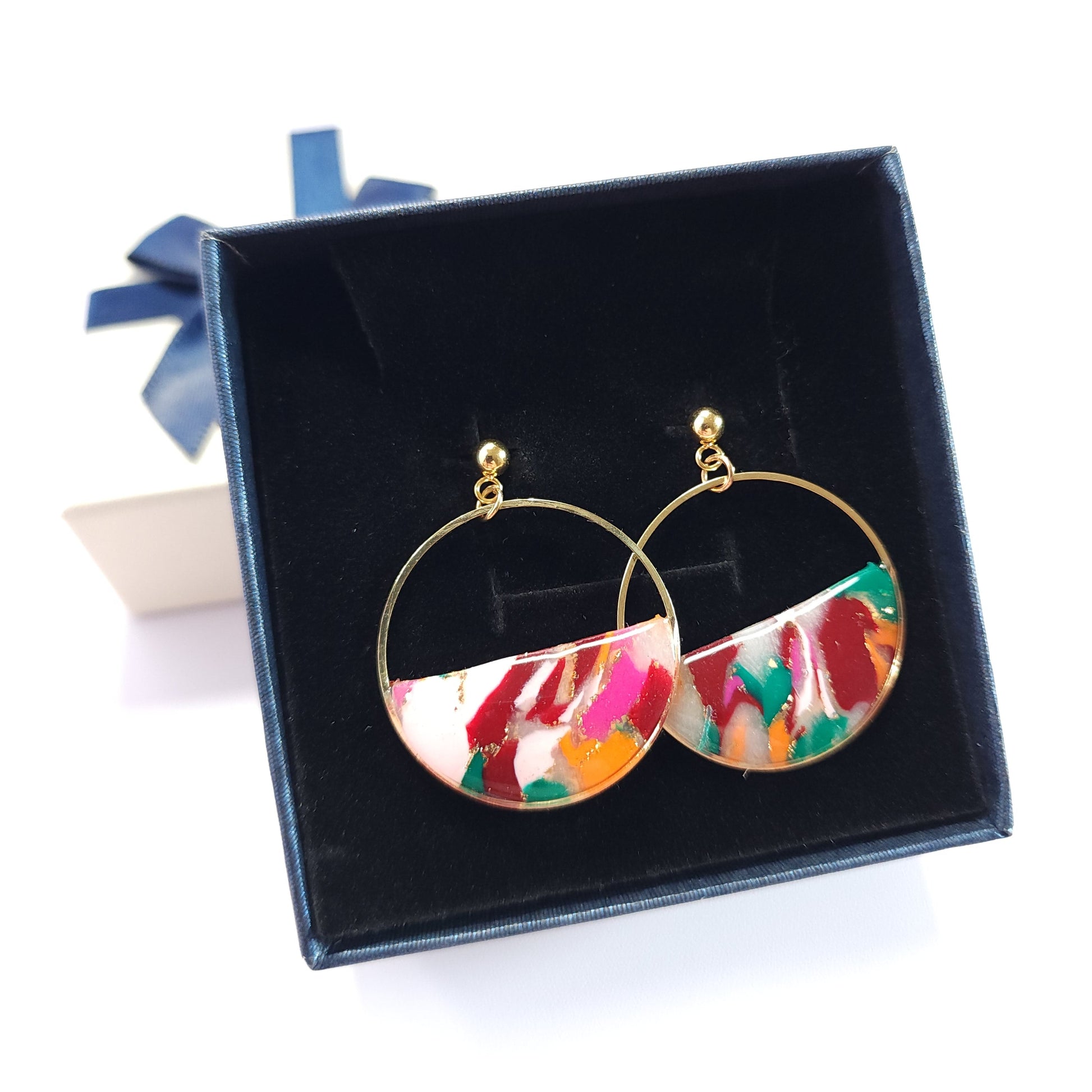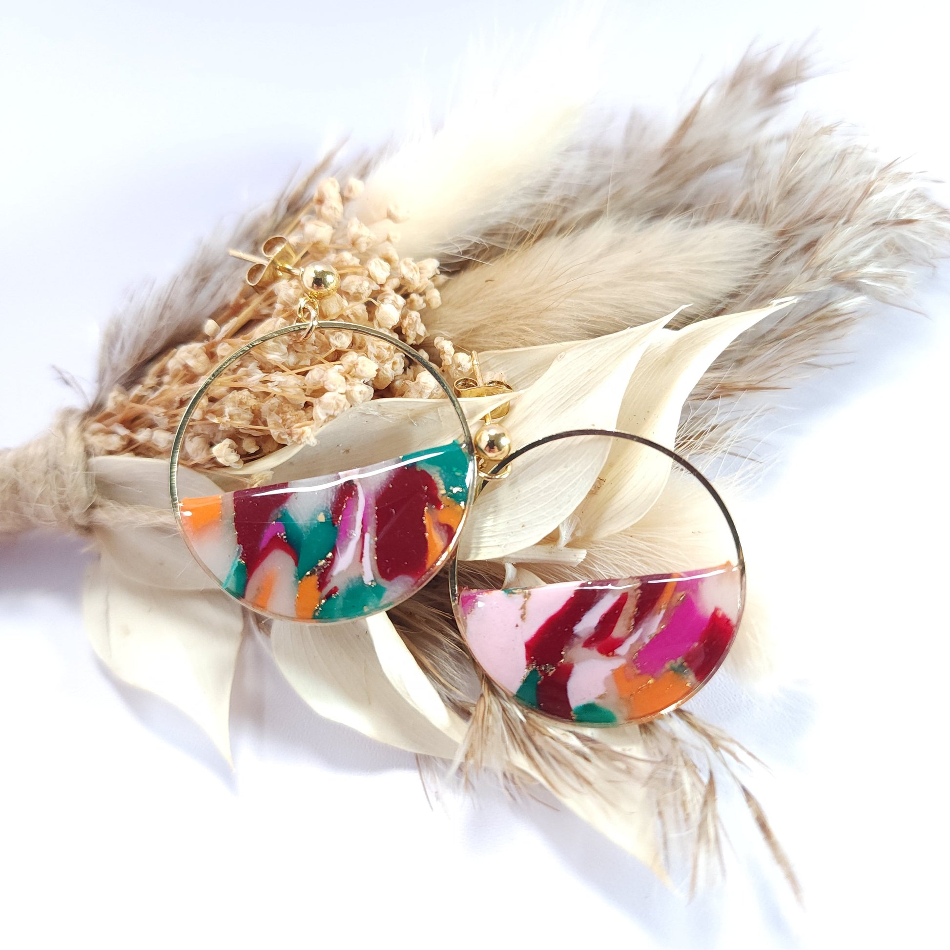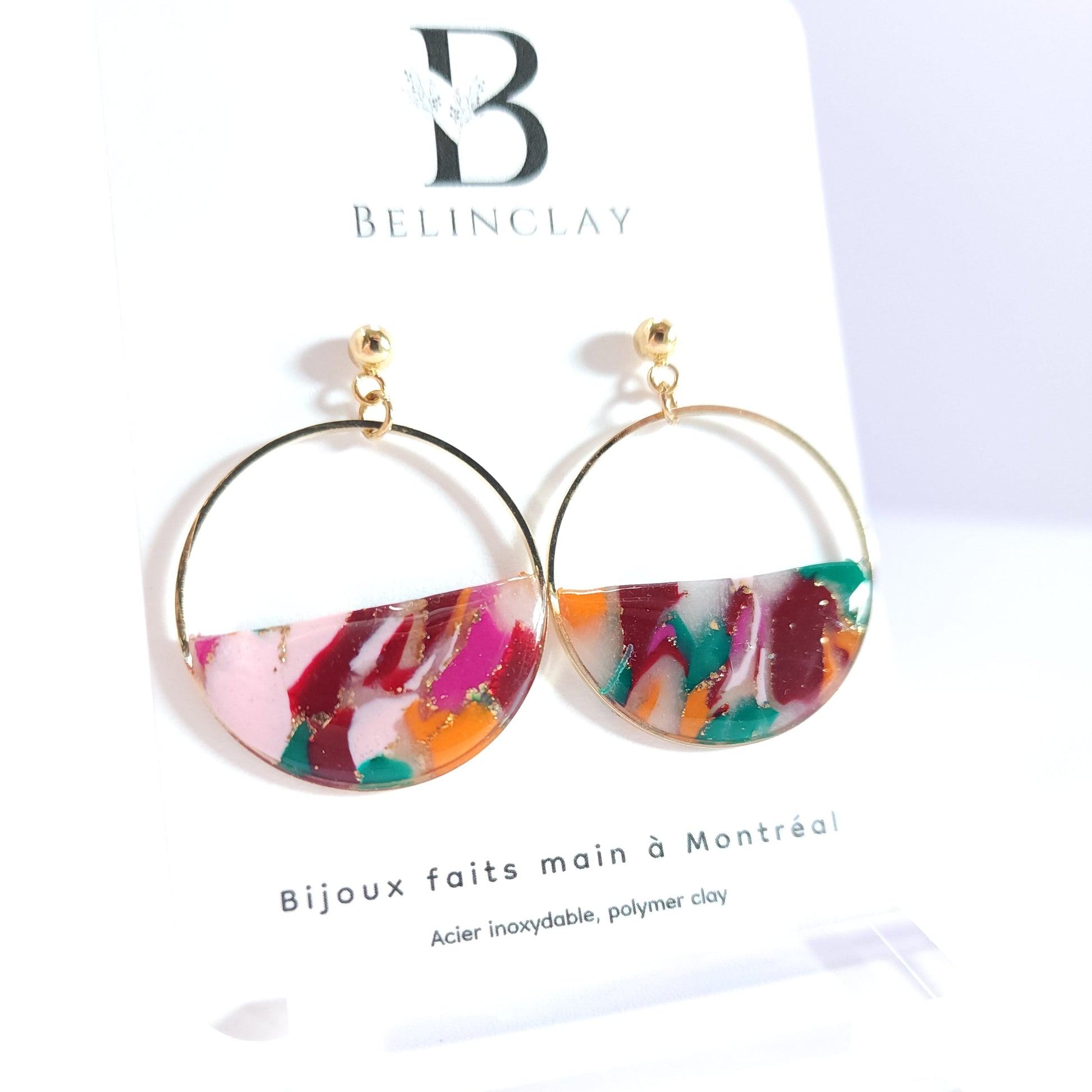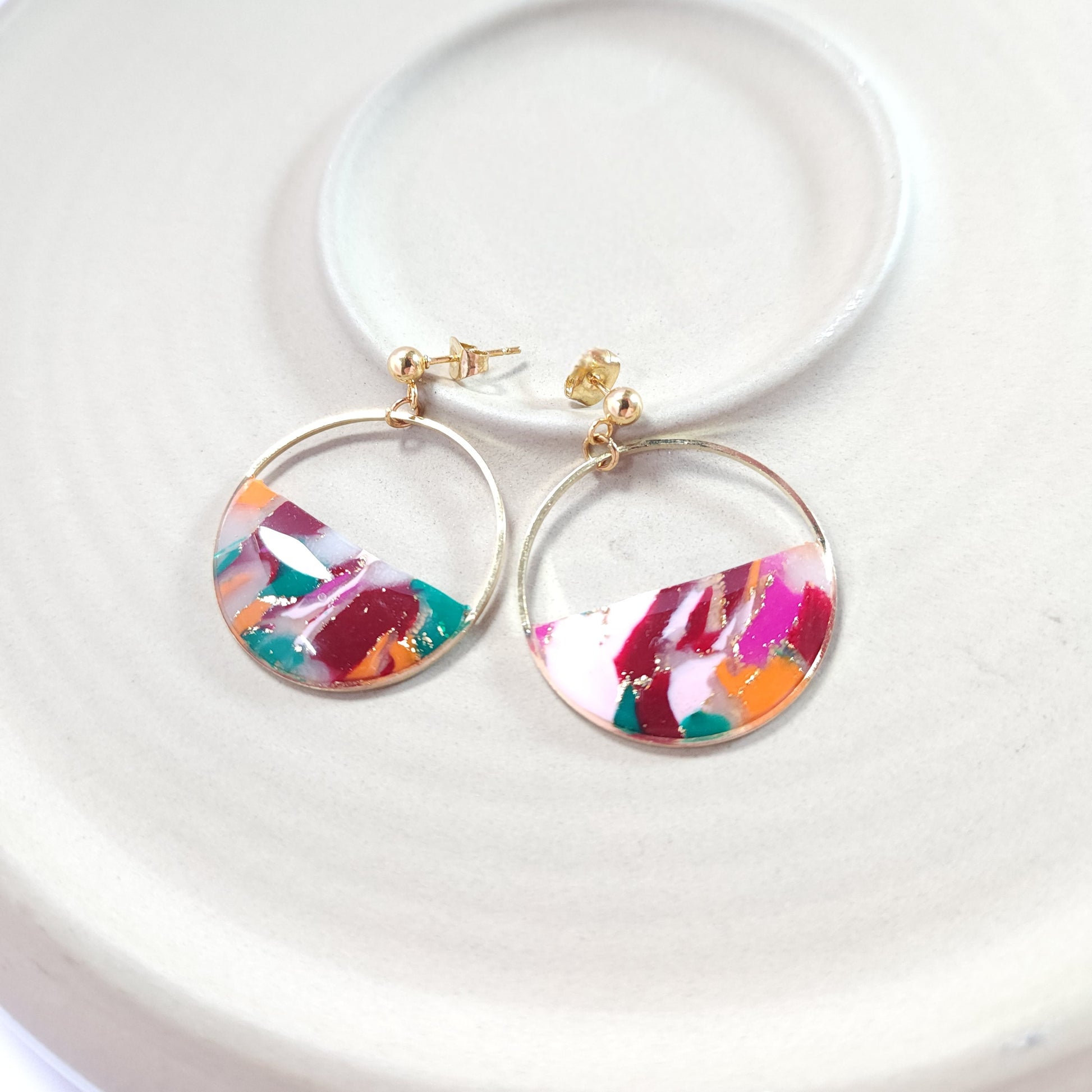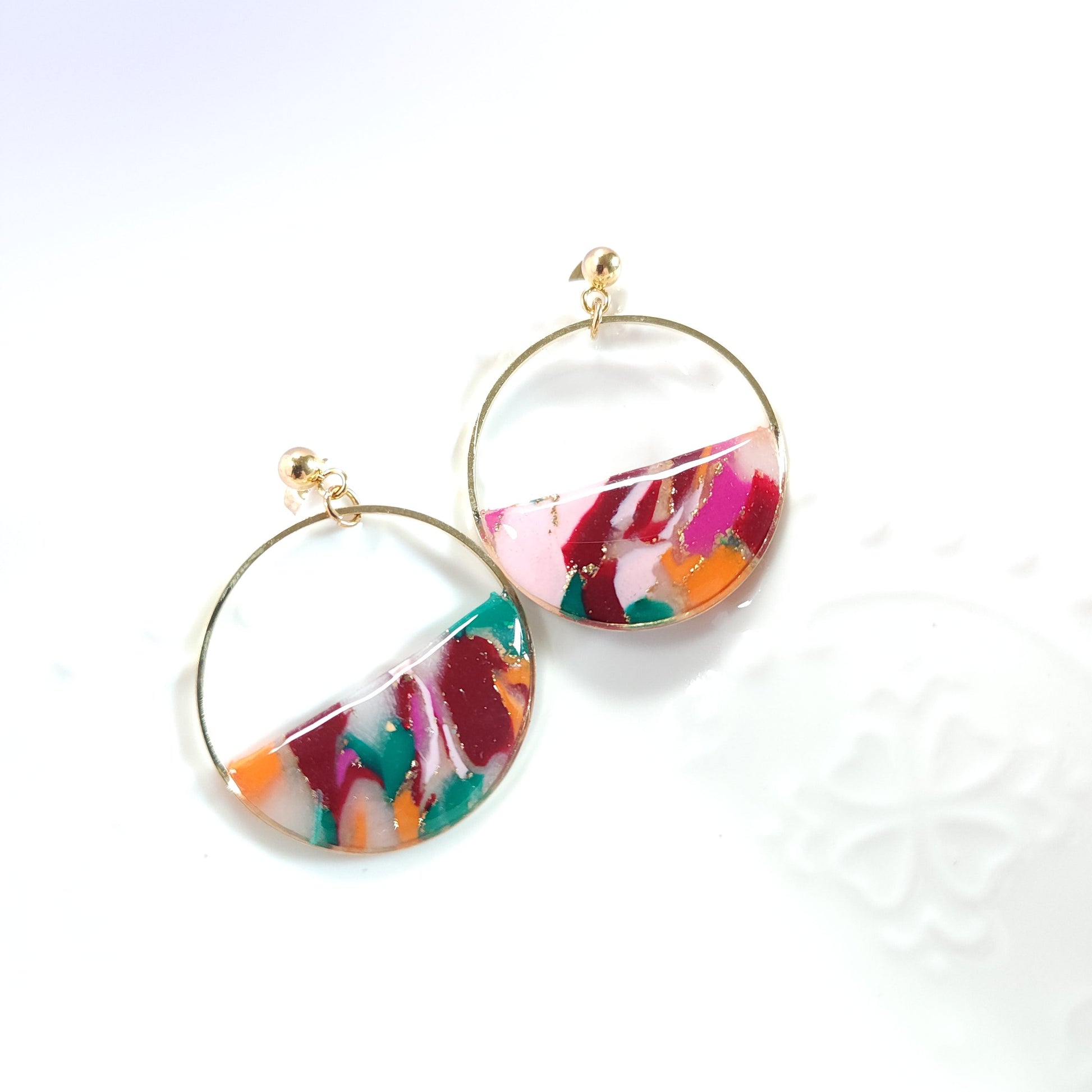 Les boucles Éclyssia se distinguent par leurs nuances éclatantes de rose, de rouge, d’orange et de vert, sublimées de touches dorées, évoquant une énergie vive et artistique aux accents abstraits. Le motif coloré, entièrement façonné à la main en argile polymère, rend chaque paire unique et empreinte de caractère.