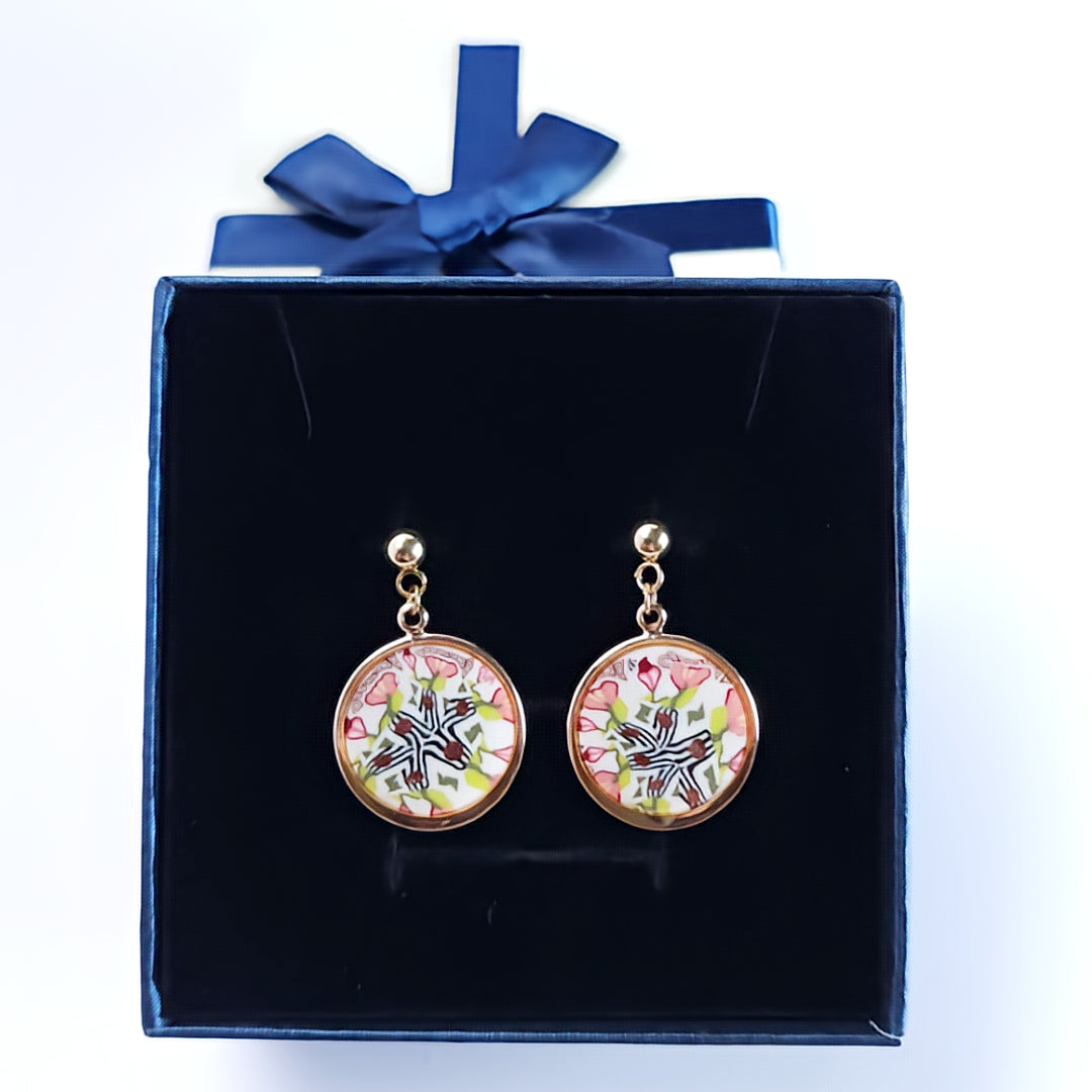 Chaque bijou est entièrement réalisé à la main : les motifs peuvent légèrement varier d’une pièce à l’autre, rendant chaque paire unique.
