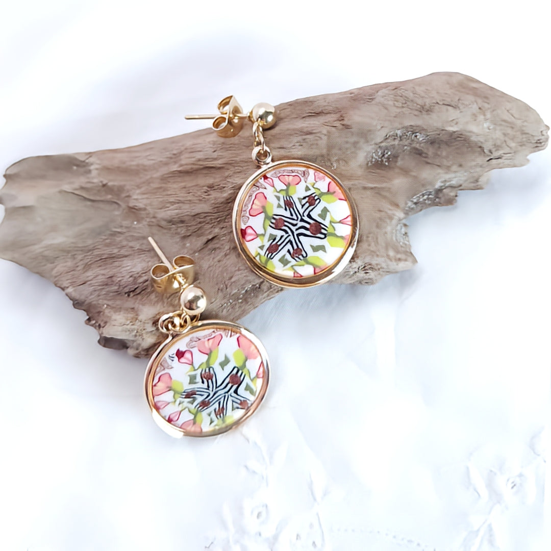 Boucles d’oreilles rectangulaires en argile polymère, décorées de motifs floraux minutieusement façonnés dans des tons de rose, vert et bordeaux, et encadrées d’un cadre en plaqué or 18k.
