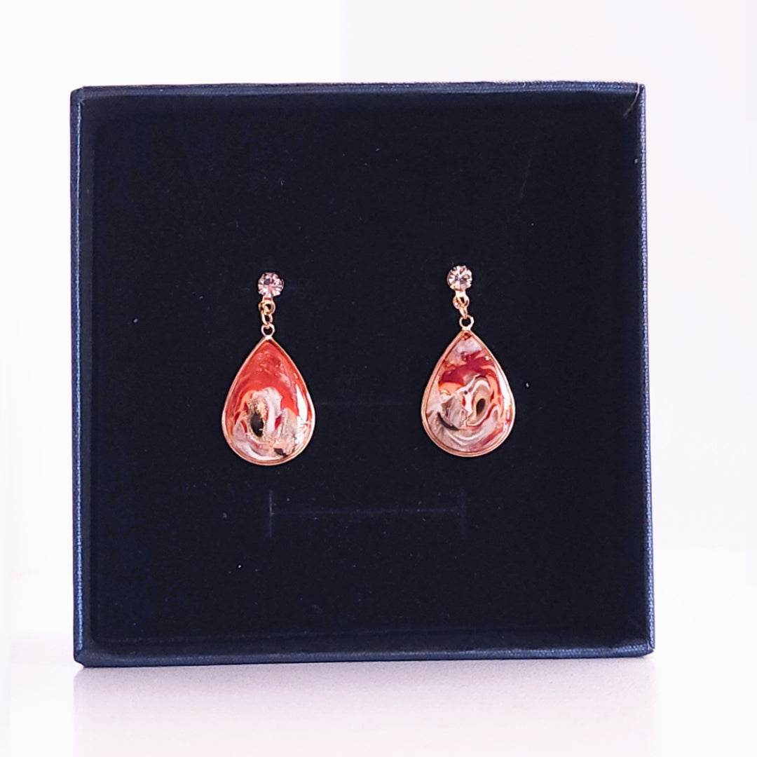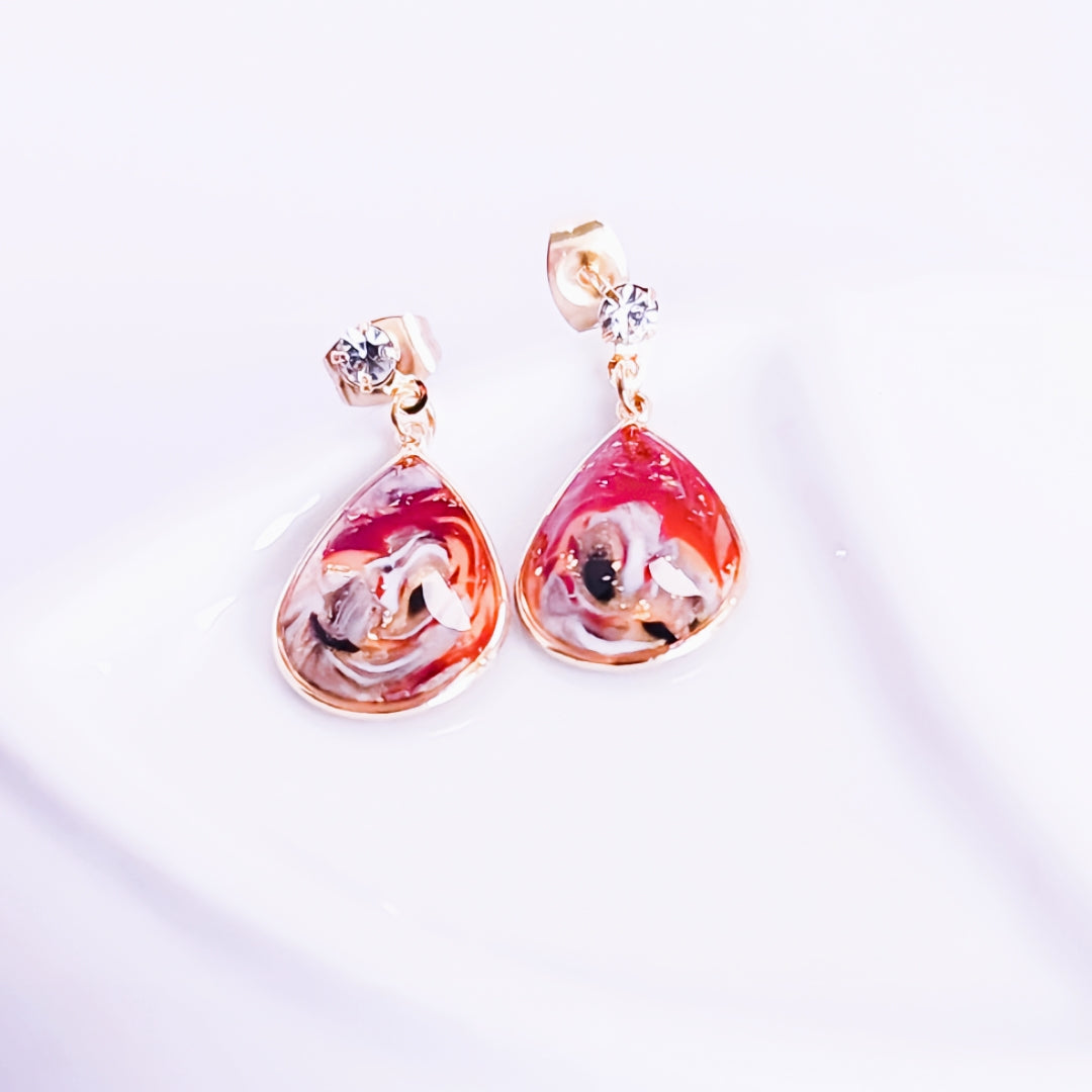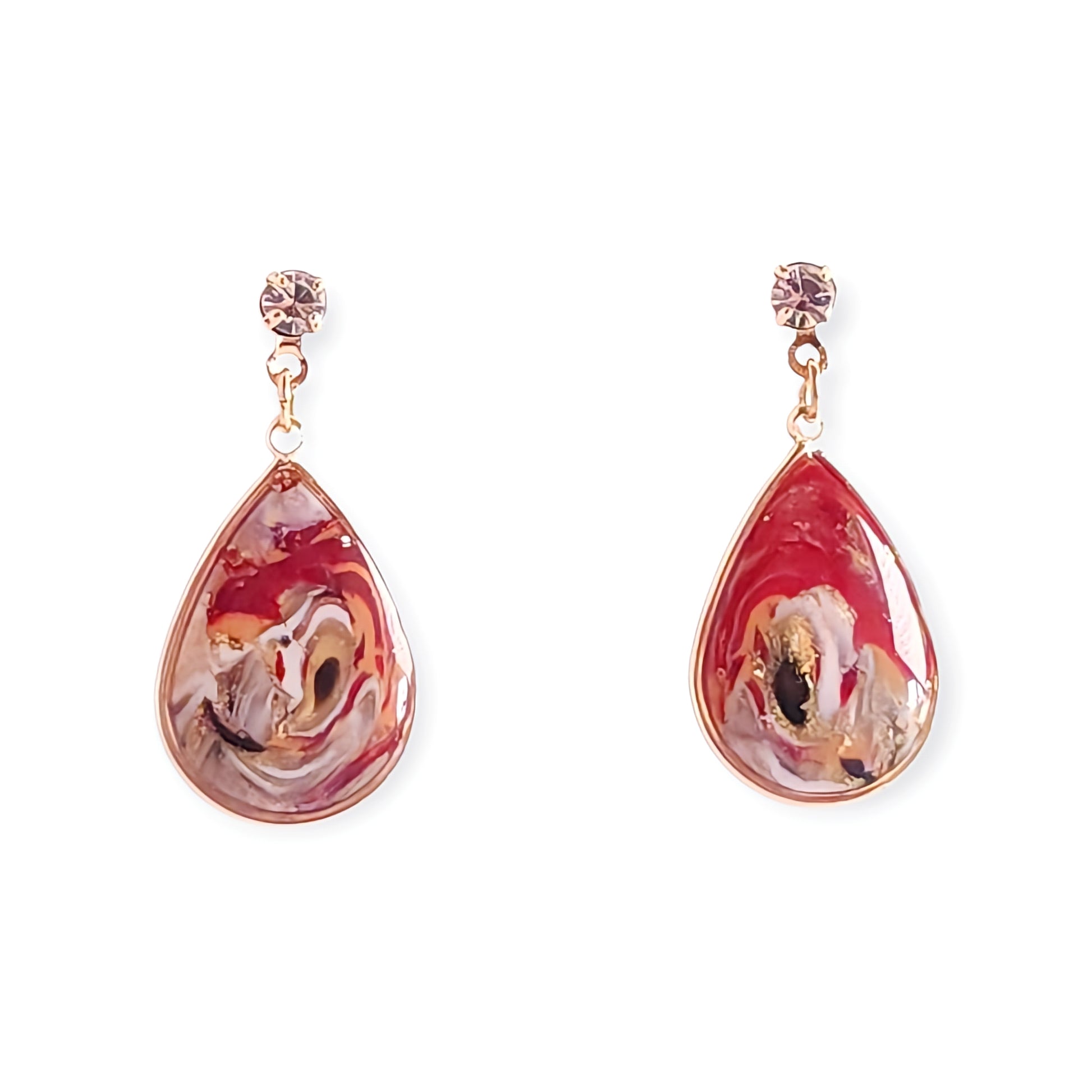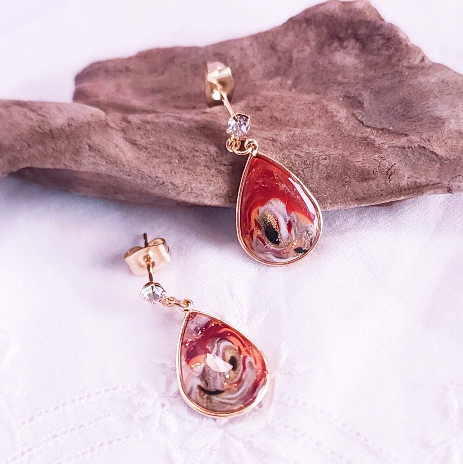 Boucles d’oreilles en argile polymère, en forme de goutte, ornées d’un motif marbré rouge, beige et noir, rehaussé de touches dorées. Insérées dans un cadre en plaqué or 18k et montées sur clous dorés en acier inoxydable hypoallergénique sertis d’un zircon scintillant, elles sont parfaites pour célébrer l’automne avec élégance.