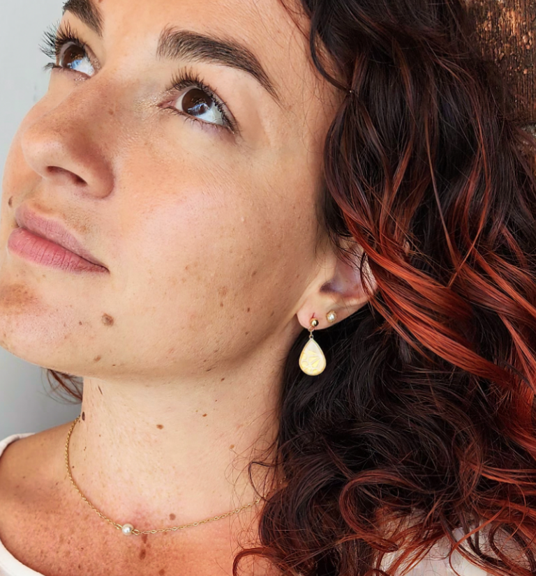 Boucles d’oreilles Gouttes Dorées, réalisées en argile polymère, combinent une moitié lisse beige et une moitié texturée aux tons doré évoquant un motif sablé. Chaque pièce est montée dans un cadre fin plaqué or 18k et suspendue à un anneau doré plaqué or 18k.