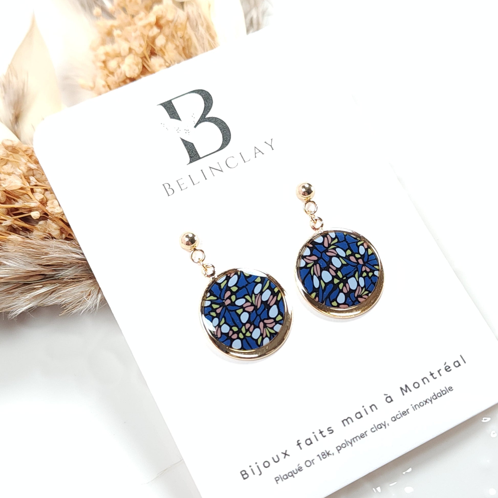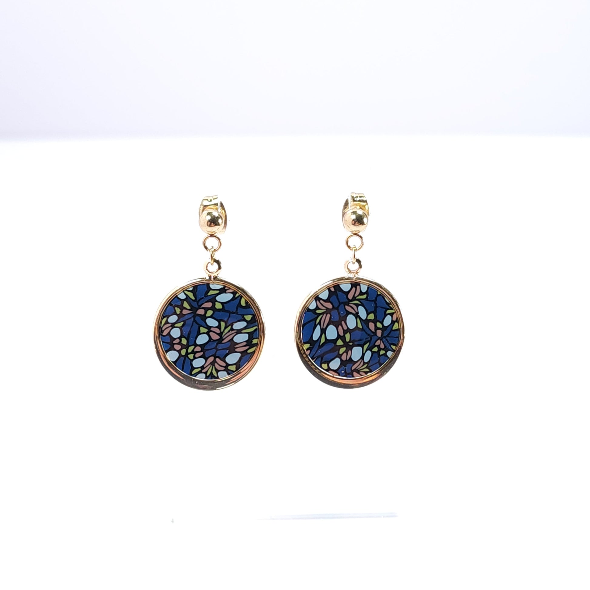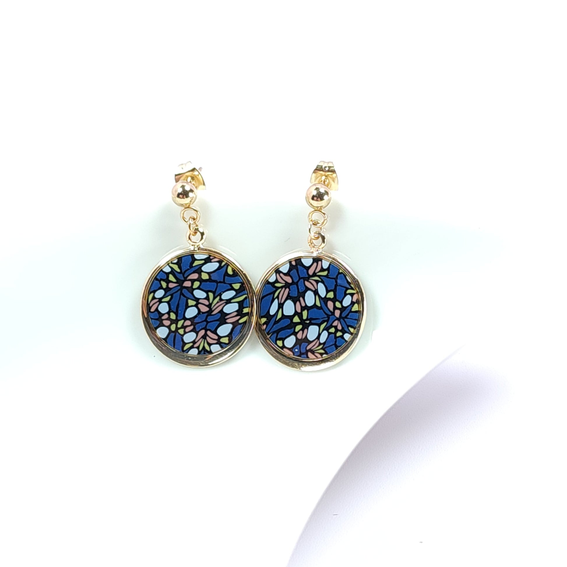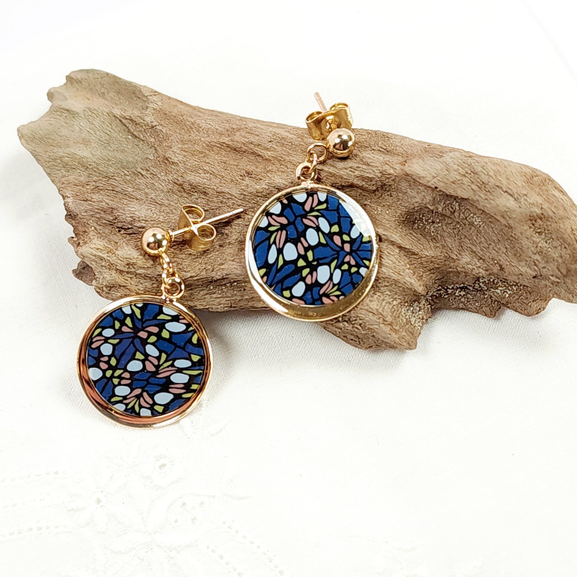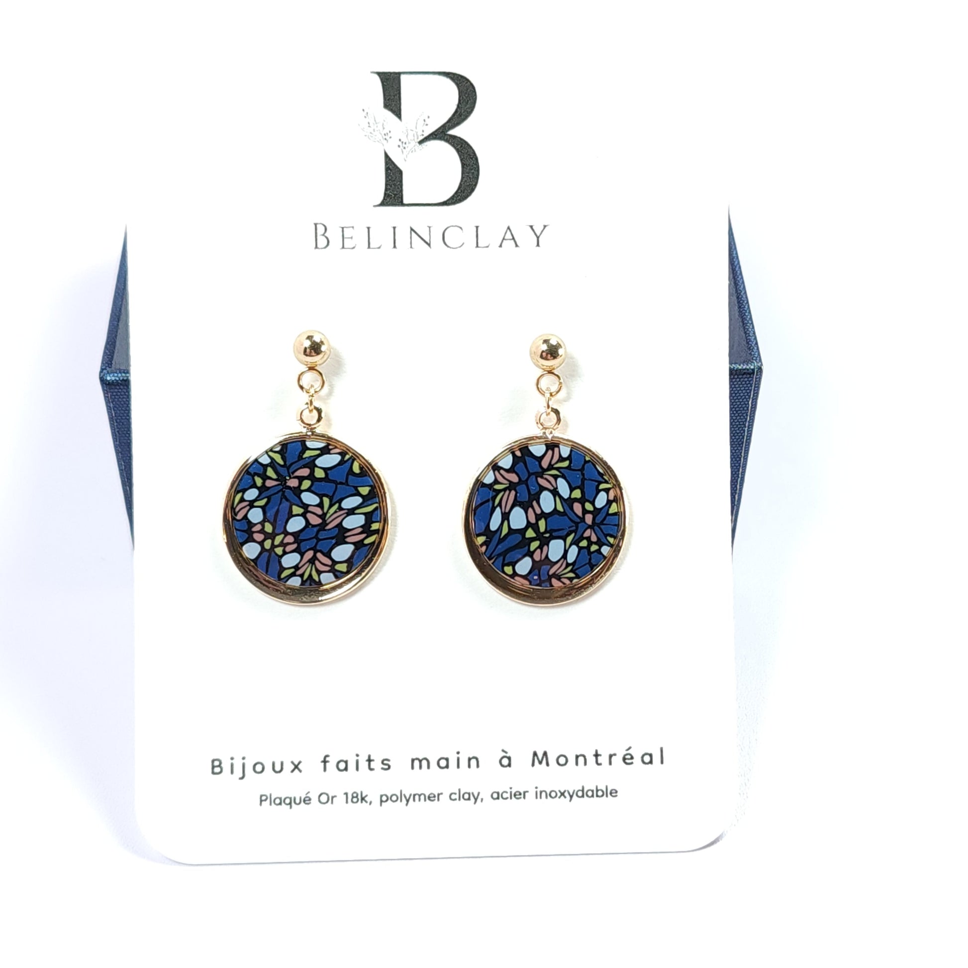 Les boucles d’oreilles Jardin Nocturne se distinguent par leur charme délicat et leurs reflets colorés. Leur forme ronde met en valeur un motif floral entièrement réalisé à la main en argile polymère, mêlant des nuances de bleu profond, vert tendre et rose poudré, rappelant un jardin sous la lumière du soir.