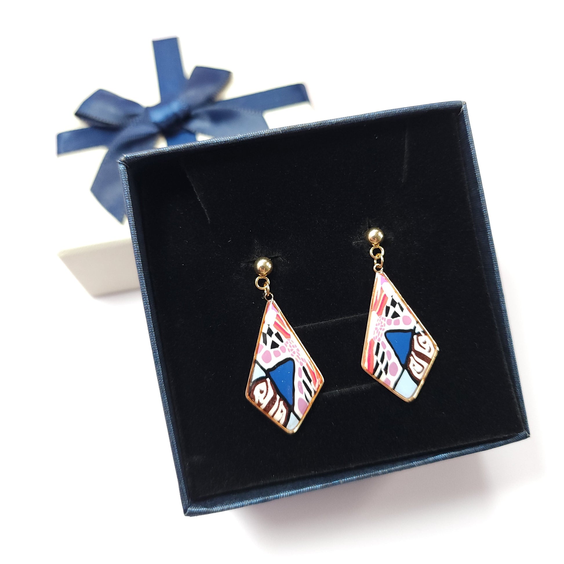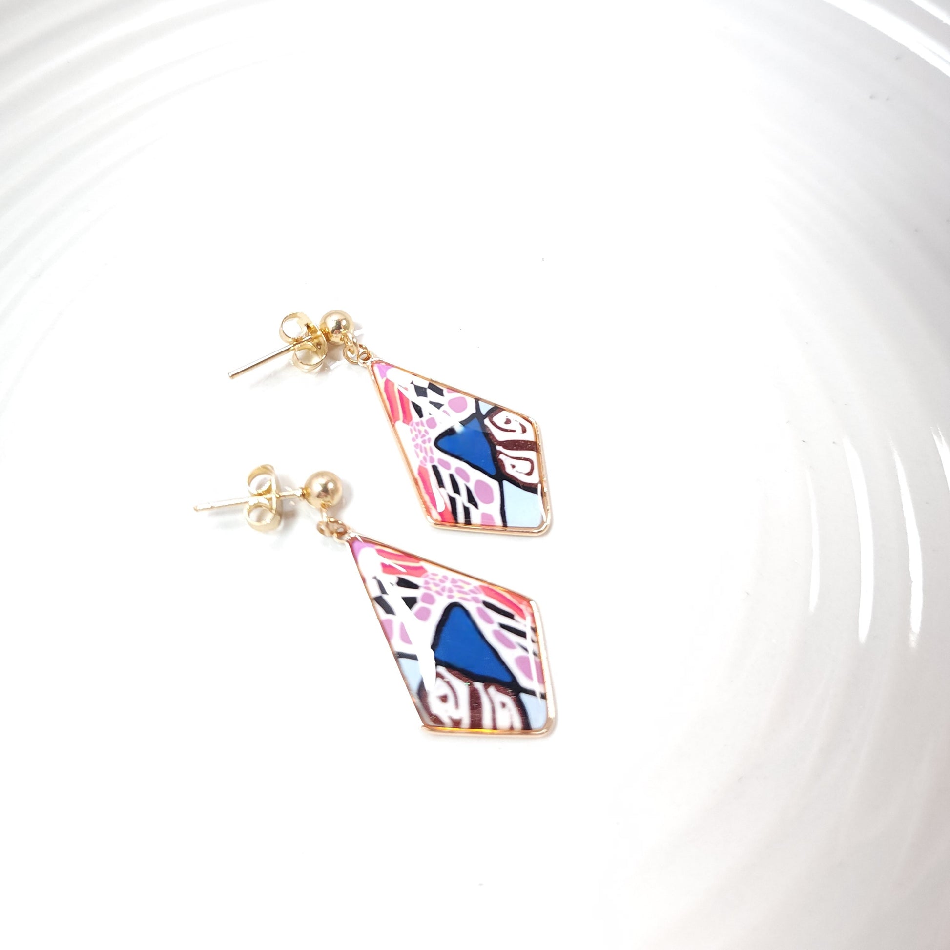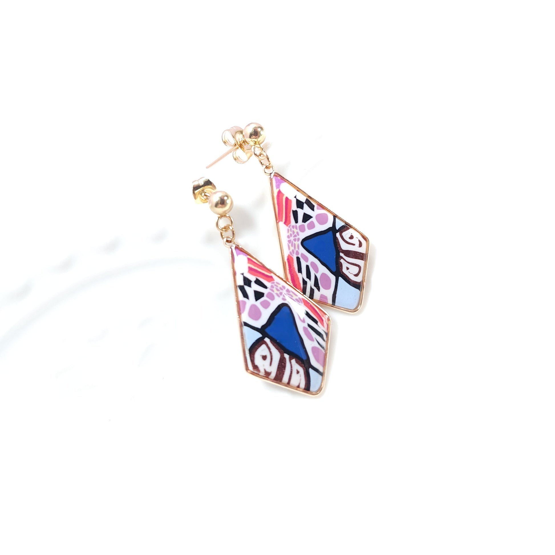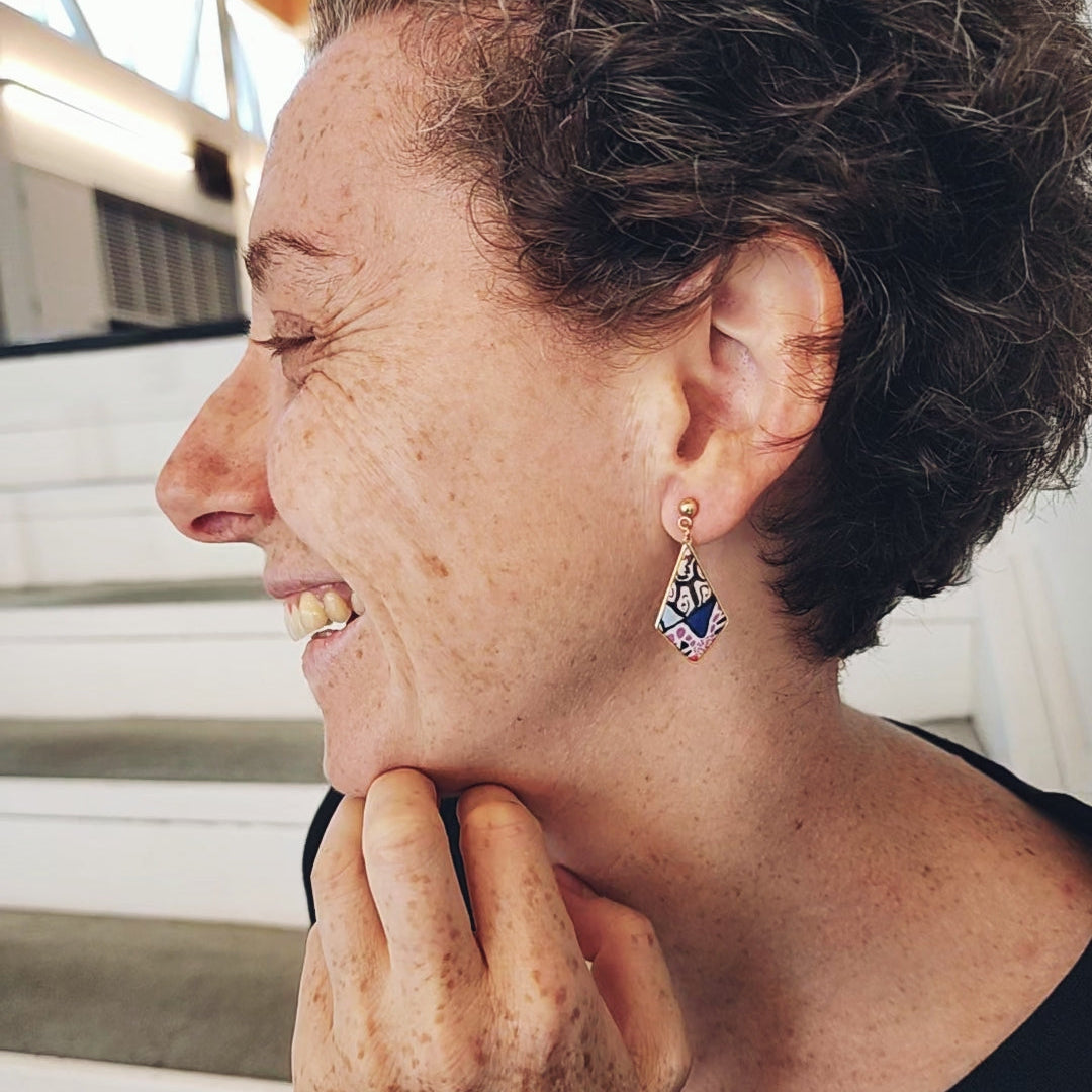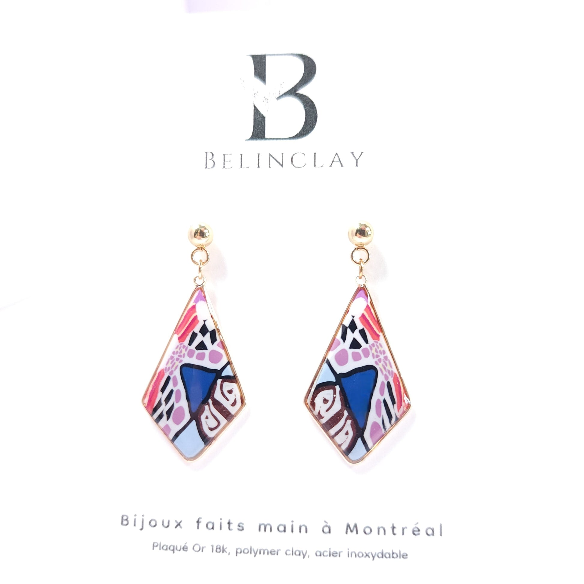 Les boucles Kaleida se distinguent par leurs nuances vibrantes de rose, de violet, de marron et de bleu soulignées de contours noirs, évoquant l’énergie joyeuse et colorée des motifs kaléidoscopiques. Le motif abstrait multicolore, entièrement façonné à la main en argile polymère, rend chaque paire unique et empreinte de caractère.