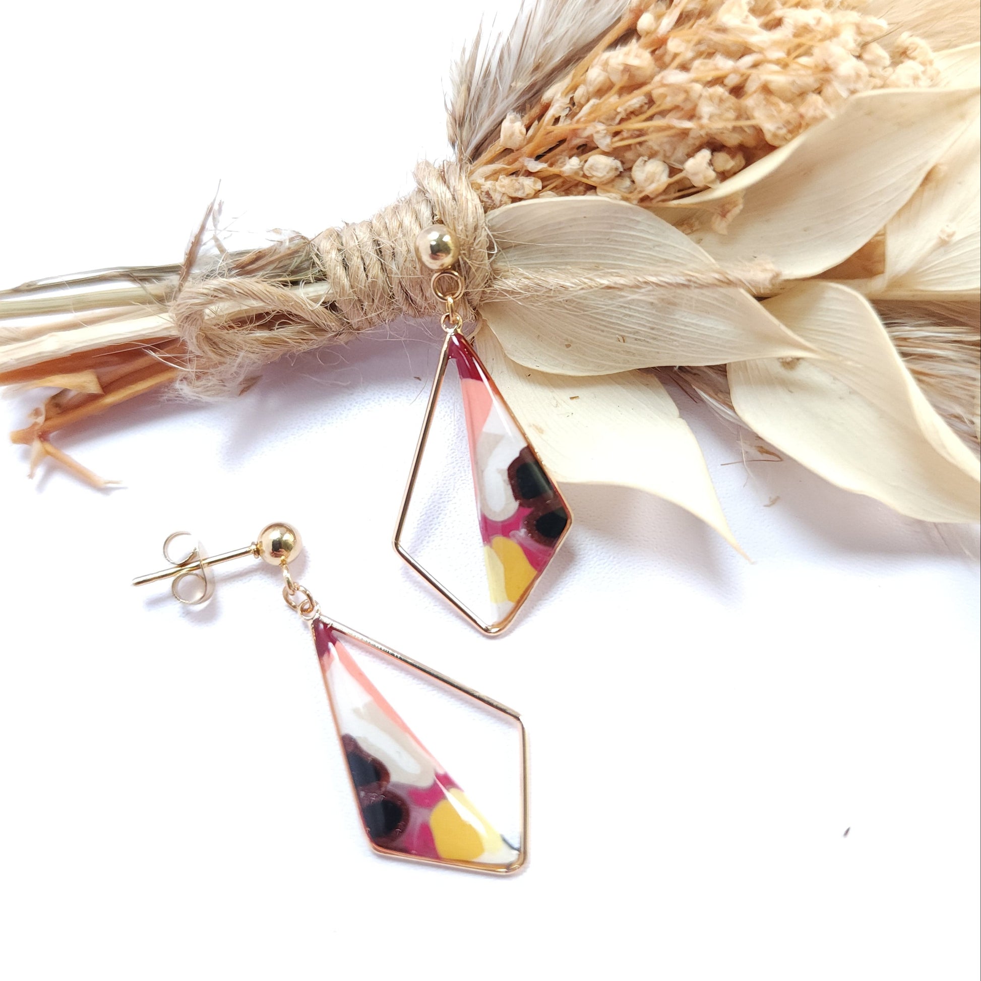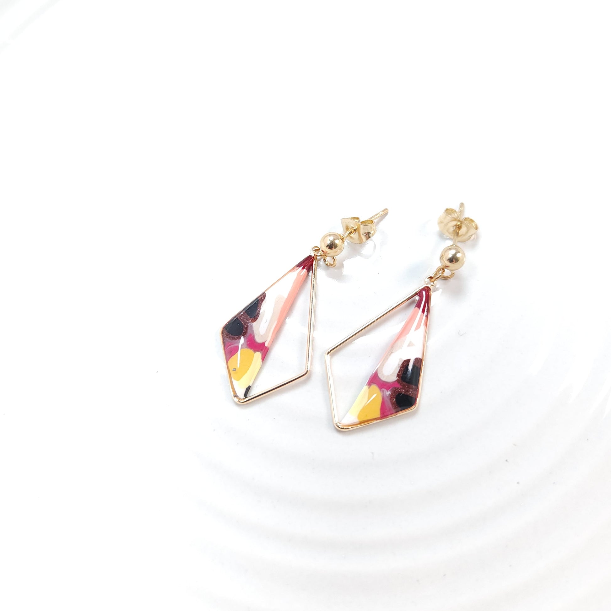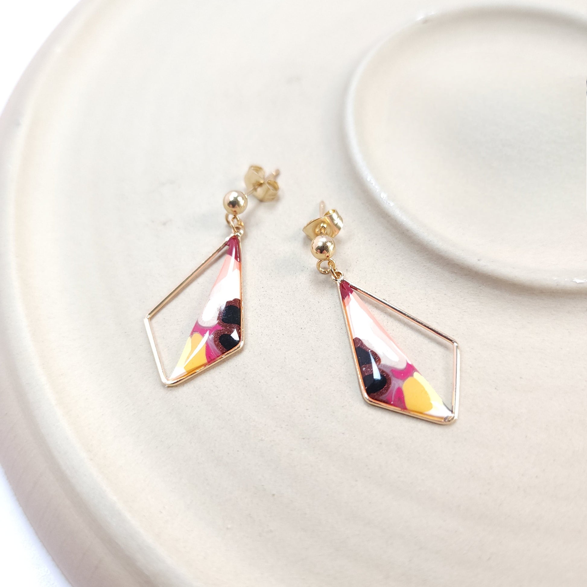 Les boucles soleís se distinguent par leurs nuances lumineuses de rose, de jaune et de touches sombres, évoquant un éclat en mouvement, comme un rayon de lumière qui se diffracte. Le motif géométrique, façonné à la main en argile polymère, offre une composition unique où chaque détail révèle un geste artisanal attentif et délicat.