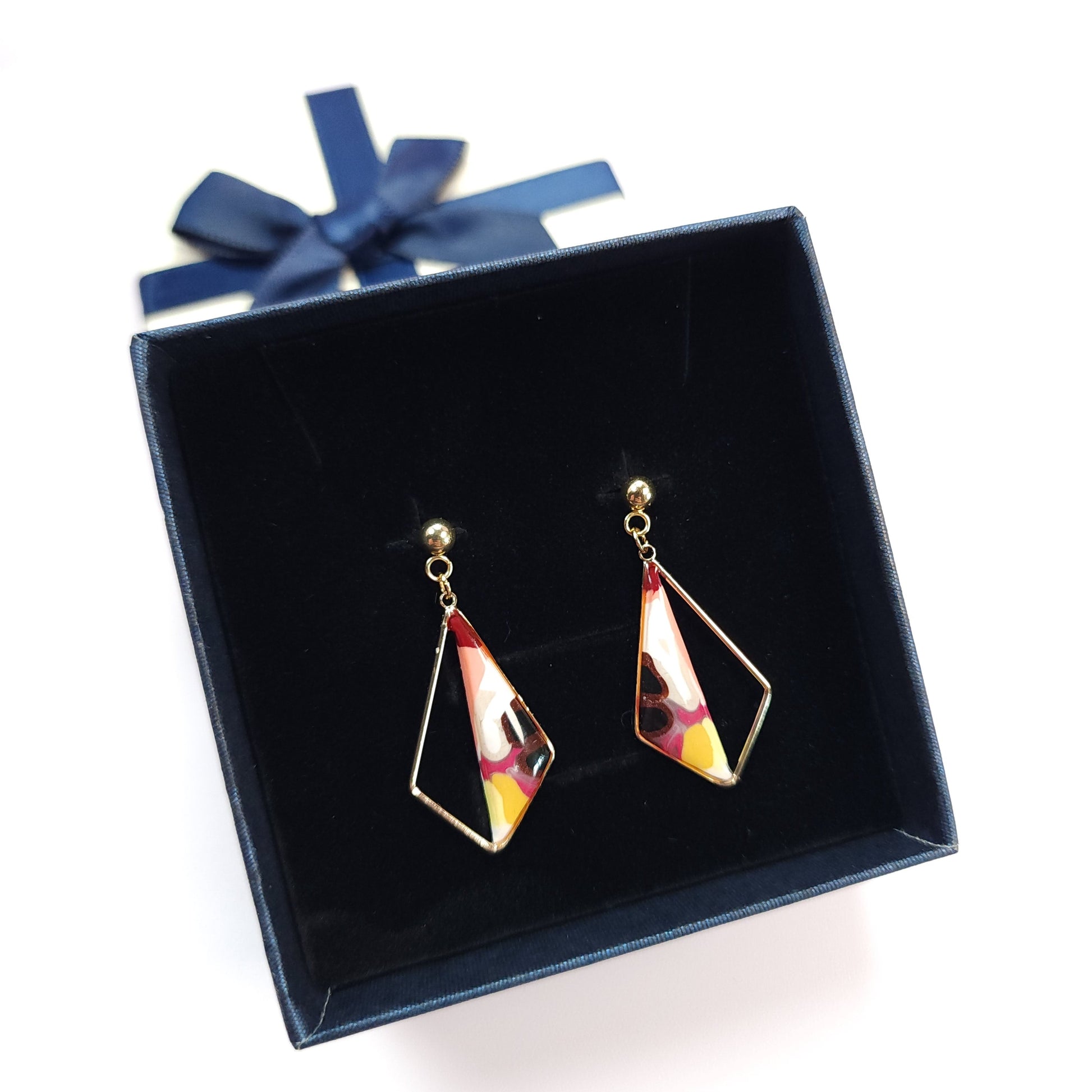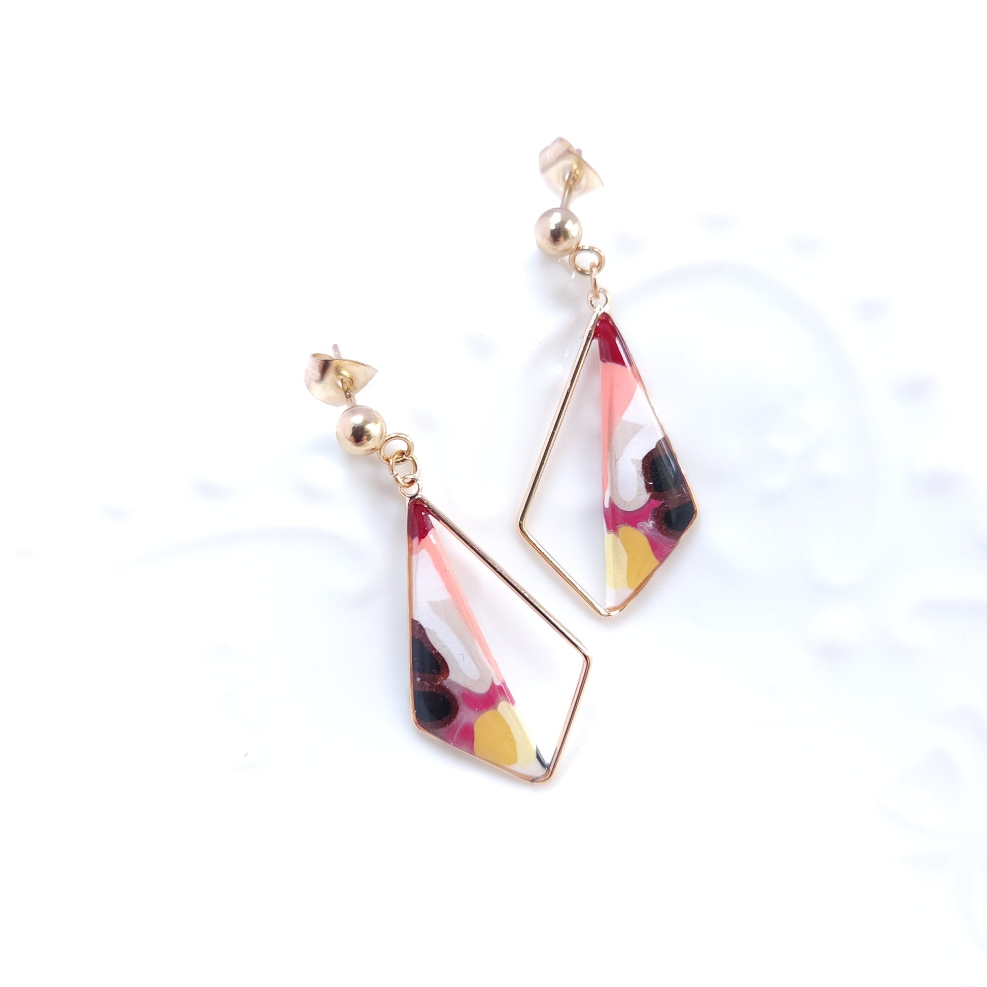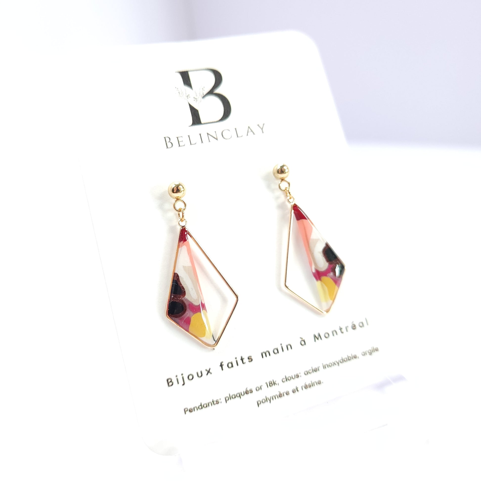 Les boucles soleís se distinguent par leurs nuances lumineuses de rose, de jaune et de touches sombres, évoquant un éclat en mouvement, comme un rayon de lumière qui se diffracte. Le motif géométrique, façonné à la main en argile polymère, offre une composition unique où chaque détail révèle un geste artisanal attentif et délicat.