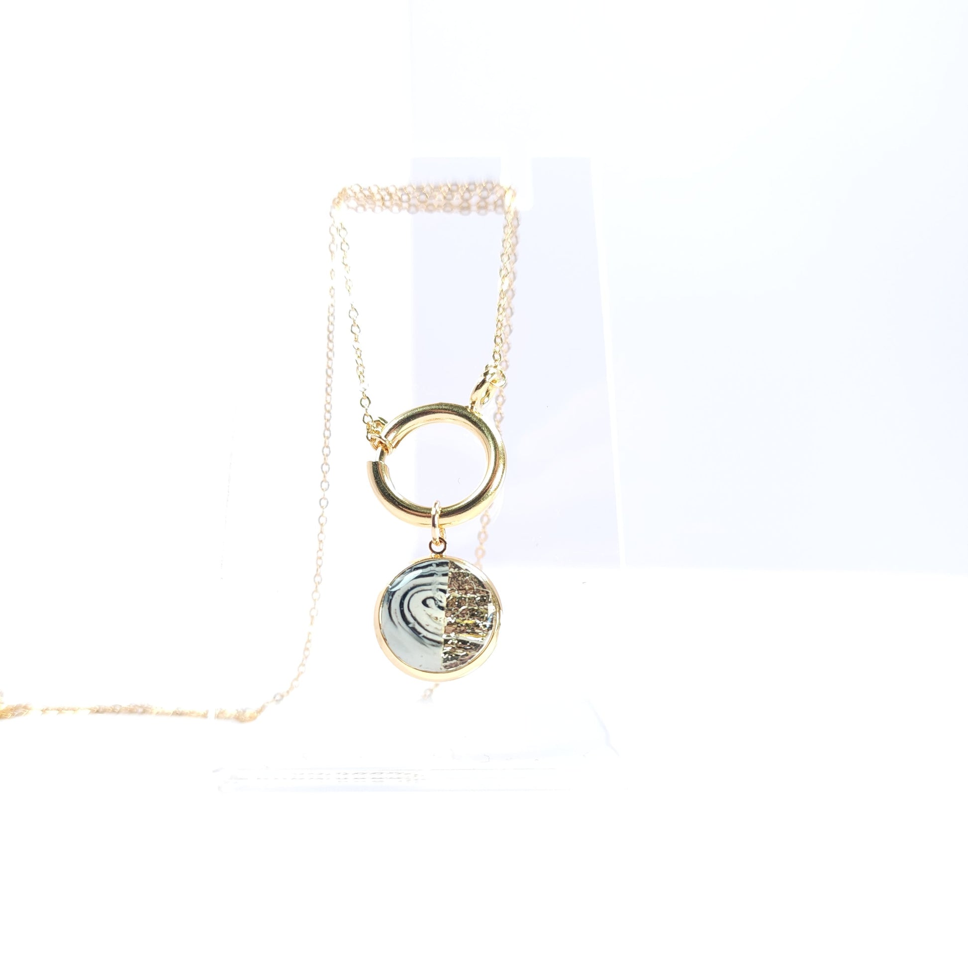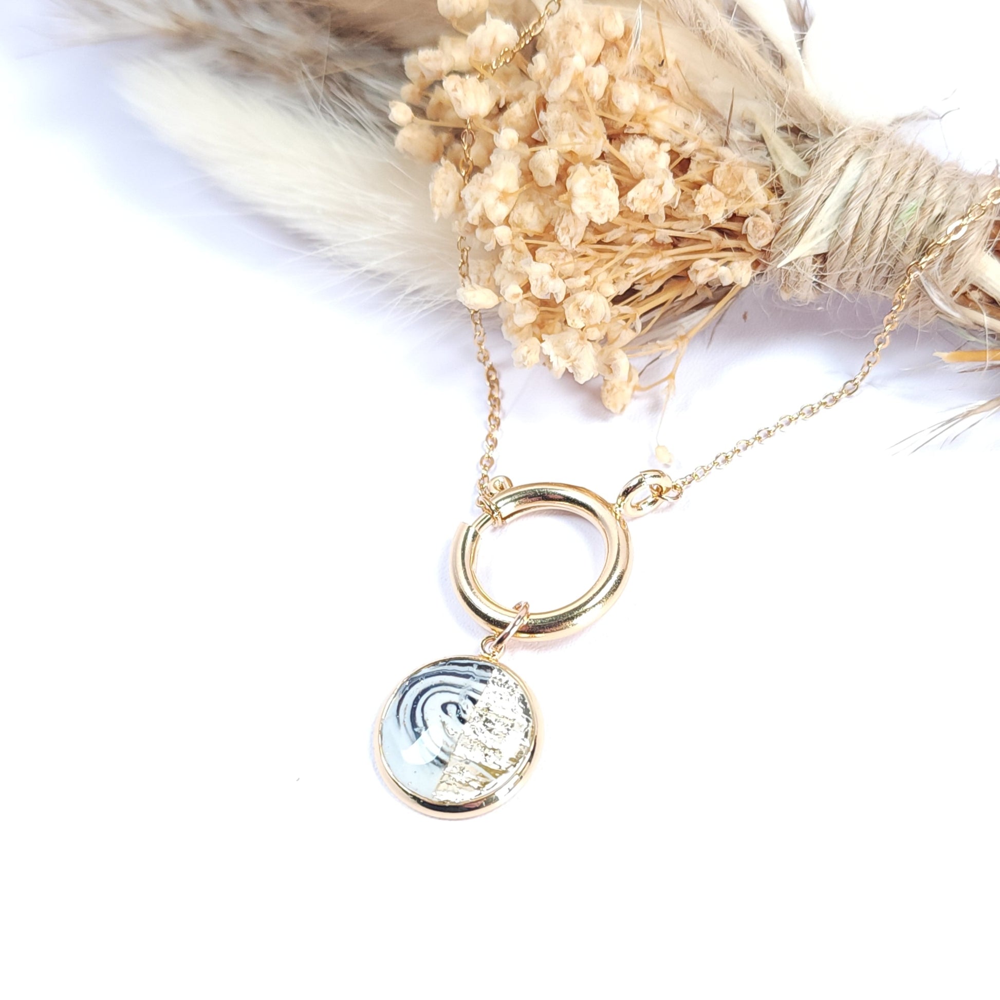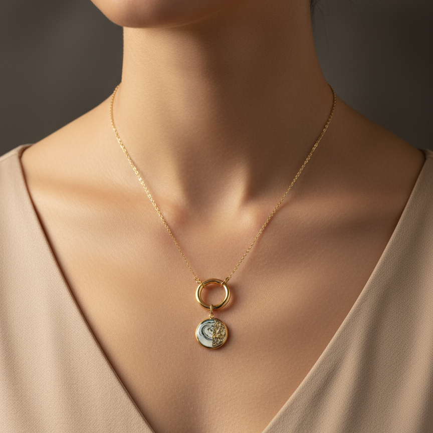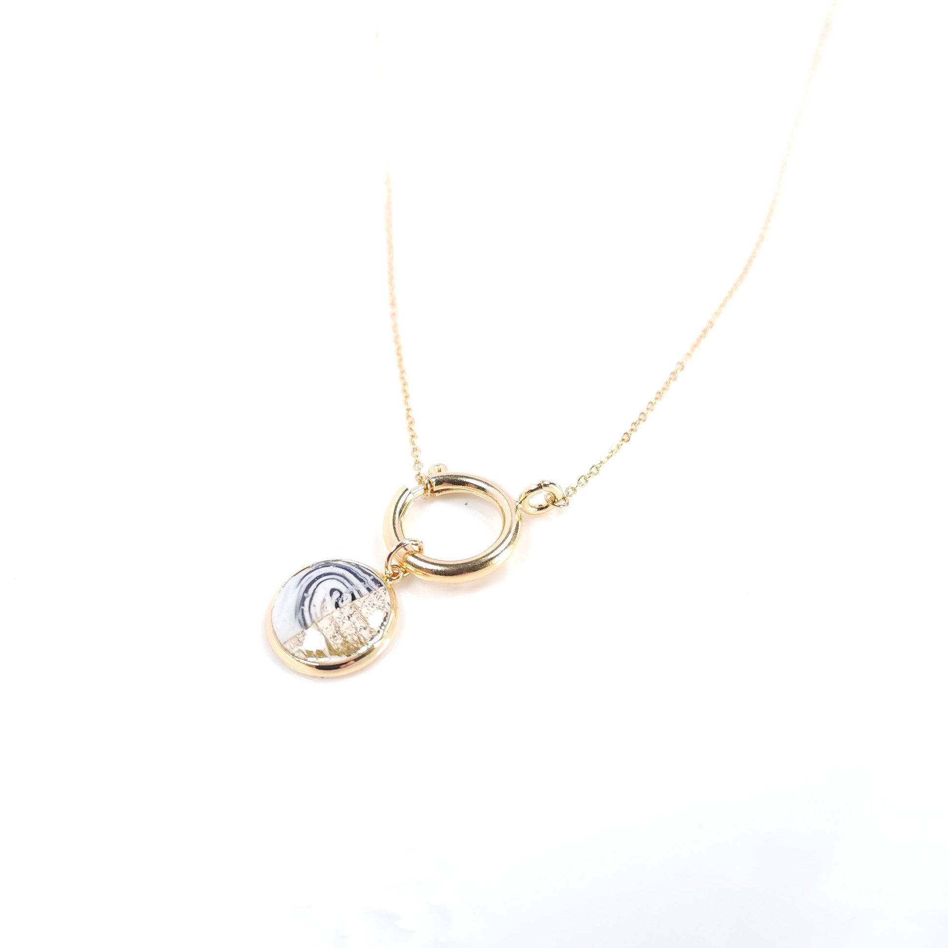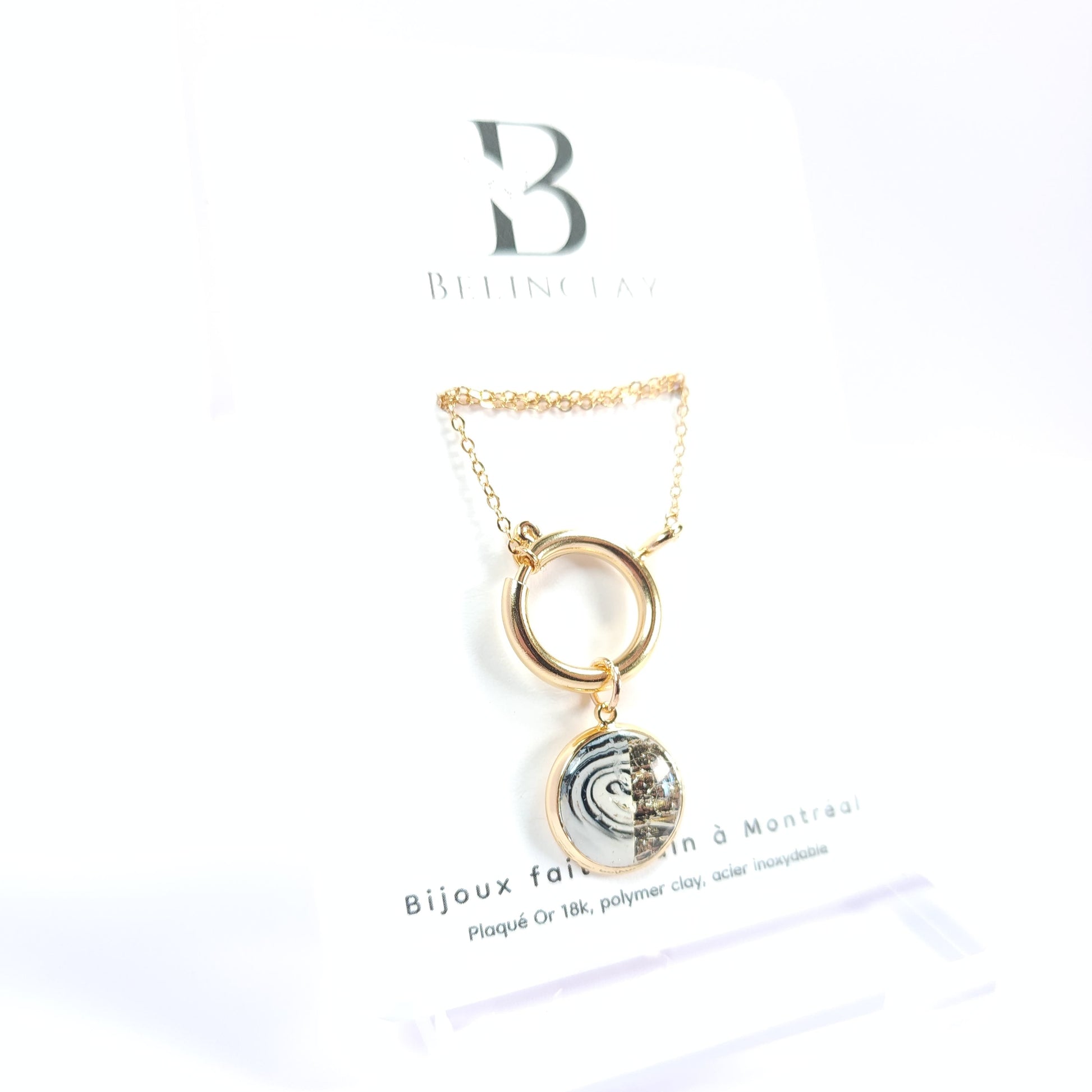 Son pendentif, façonné à la main en argile polymère et sublimé d’une monture en plaqué or 18 carats, révèle un design raffiné, empreint d’équilibre et de caractère.
