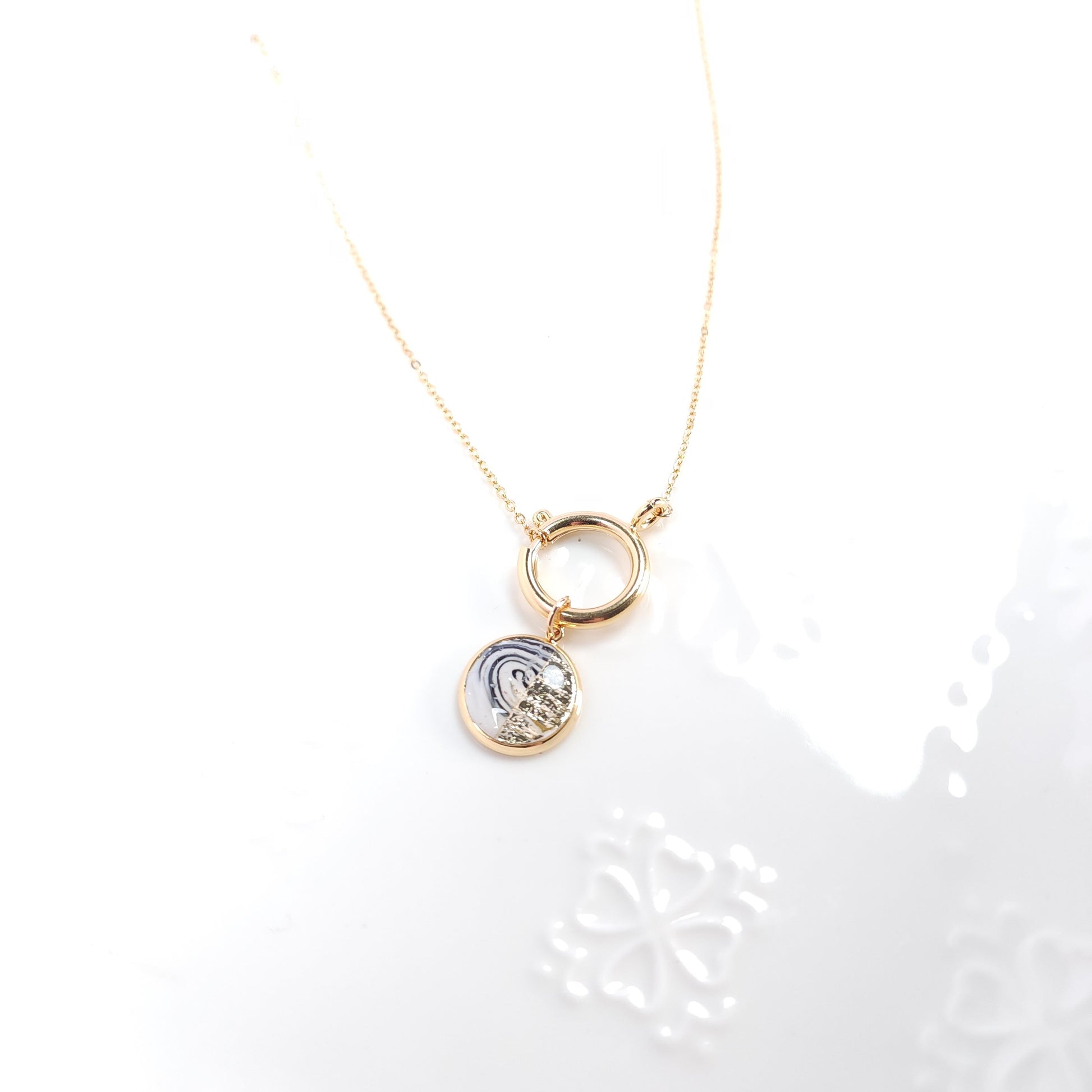 Le collier Marbré d’Or séduit par ses nuances subtiles de blanc et de gris soulignées d’éclats dorés, évoquant l’élégance naturelle du marbre et la chaleur précieuse de l’or.