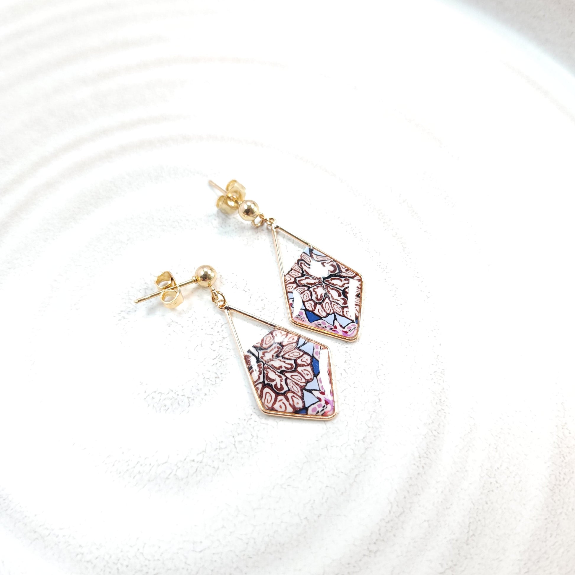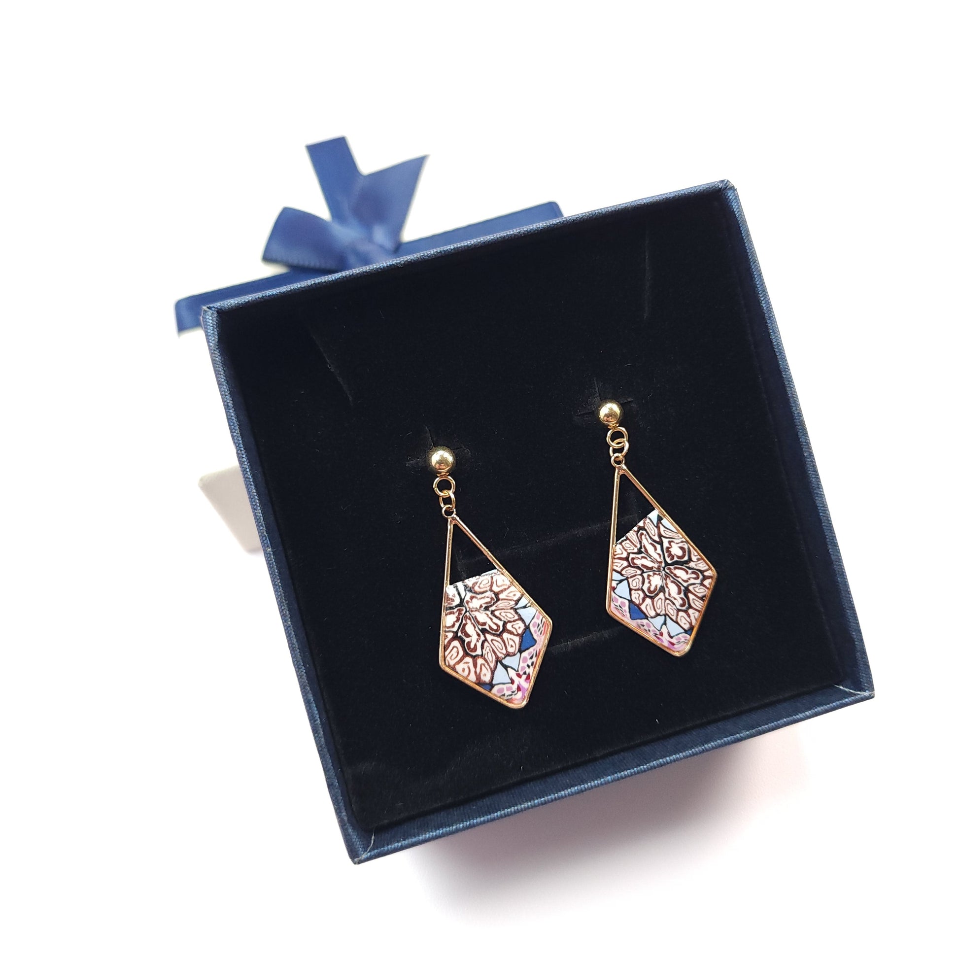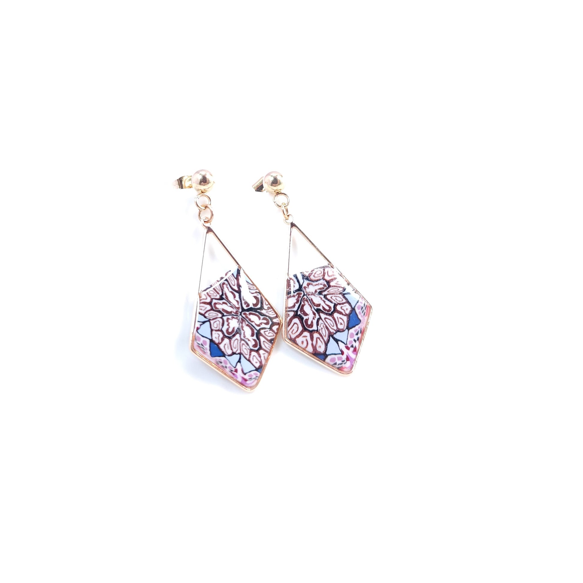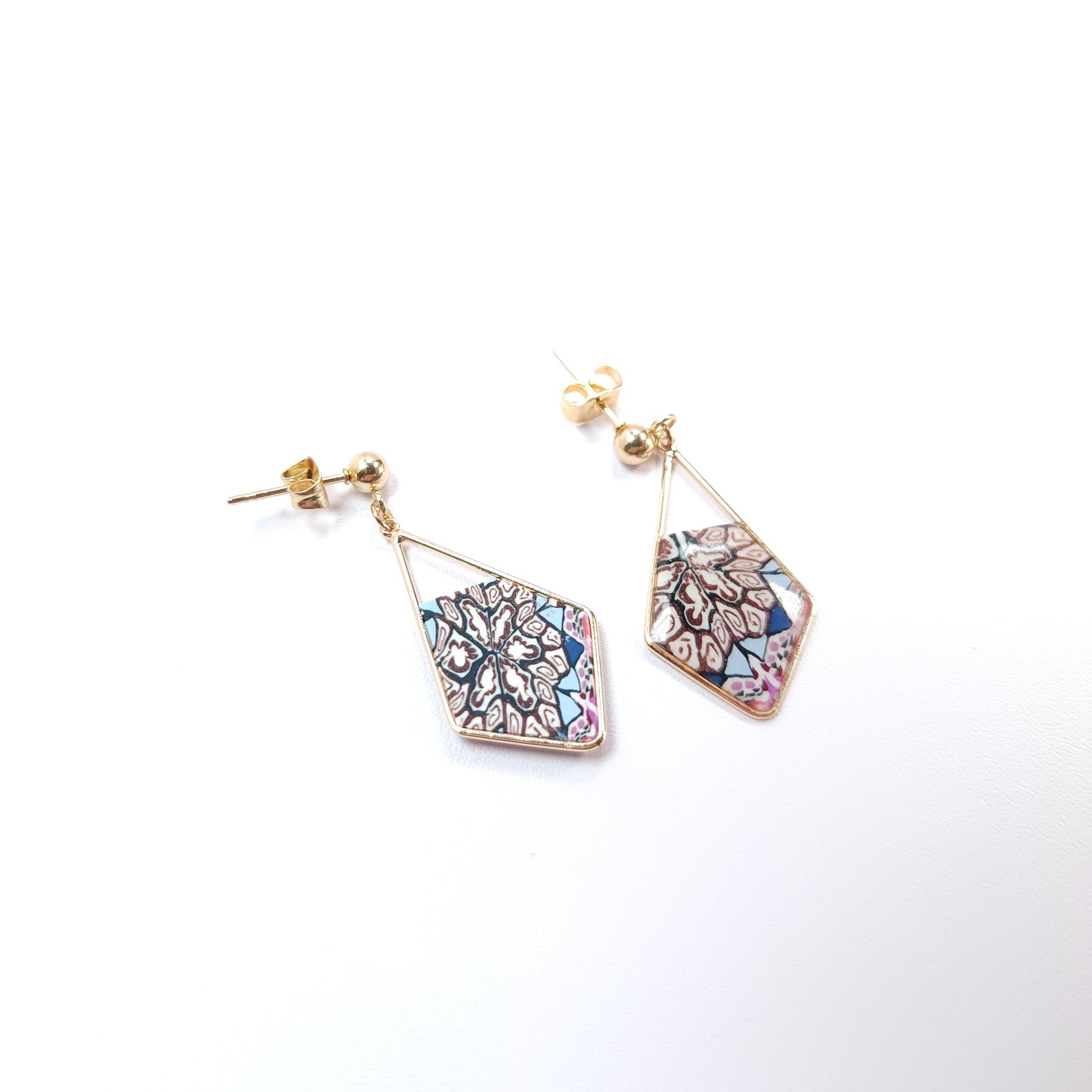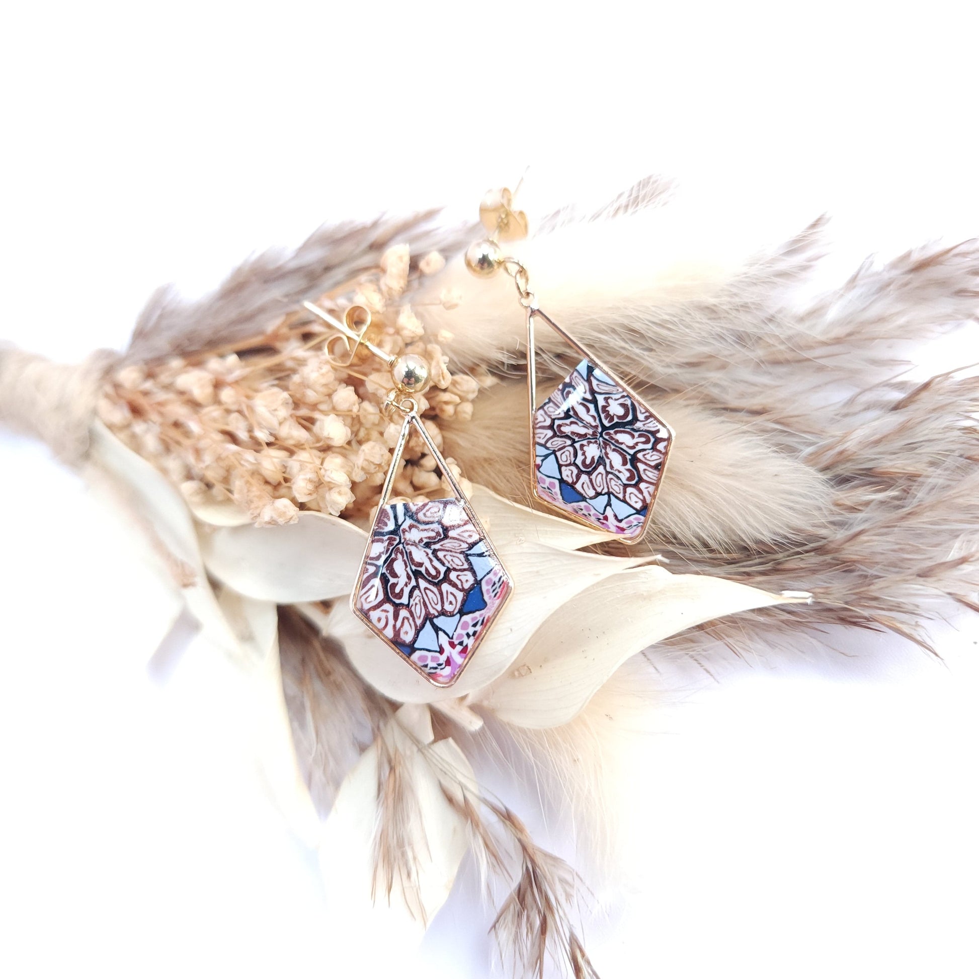 Les boucles mosaïka blue se distinguent par leurs nuances délicates de bleu, lilas et rose, évoquant la finesse d’un motif mosaïque moderne. Le dessin géometrique, entièrement façonné à la main en argile polymère, rend chaque paire unique et empreinte de délicatesse.