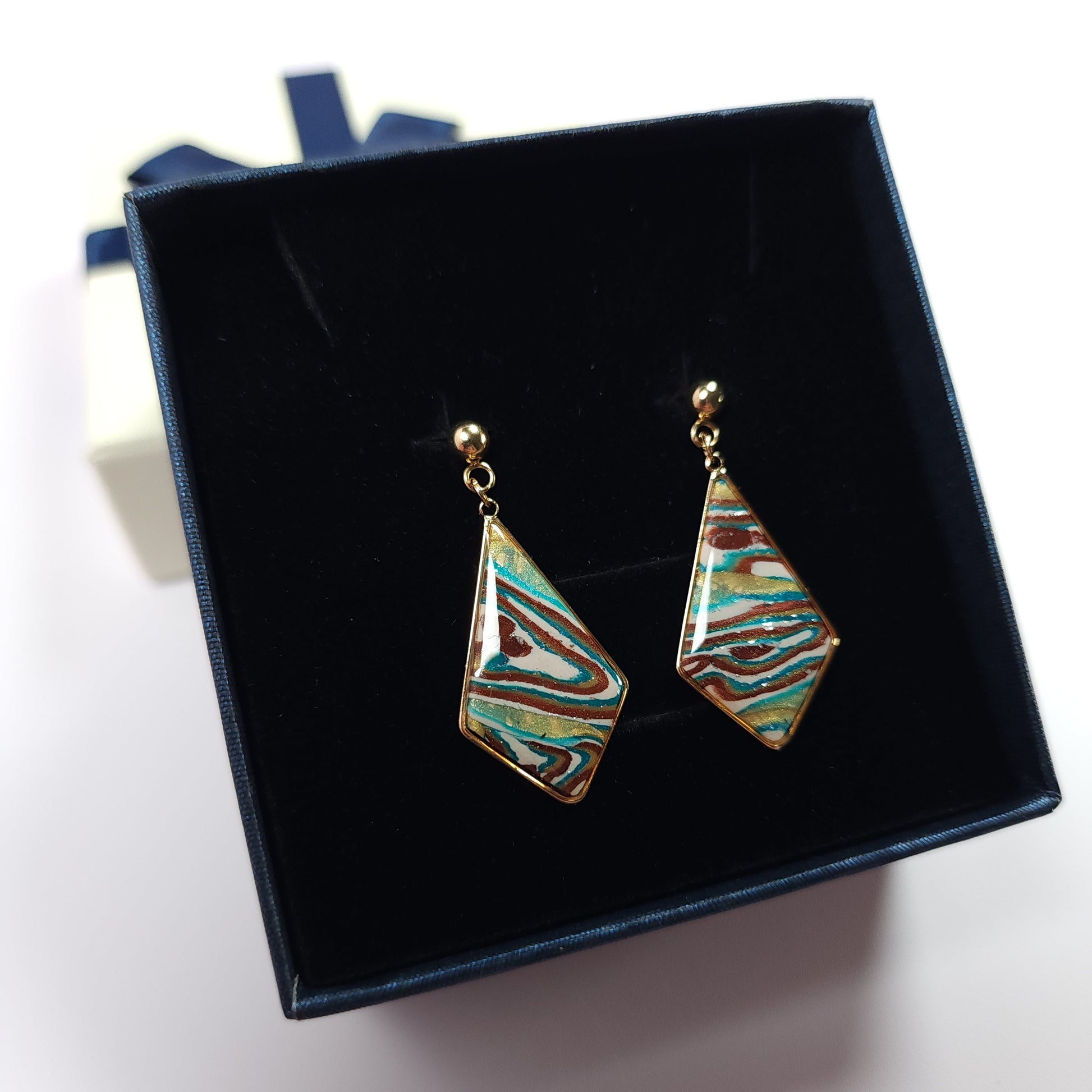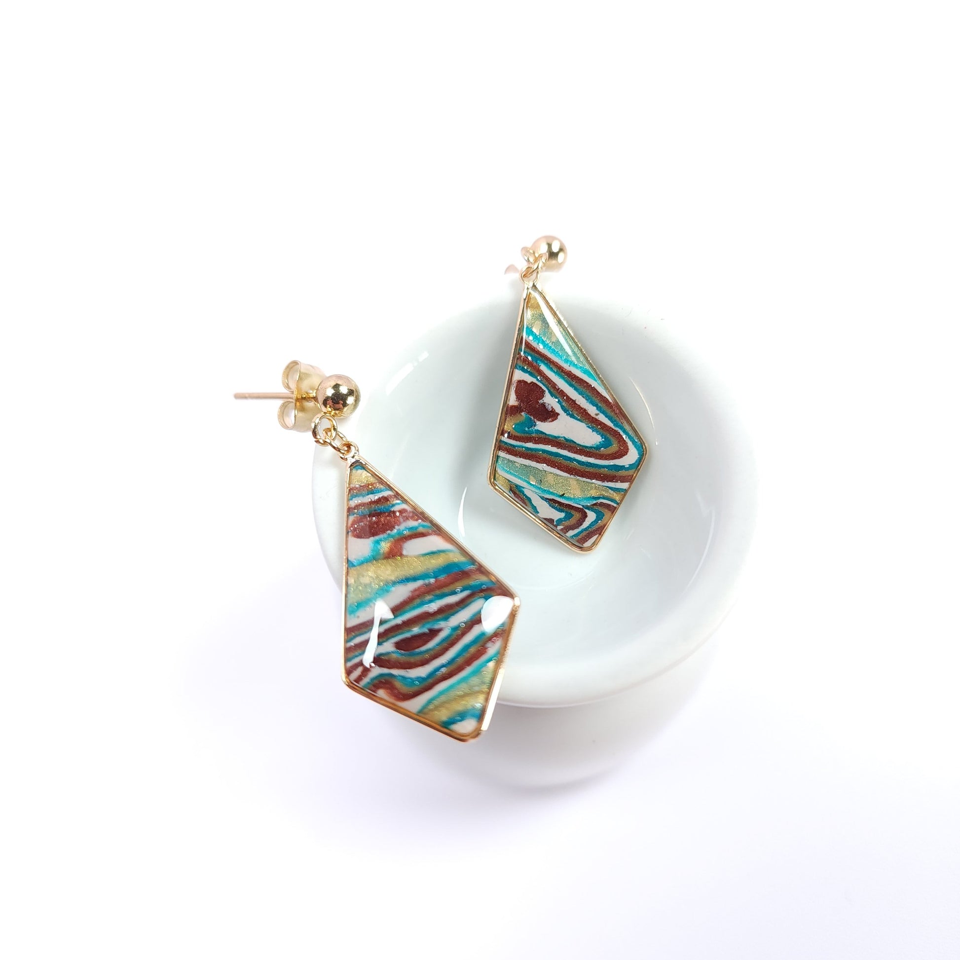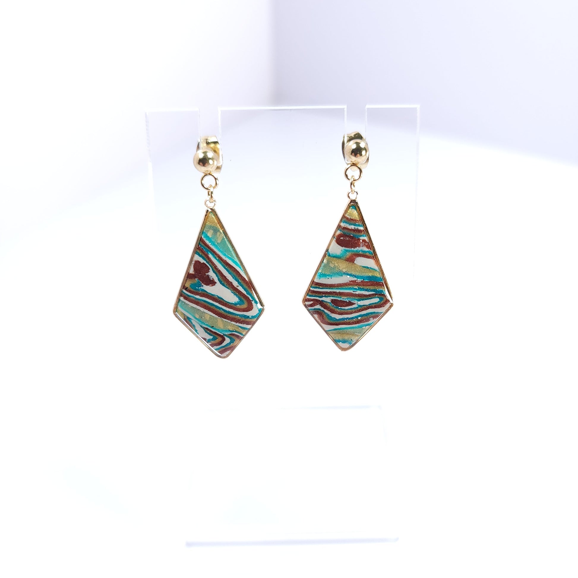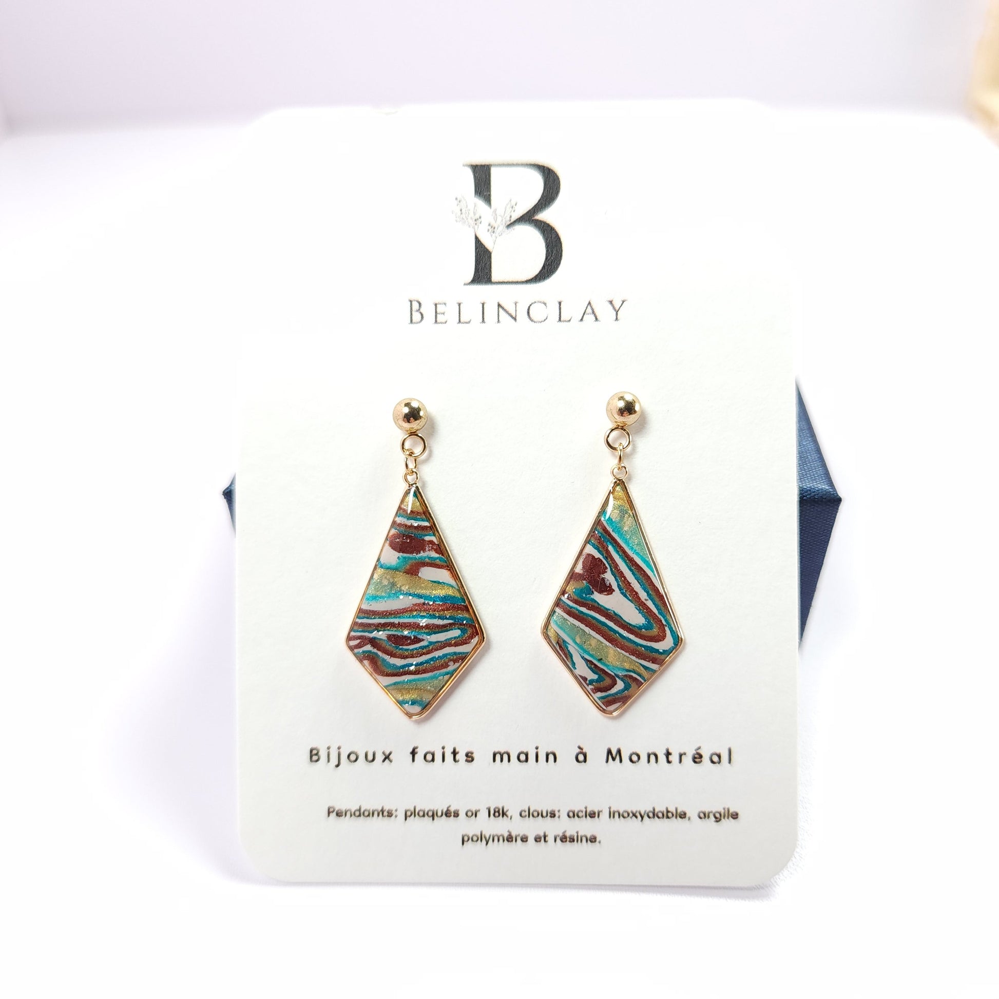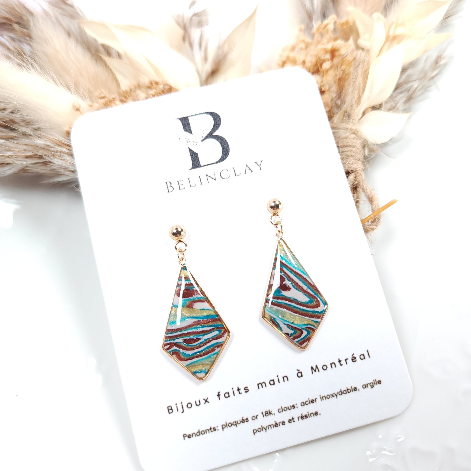 Les boucles d’oreilles Oasis évoquent la rencontre entre la terre et l’eau, avec leurs teintes vibrantes et leur design géométrique. Leur forme losange met en valeur un motif marbré fait main en argile polymère, mêlant des nuances de turquoise, brun et doré pour un effet à la fois naturel et audacieux.