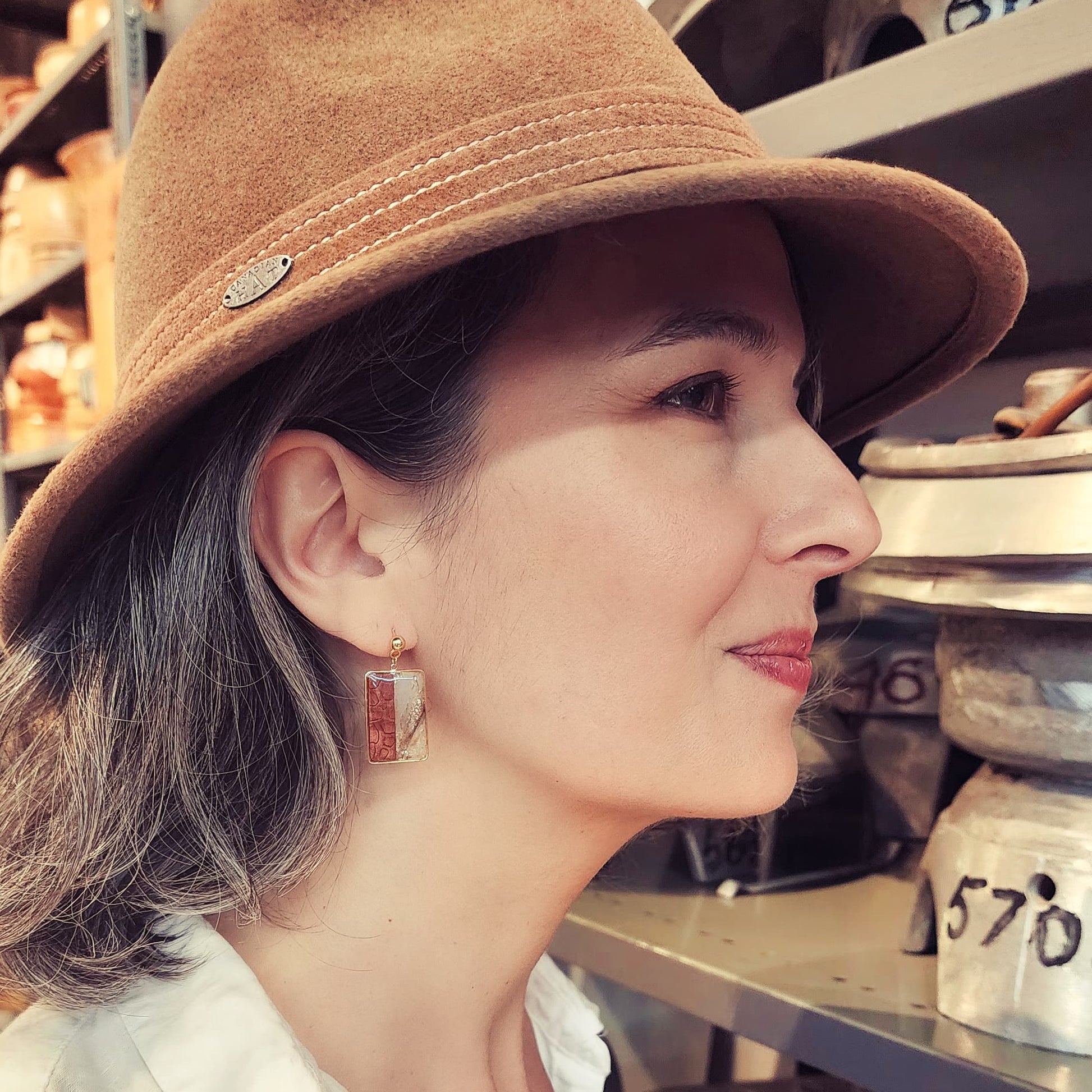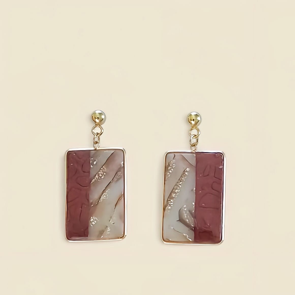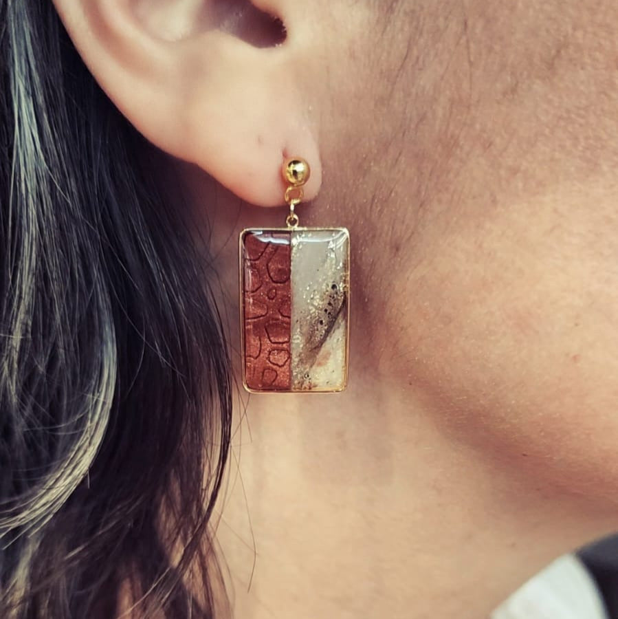Boucles d’oreilles rectangulaires en argile polymère, composées de deux parties : l’une d’un rouge brun à la texture sculptée, l’autre d’un beige nacré traversé de fines inclusions dorées.