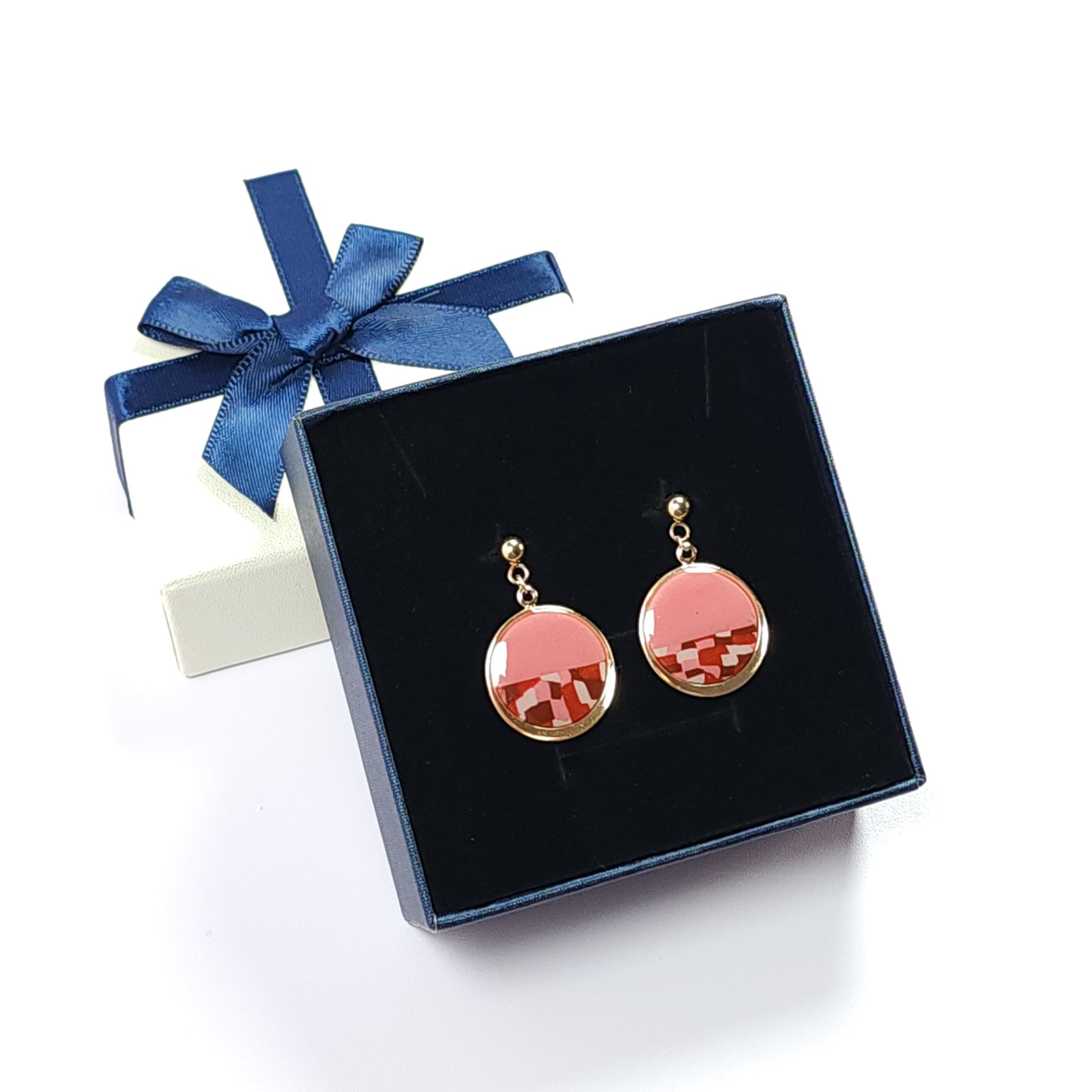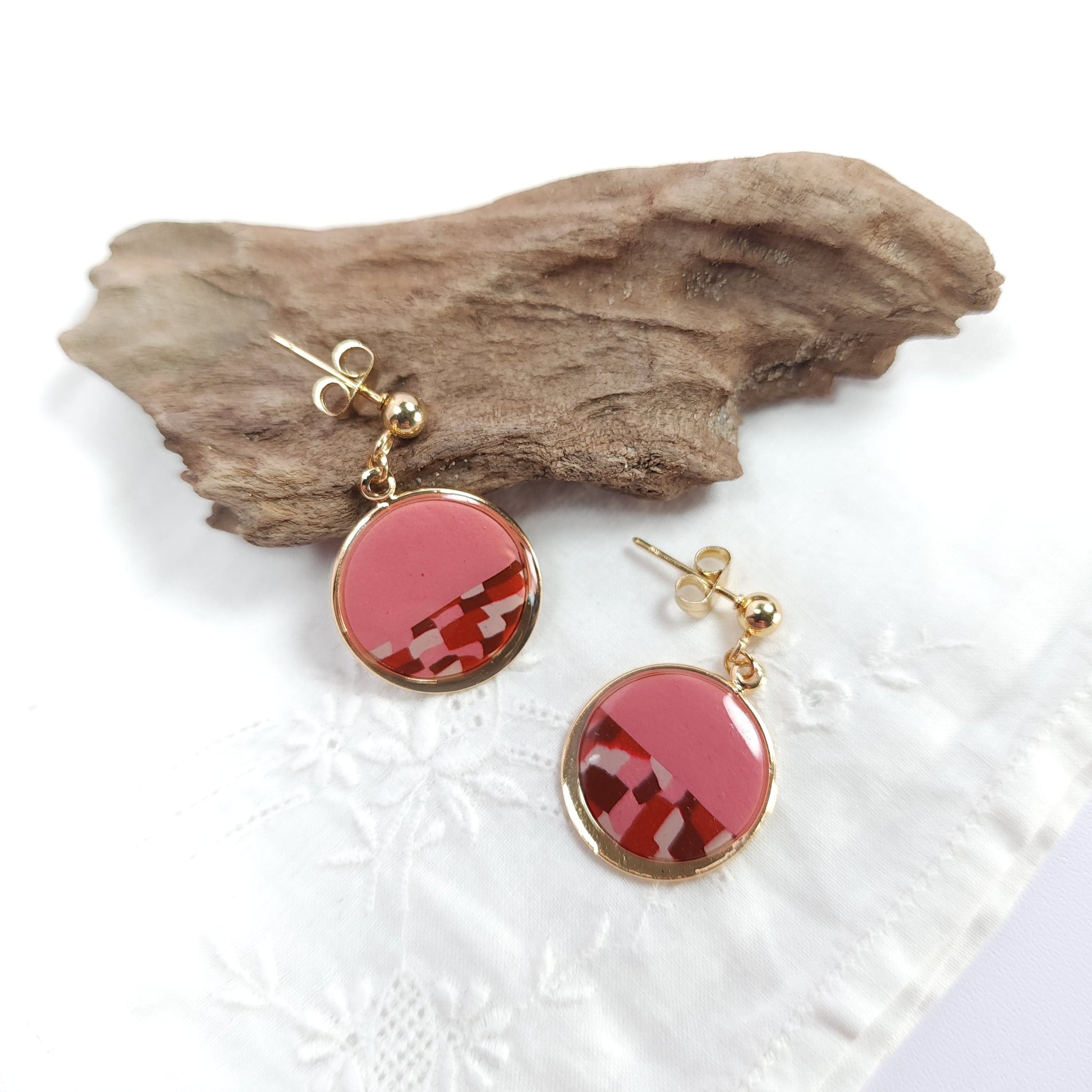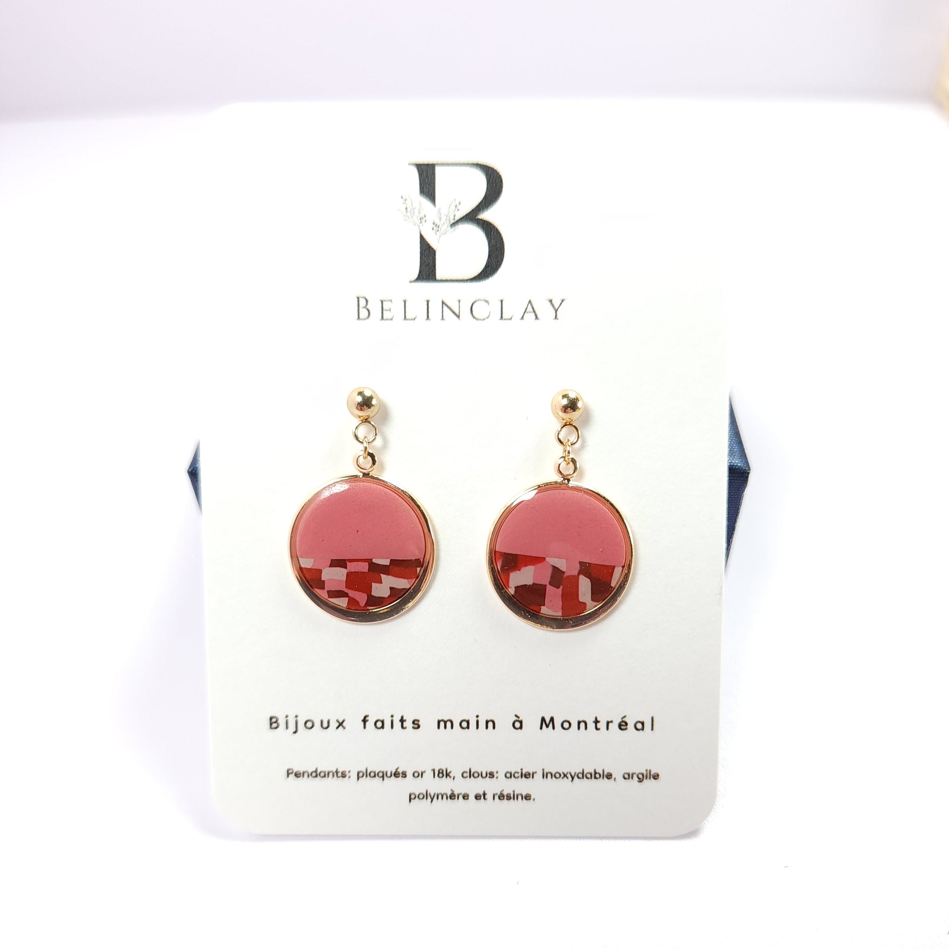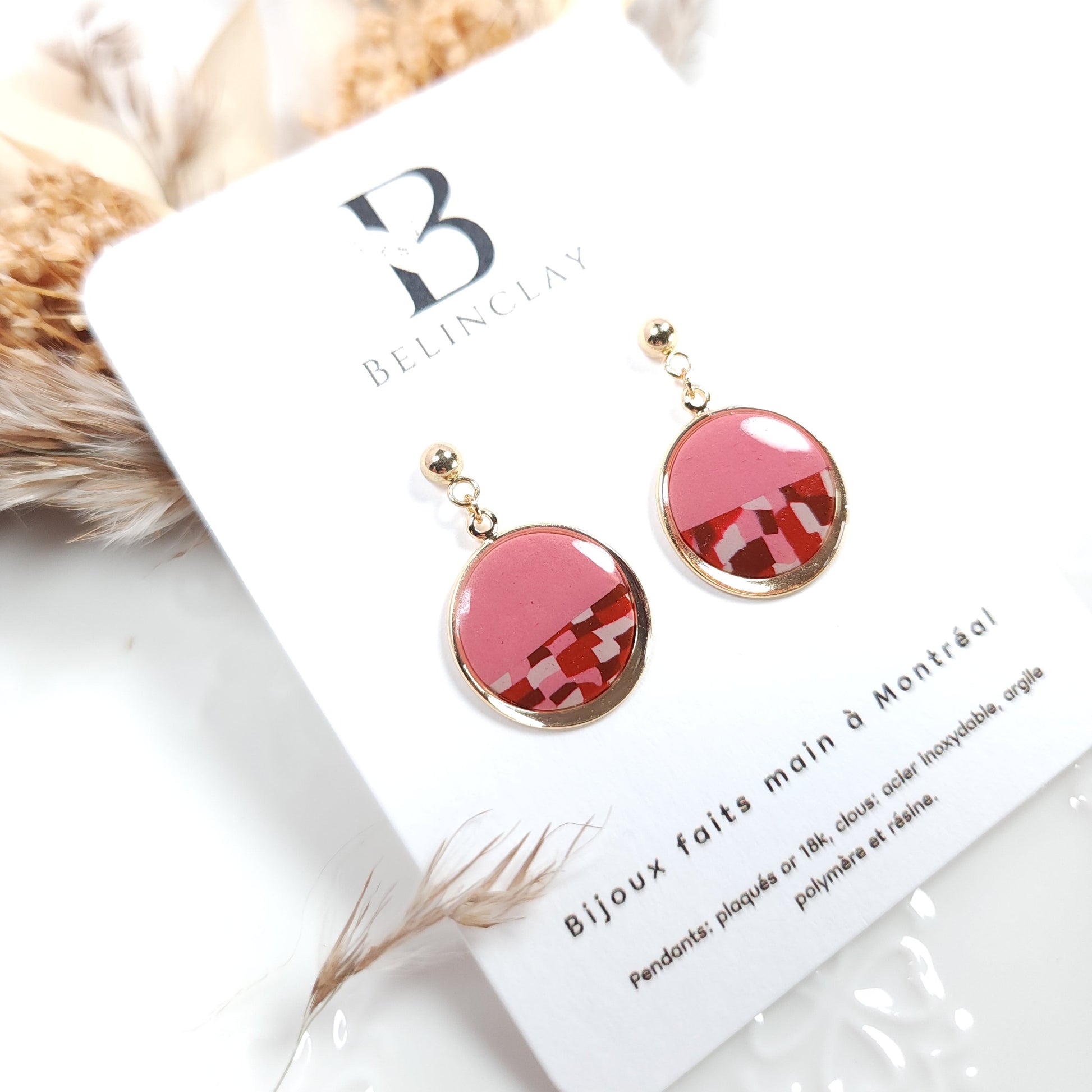 Les boucles d’oreilles Rose Damier séduisent par leur allure chic et contemporaine. Leur forme ronde révèle un motif graphique en damier, réalisé à la main en argile polymère, mêlant un rose doux et un rouge profond pour un contraste raffiné.