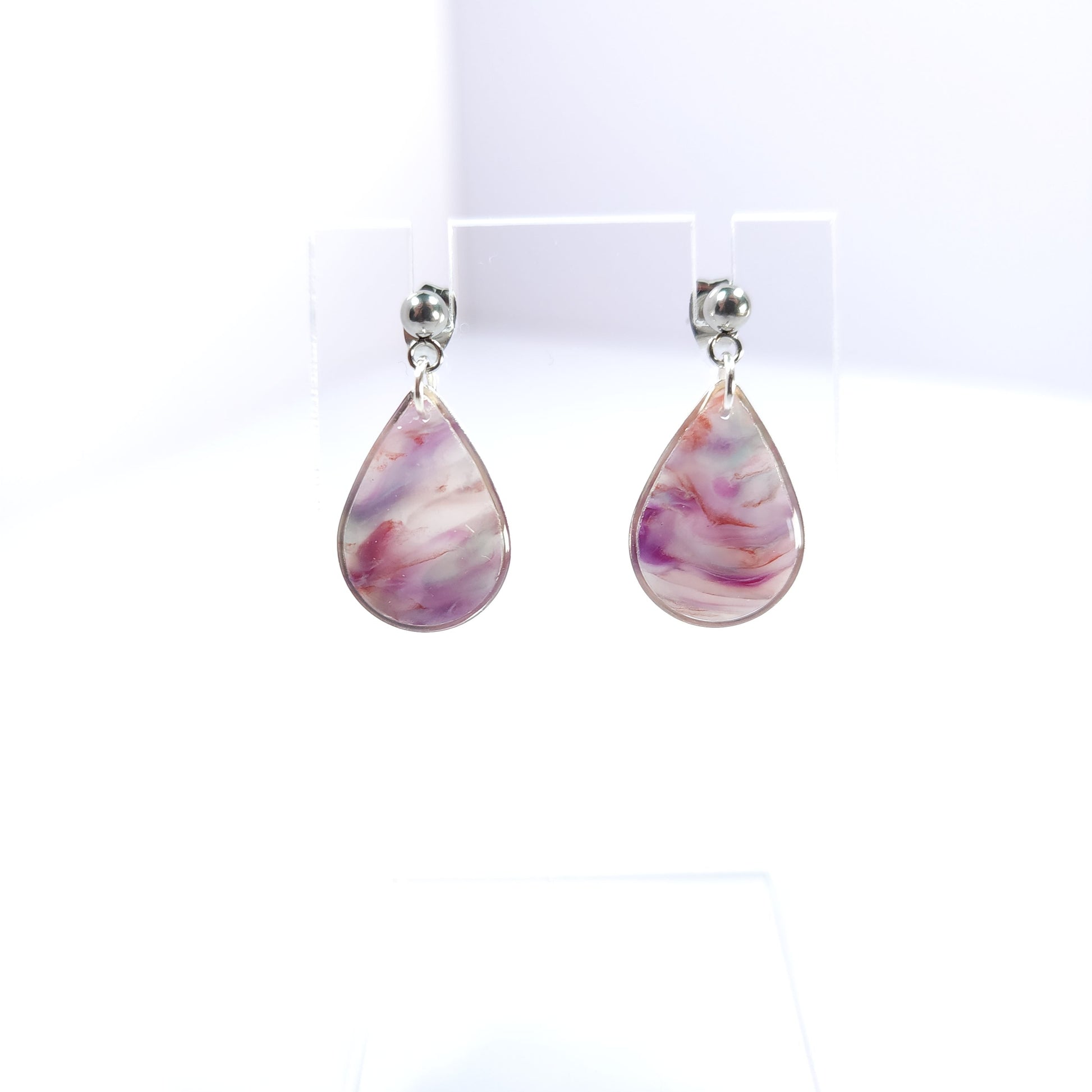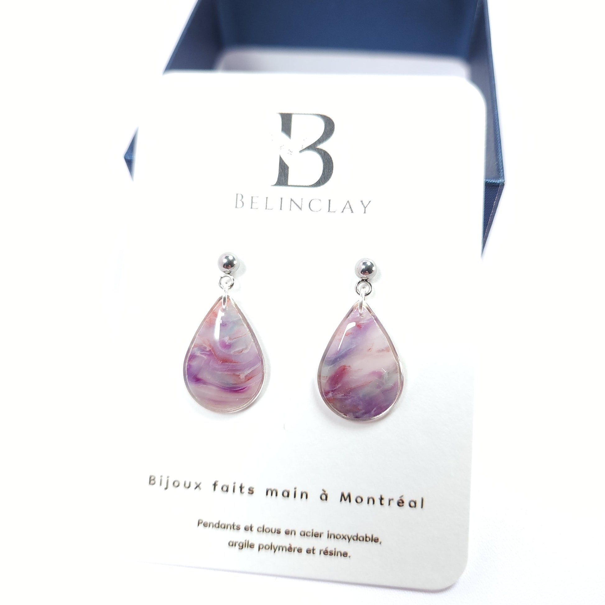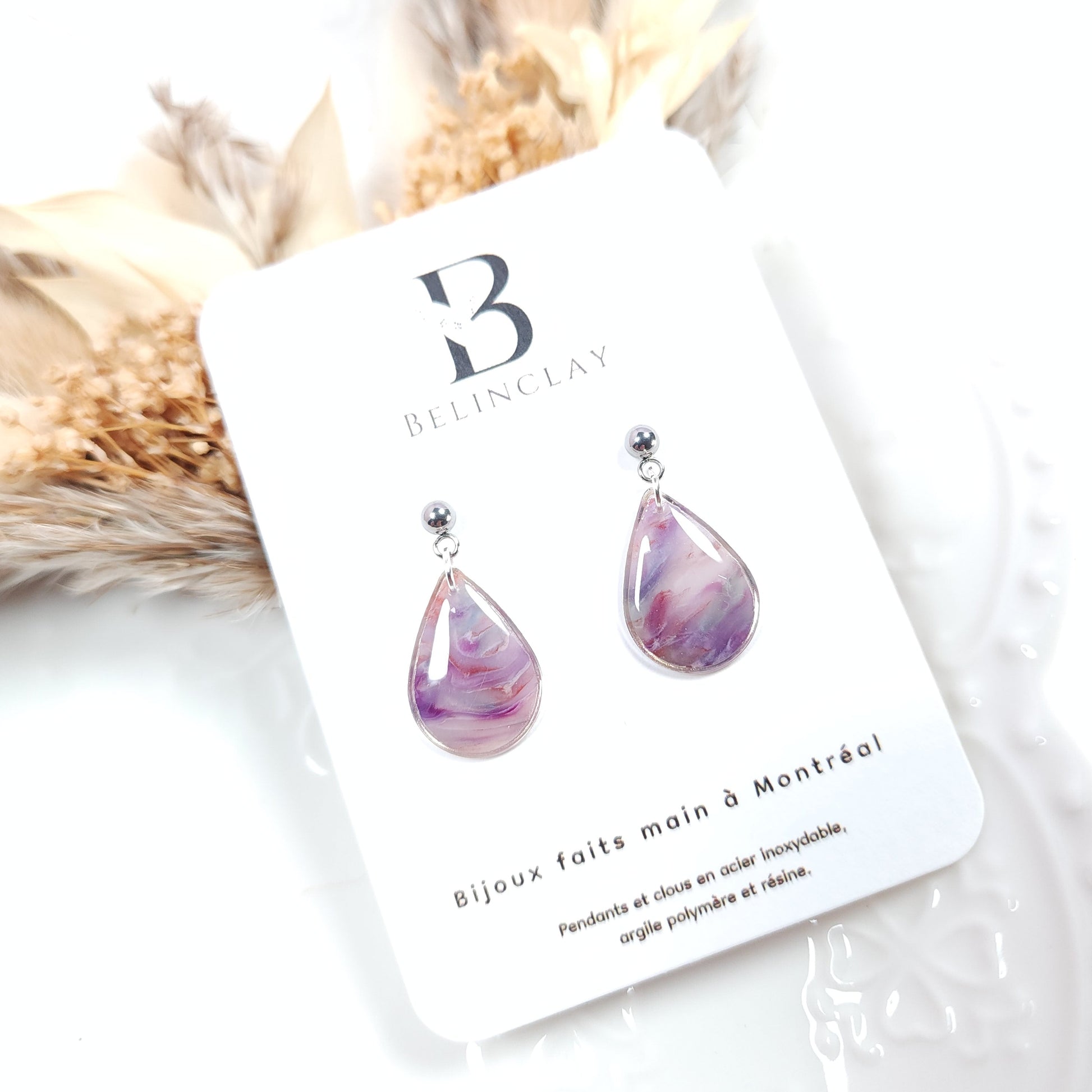 Les boucles d’oreilles Rosée d’Aurore séduisent par leur douceur et leur éclat délicat. Leur forme goutte élégante révèle un motif marbré aux nuances de rose, mauve et blanc nacré, évoquant la lumière du matin sur l’horizon. Entièrement réalisé à la main en argile polymère.