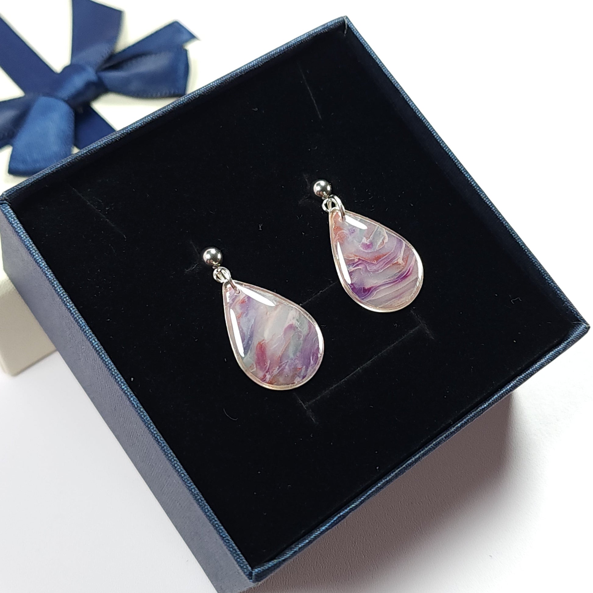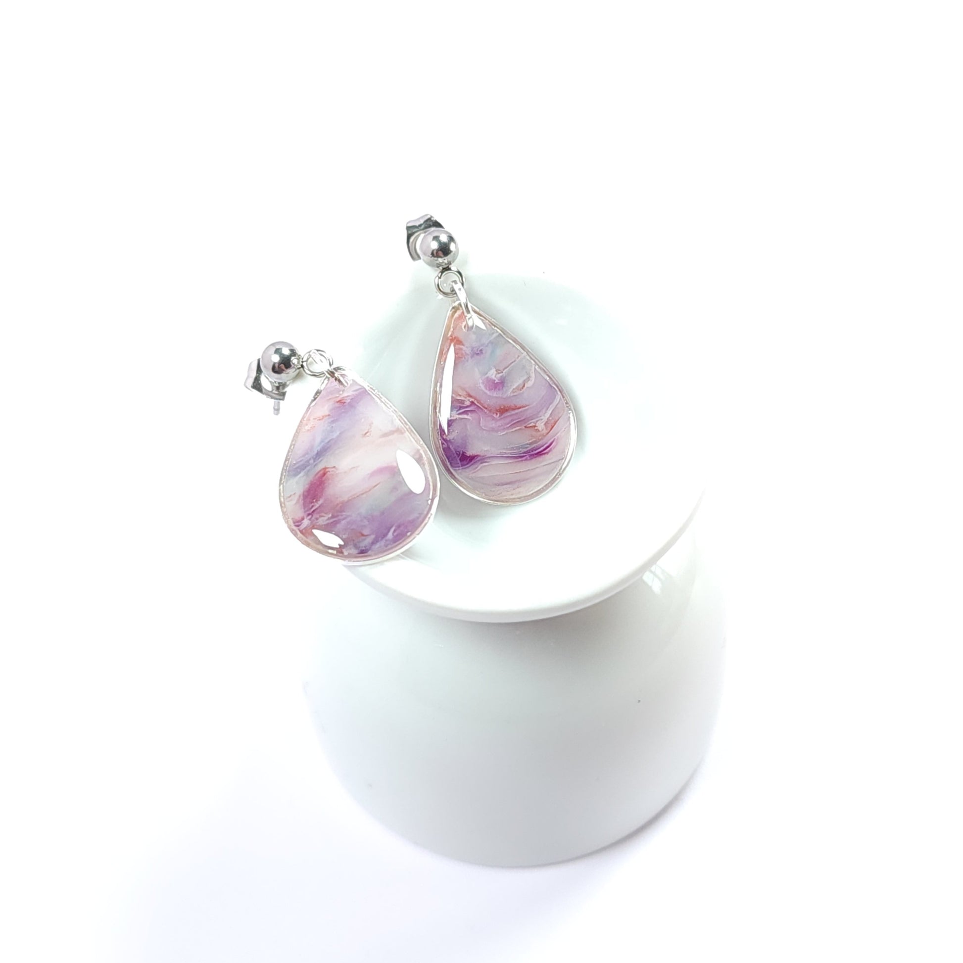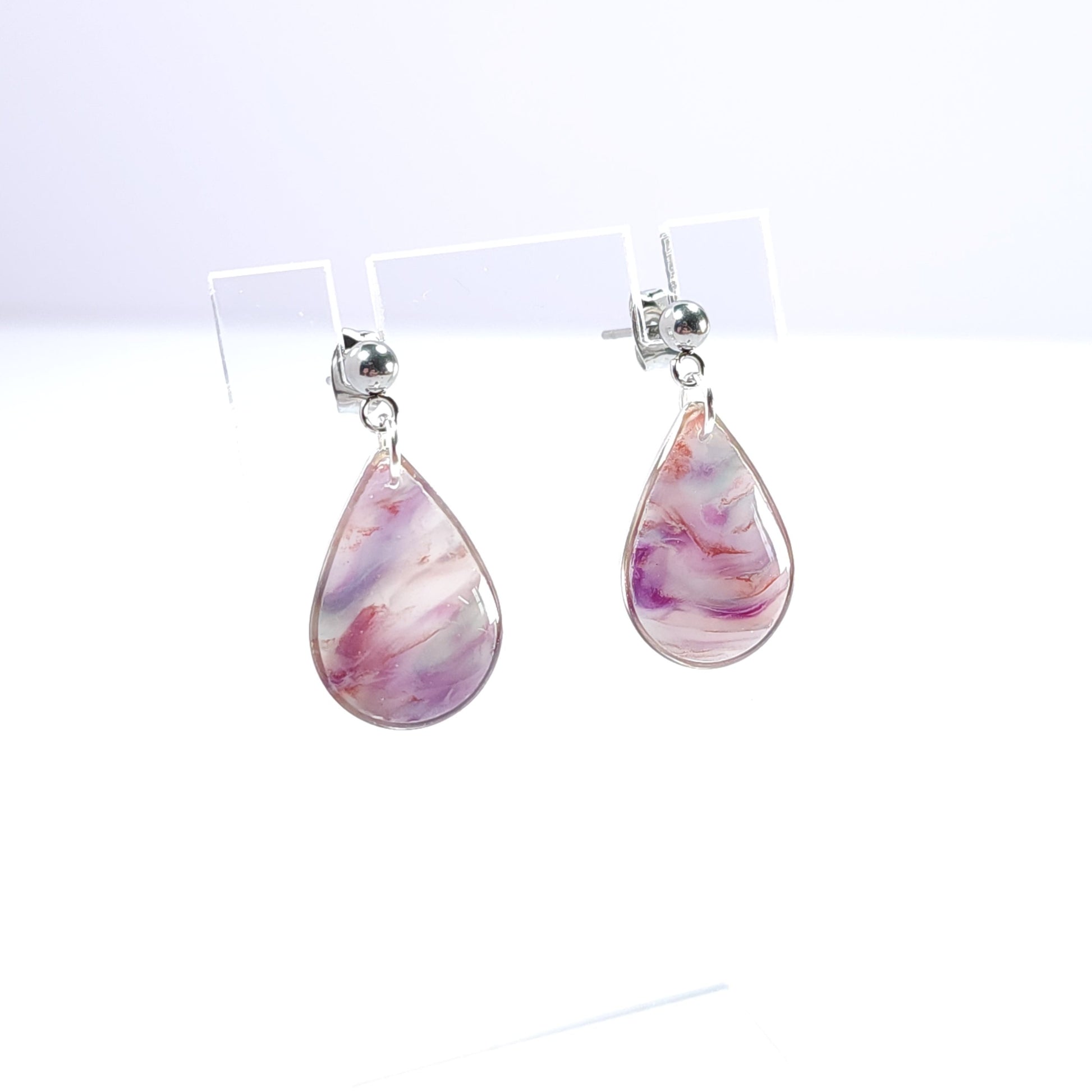 Les boucles d’oreilles Rosée d’Aurore séduisent par leur douceur et leur éclat délicat. Leur forme goutte élégante révèle un motif marbré aux nuances de rose, mauve et blanc nacré, évoquant la lumière du matin sur l’horizon. Entièrement réalisé à la main en argile polymère.