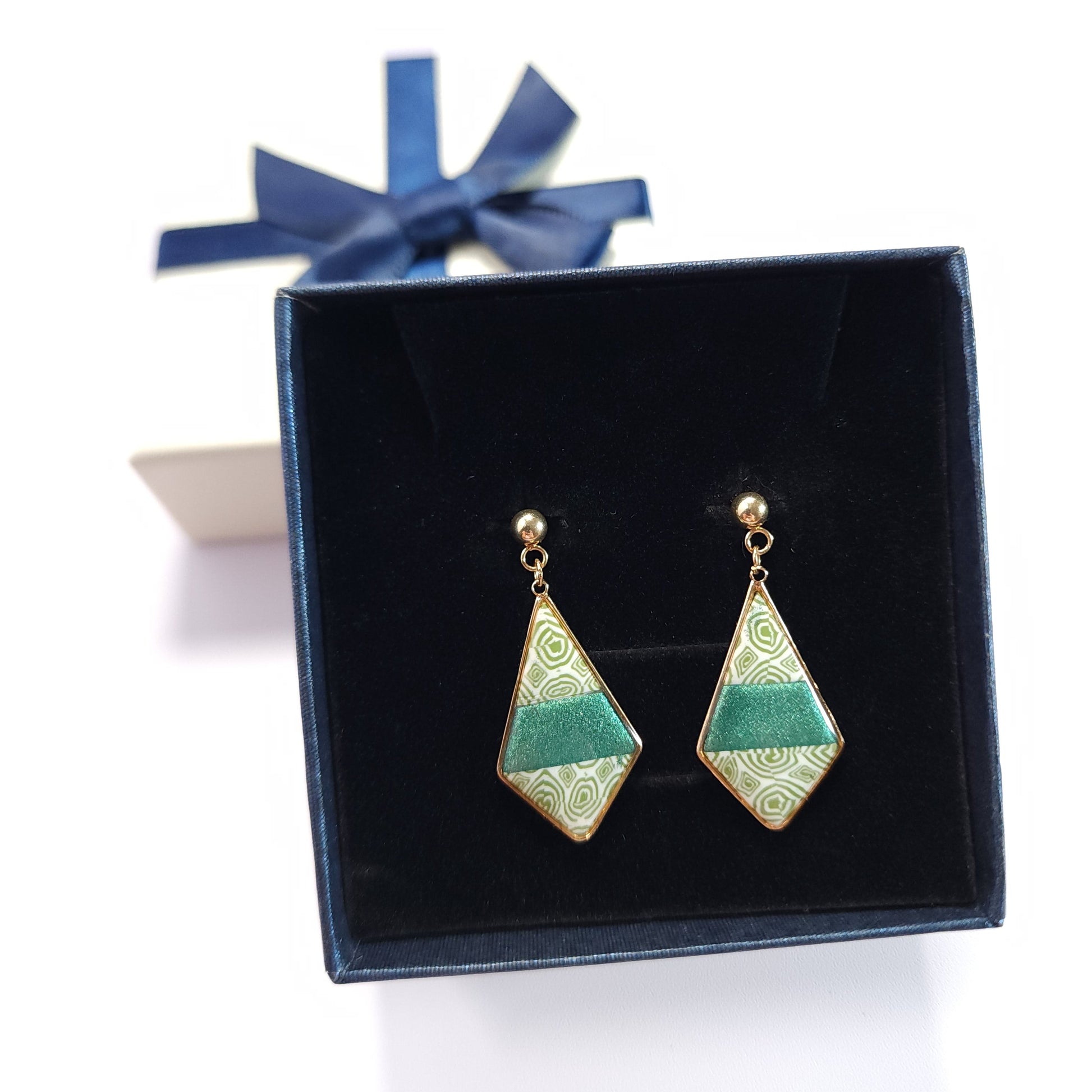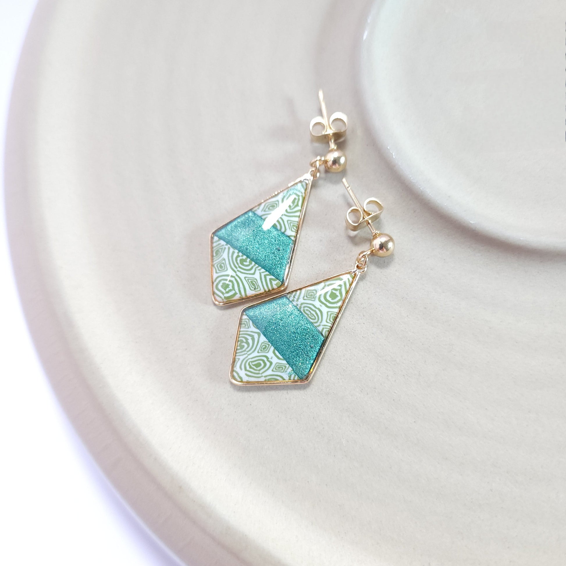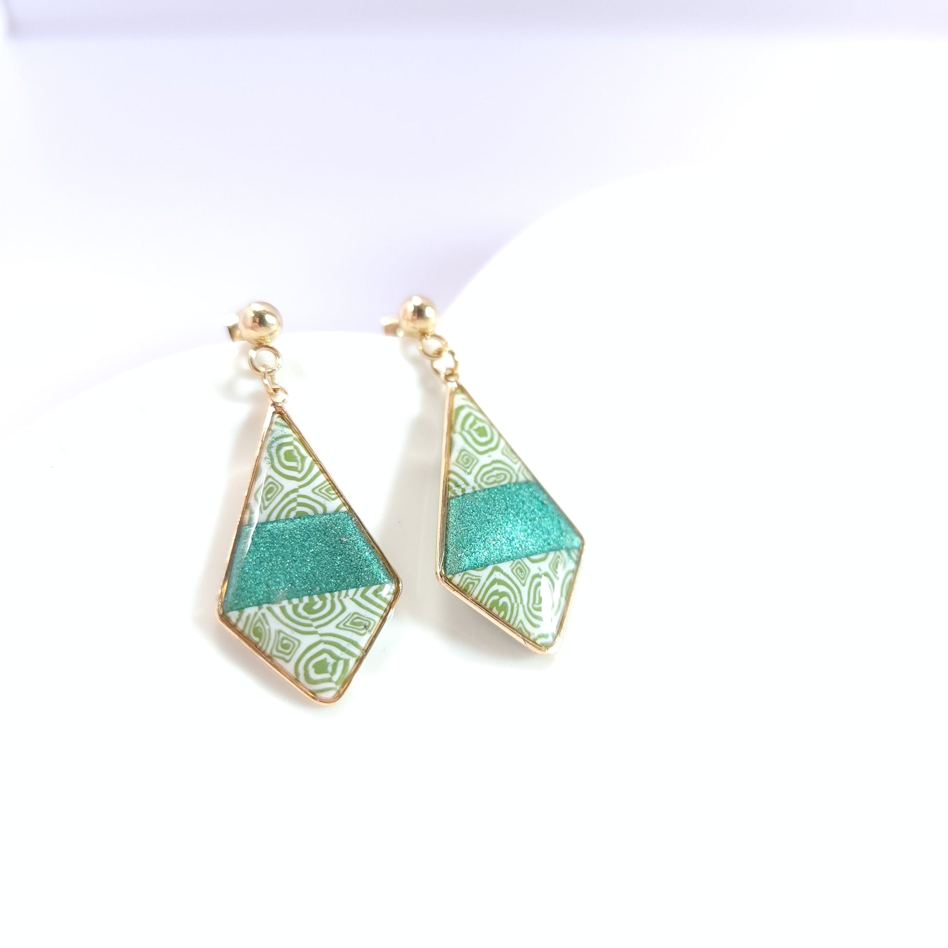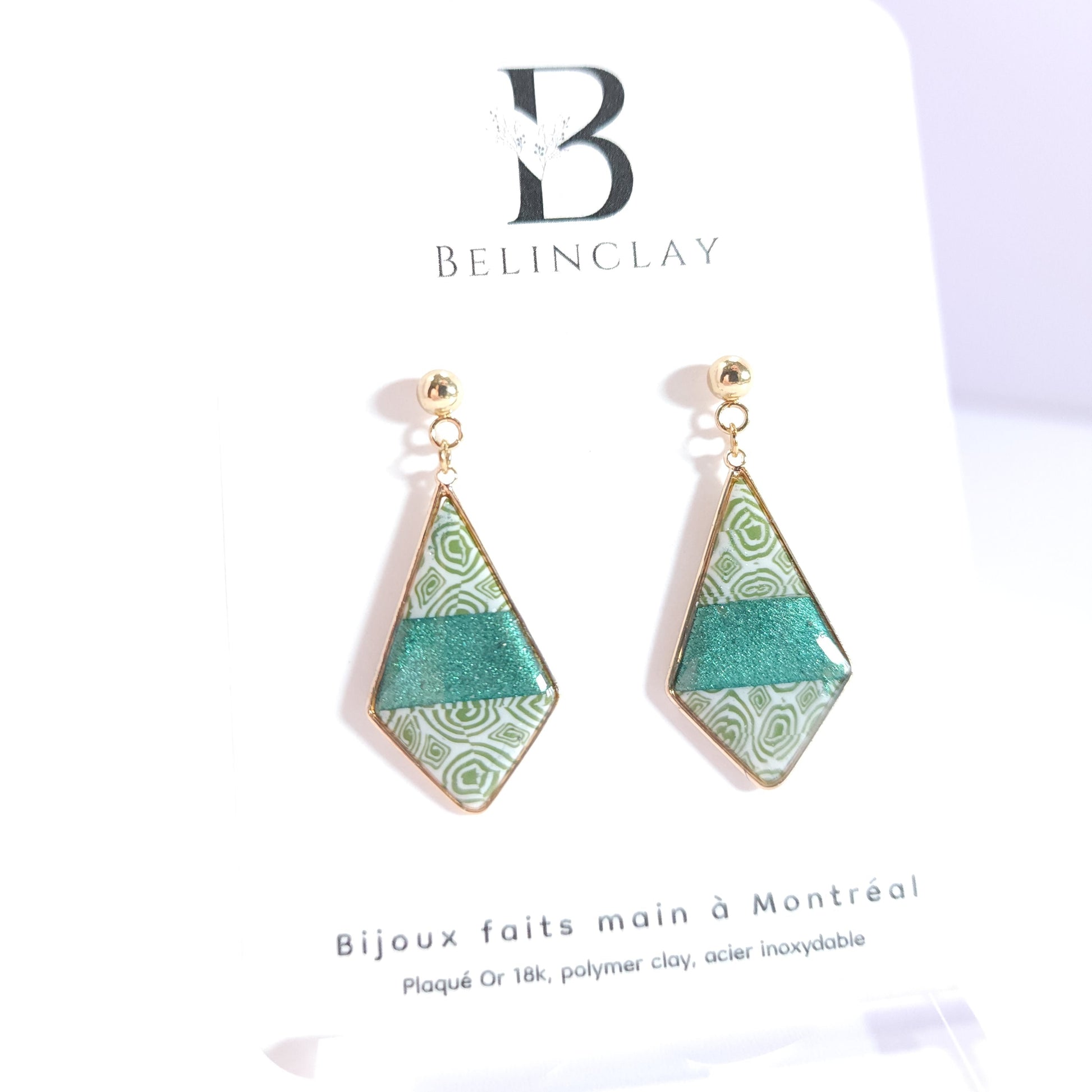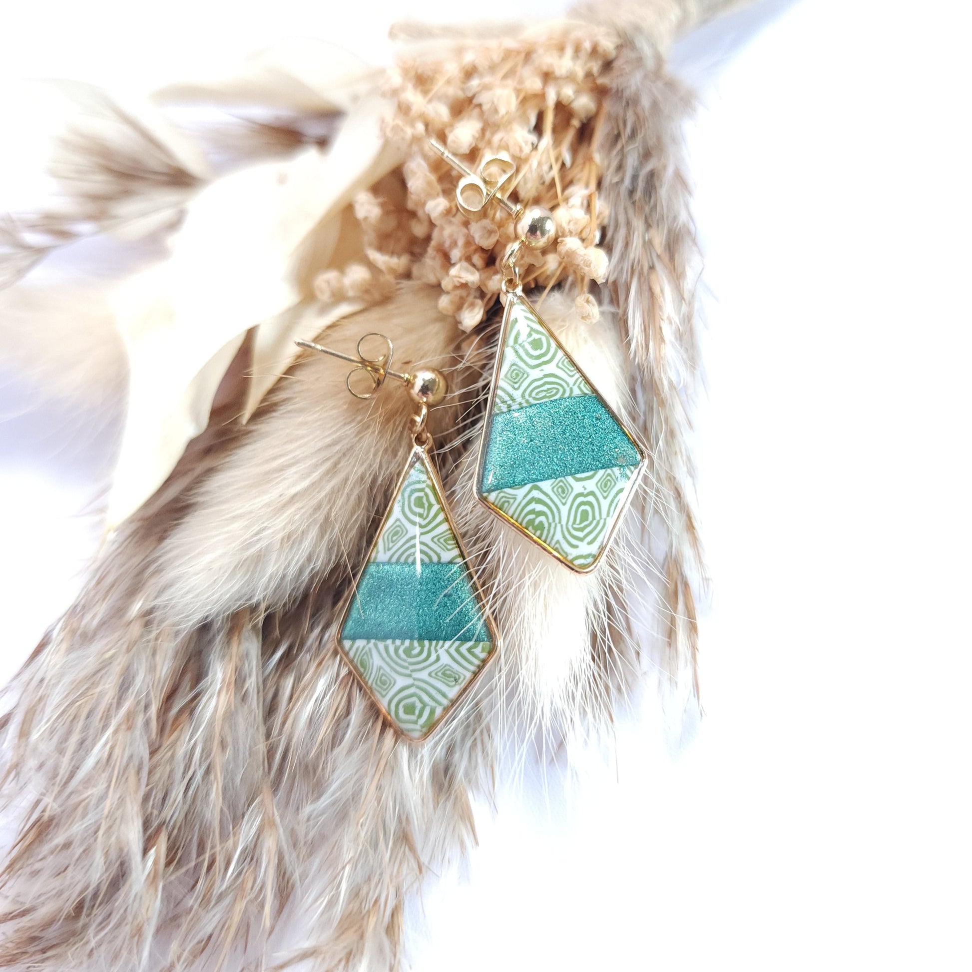 Les boucles Spiralyne se distinguent par leurs nuances douces de vert sauge et de vert émeraude, évoquant une énergie fraîche et délicatement graphique. Le motif spiralé mosaïque vert, entièrement façonné à la main en argile polymère, rend chaque paire unique et empreinte de finesse.